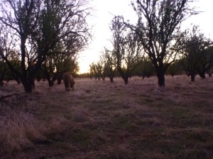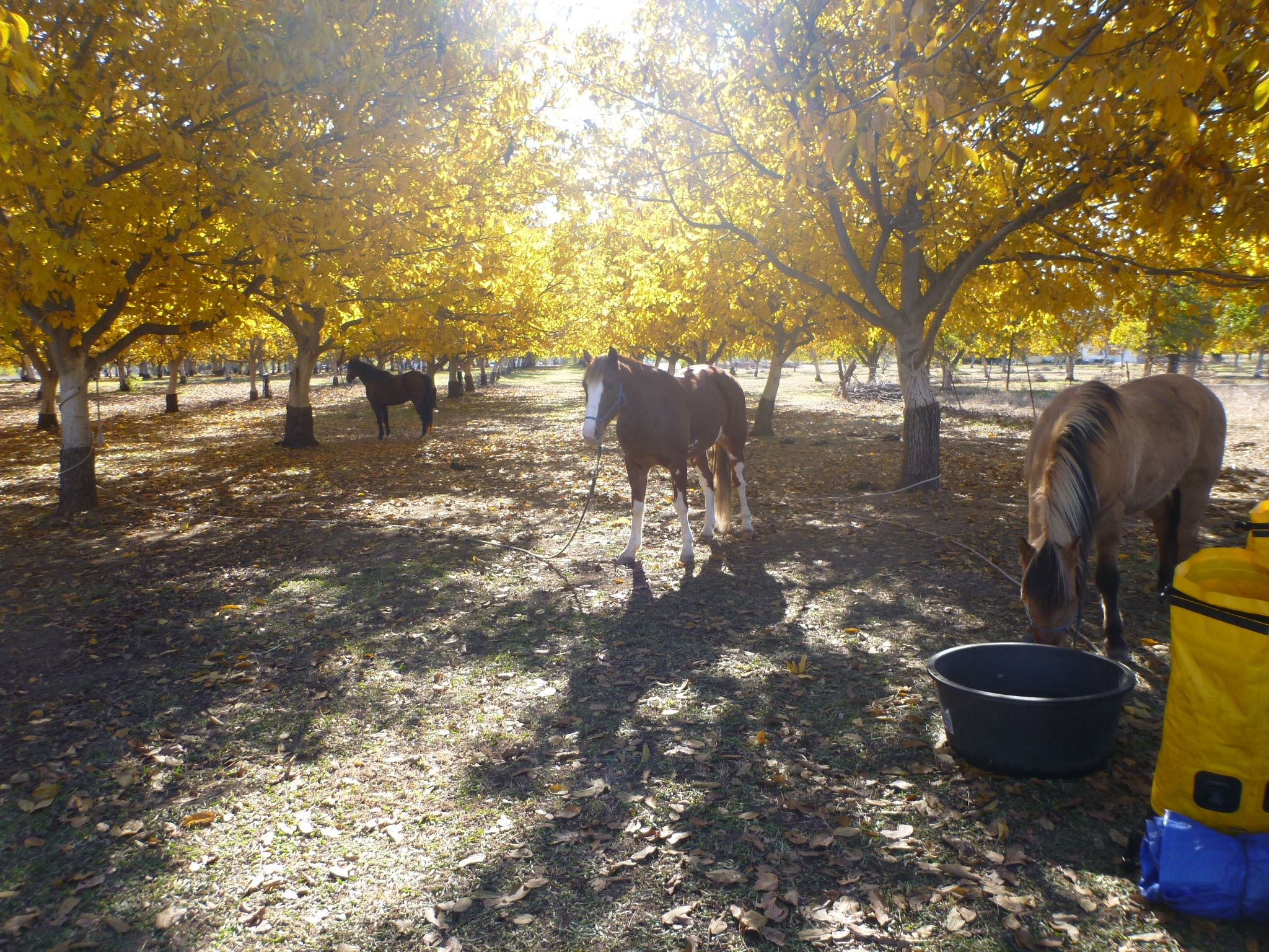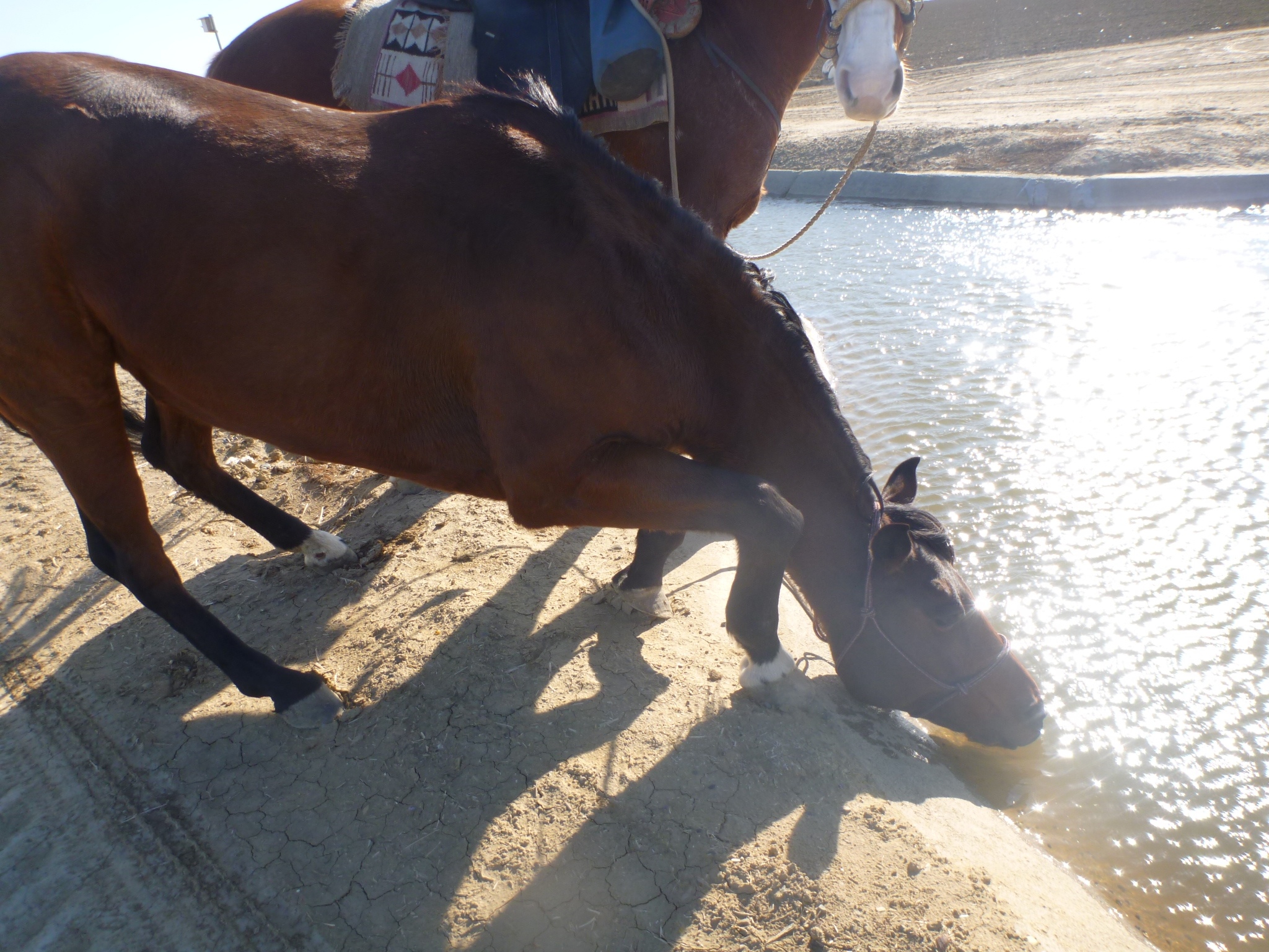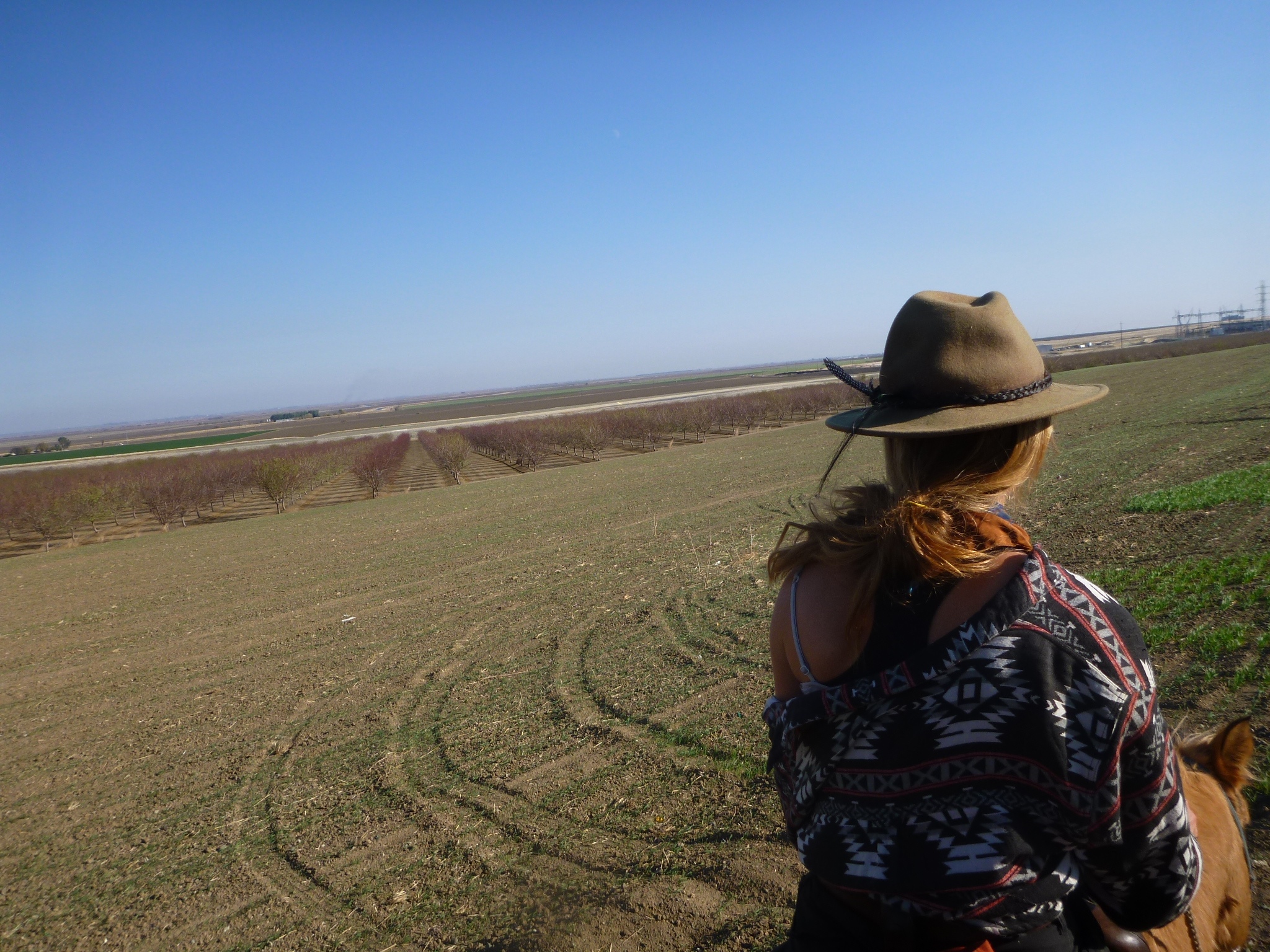 As we’ve progressed down the valley the concept of organic has grown more and more foreign and impossible. Cowgirl drank from an irrigation ditch and got sick and we’ve been warned not to let the ponies glean the edges of the alfalfa fields because they’ve recently been sprayed with some chemical so that the alfalfa won’t grow at this time of year. We are riding along the edges of gigantic fields, endlessly repeating rectangles of almond trees and pomegranates, alfalfa and cotton, tilled fields of emptiness and ditches and canals full of non-potable water (even for the ponies).