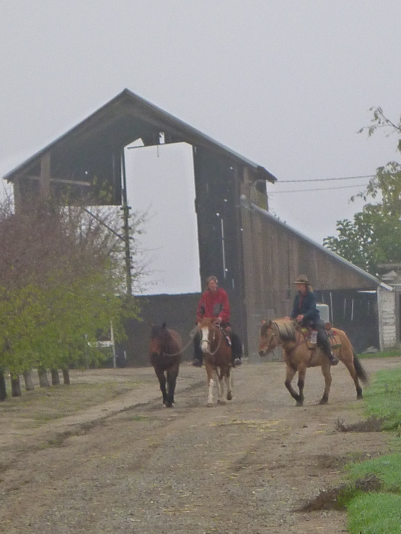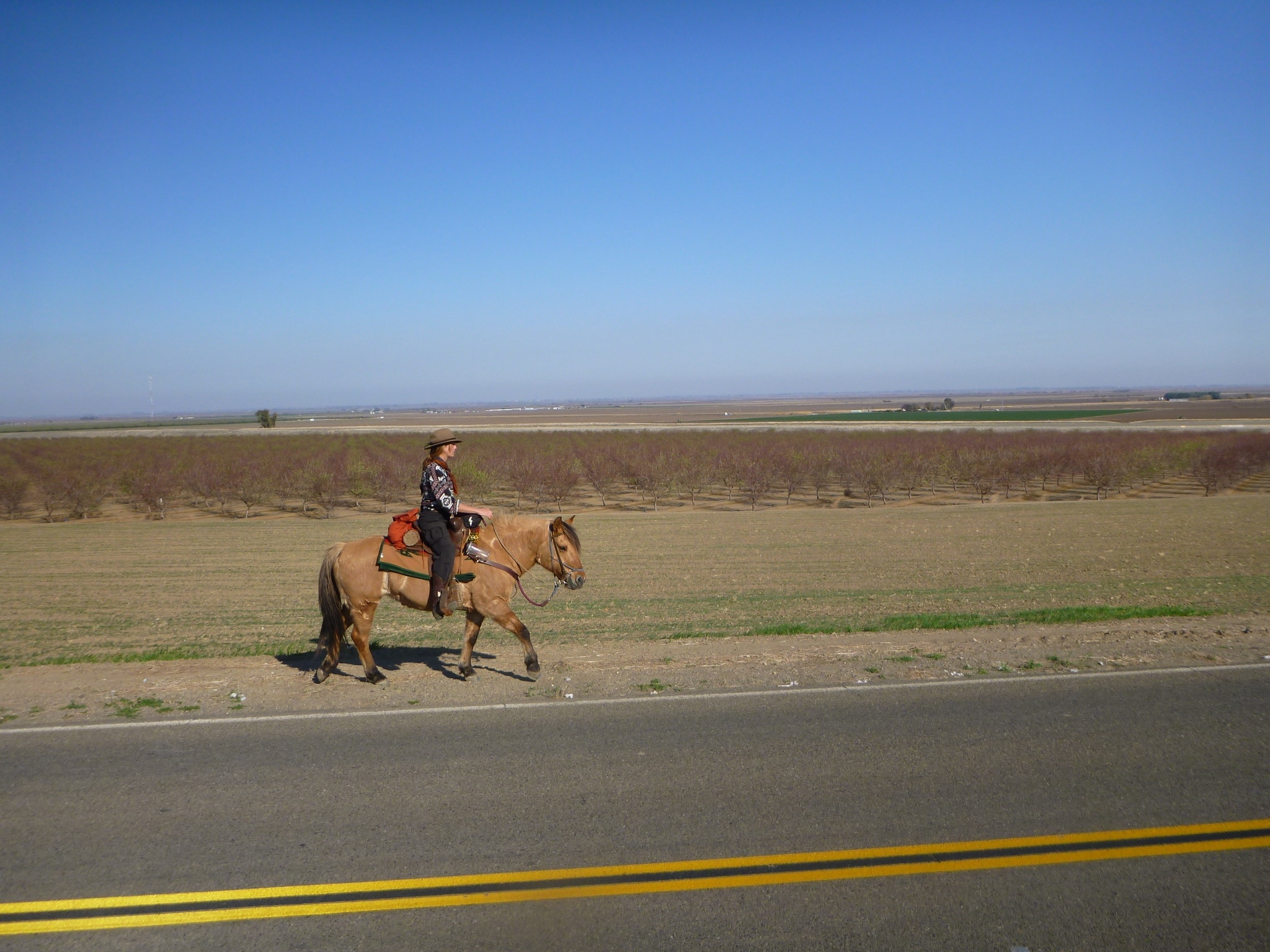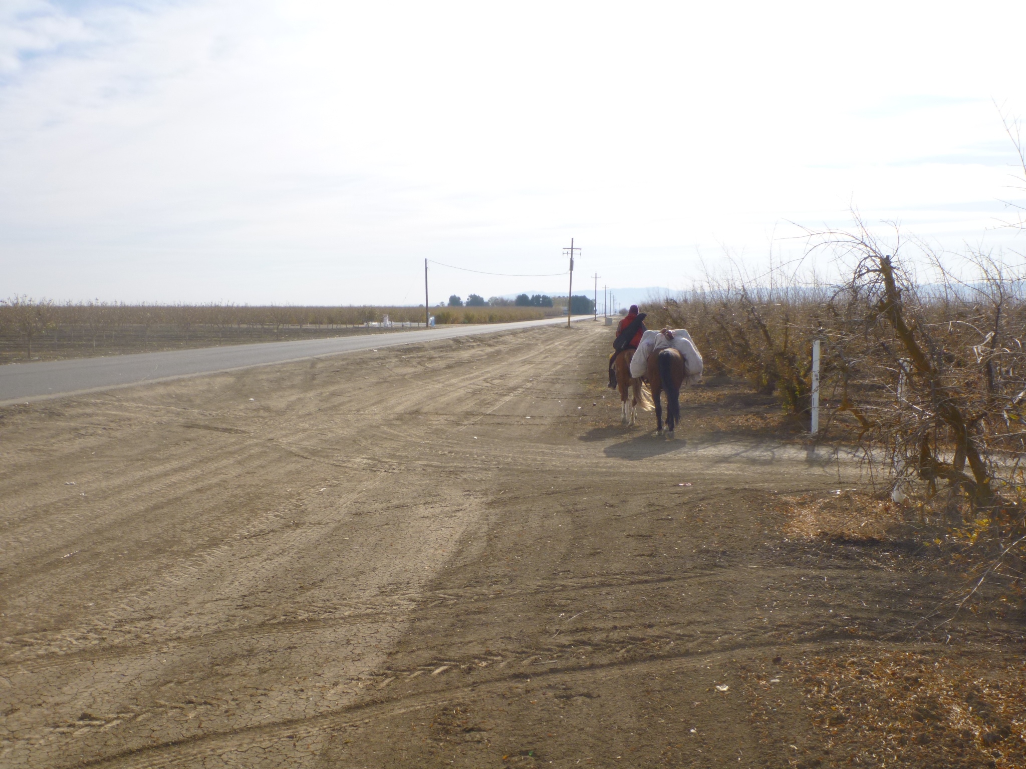 If things are sometimes out of order, it’s because we’re really behind on posting journal entries from the beginning of the trip until the present, but we do want to share them. When those are posted they’ll be dated and we’ll let you know whose journal they came from. Sometimes photos will be added to already posted entries – so scroll back through once in awhile to check. Tonight we’re on the outskirts of San Joaquin, heading towards Helm and Riverdale. The ponies are out back in a cow pen and we’ve been invited in for the night. As the nighttime temps are down in the mid 20*s (F) we are grateful. Days continue to be glorious in terms of weather, and flat and boring and kind of scary in terms of terrain. We saw a sign on the edge of a field today “Congress Created Dust Bowls” and a huge tractor out in that field raising a huge cloud of blowing dust. We are riding through a land of profitable non-sustainability. Water is the issue most often discussed – or more accurately the increasing lack of water. We are asking lots of questions and listening to lots of stories and struggling to put together any cohesive picture. We hope to be out of the Central Valley by Christmas.