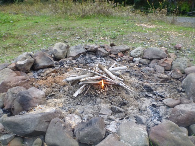 16. Oct. – 7:30p – Cape Horn Campsite. Found a fire ring and wood, considered it tacit permission and made a campfire to cook the last of the spuds for dinner (w/ carrots, onions, cheese and sardines. Morning took too long – didn’t get moving ’til 1:15 again – then had to find the way across the river and onto the logging road – then we realized we’d lost a water bottle back @ the last stop so Jesse and i went back while Gryph stayed with the mares. Finehorn’s pack not as well balanced today as yesterday when S was helping us. We realized we needed to redo from scratch about the time we found Cape Horn and called it a day at about 4pm.