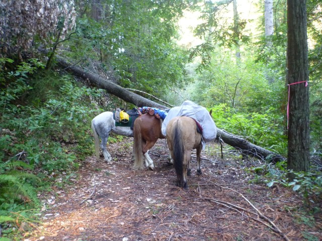 I’m grumpy with the stress and the rope burns on my right hand that even with gloves on hurts when Finehorn tugs the rope (stopping to eat, for example, which is frequent.) Part of the stress is the newness – nothing is routine (except grooming the horses) – we have 12 hours of daylight and it takes 5 hours to get rolling and 3 hours to get camp set up – not much time to make forward progress and then when the way is not clear more time is lost. Part of my issue is that people are expecting us in specific places @ specific times and we’re totally out of cell ‘phone reception so no way to keep anyone posted. 2 days into the trip and we’re 2/5 of the way to the ocean. We are obviously in no way capable of being on a schedule @ this point – and need to stop trying.
