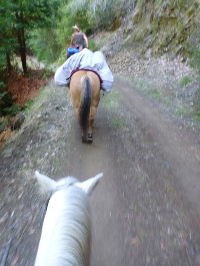 The ponies are tied to trees for the night; high and not too long to keep them from getting tangled in their ropes. They grazed two+ hours as we set up camp, cooked and ate Onions, Beets, Patty Pan Squash, Tofu, Chevre and fresh Ginger. We have entirely too much food. It’s good food. Crossed the Navarro River repeatedly today – generally rocky and shallow, but one crossing was chest deep on Vaca Suerte who led the way bravely with Gryph aboard. Jesse James and i led Finehorn, happy that all our gear is packed in dry bags. The canvas tarp covering our gear is a reclaimed bit off Gryph’s artwork, painted as a tablecloth for Thanksgiving dinner last year in Boulder, used to wrap my massage table for the trip west, hung in the teepee for the summer – Finehorn wears it well. For the most part the horses have been sleeping since it got dark and we tied them to the trees. Now they have woken up and are restless. I went out to check on them and they each whickered to me in turn. This will take some getting used to – for all of us. The woods are Loud! Frogs and crickets and owls and birds we can’t identify.