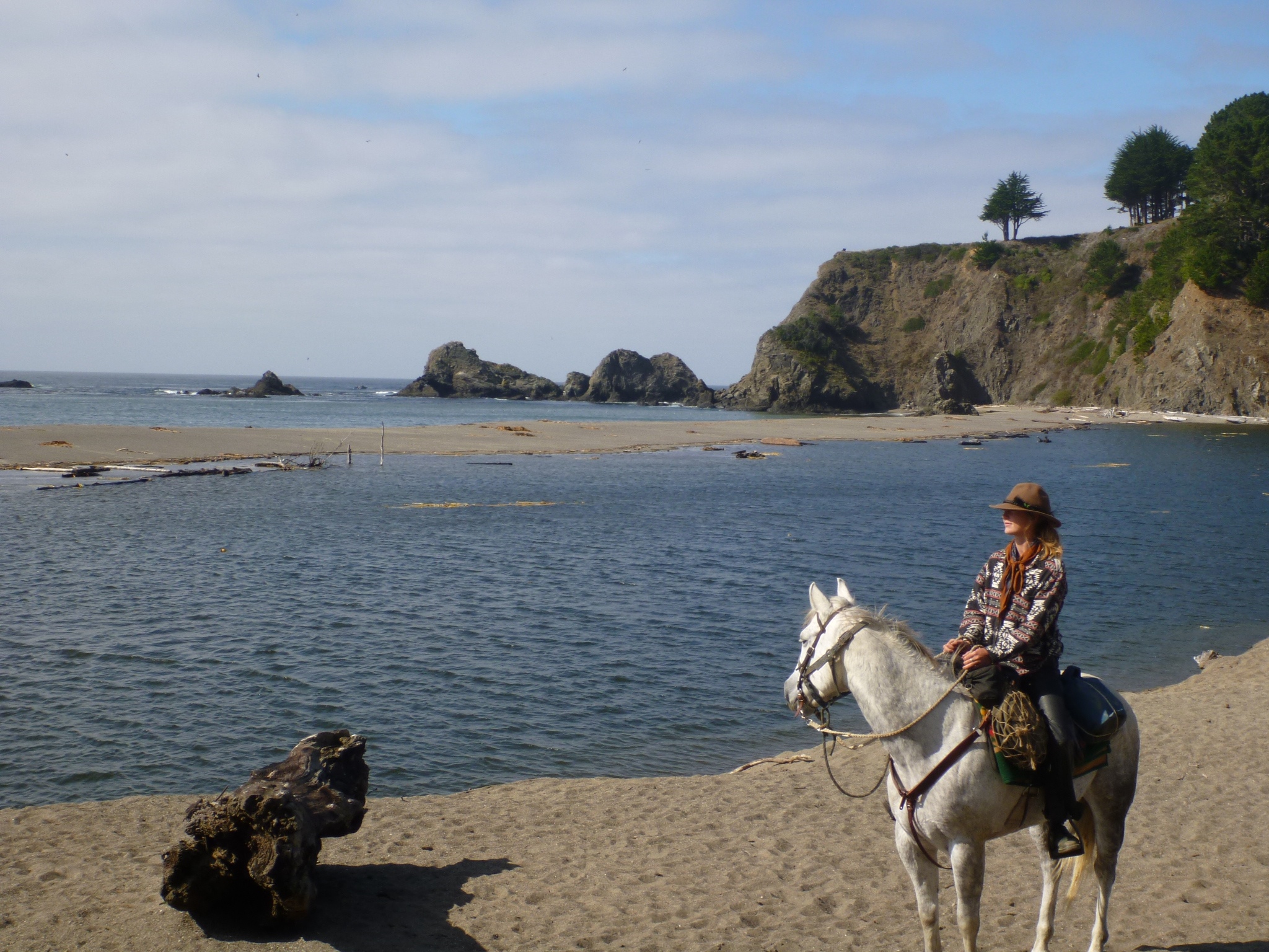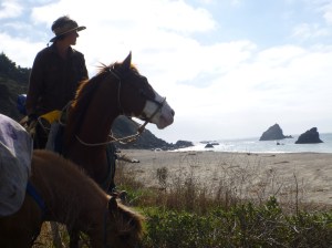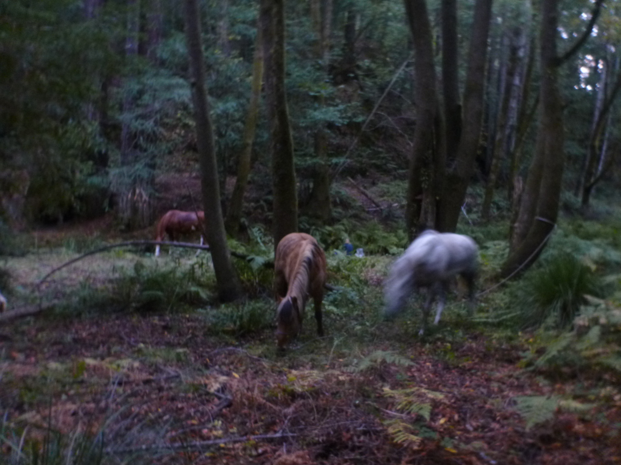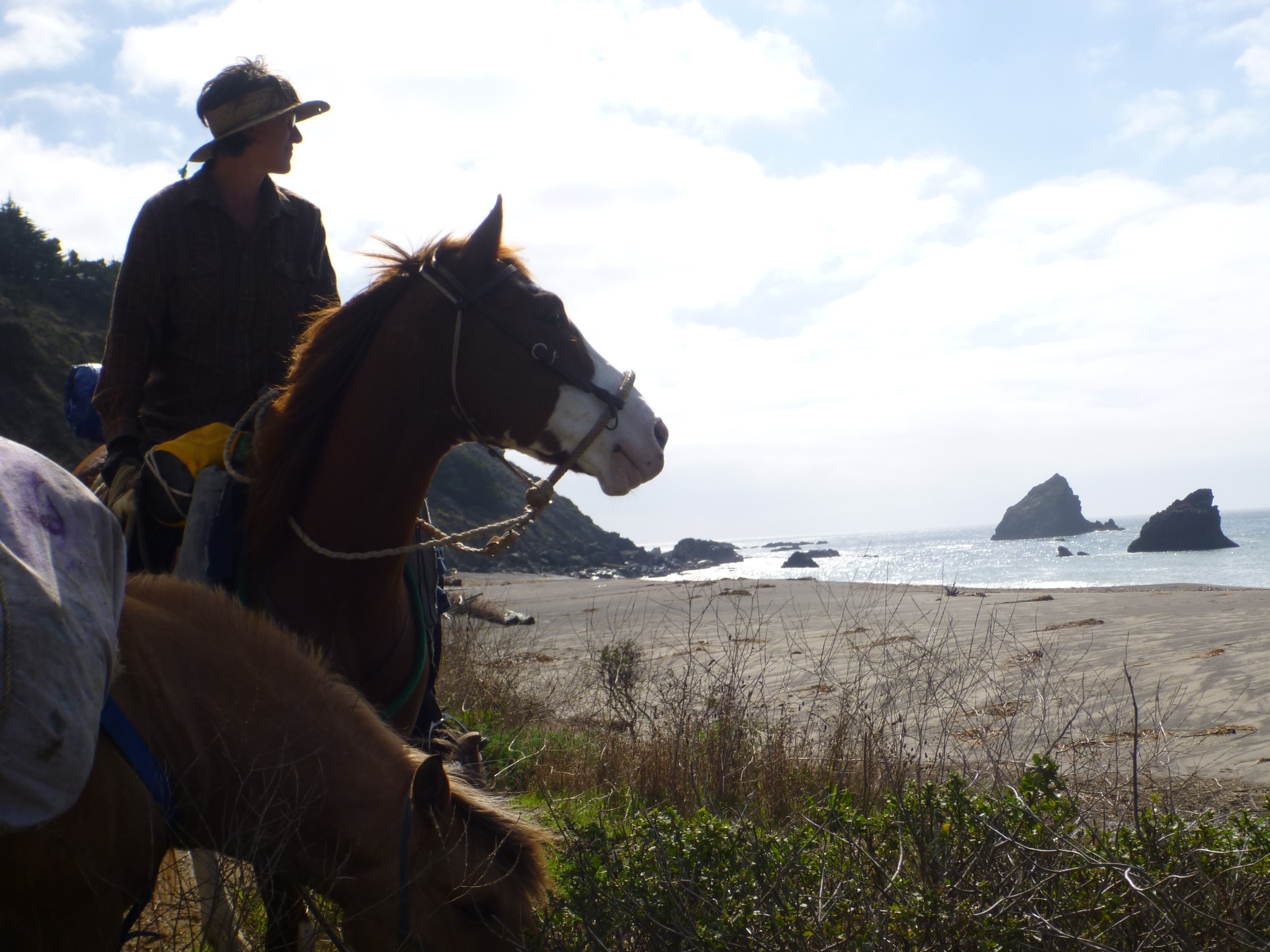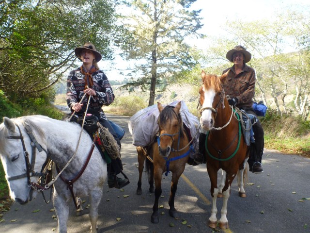 18. October – Another crazy day. Last night’s camp was only 1/2 mile or so before Dimmick. Less than 6 months ago Gryph and i took a canoe down the Navarro River from Dimmick to the Ocean. Today, less than a mile past Dimmick there were big trees down across and in the river – rendering it impassible. We tried. There was no discernable road south of the river, 128 was close and scary with traffic to the north – back and forth through the river trying to sort a way through. Jesse lost a boot and i went all the way back to camp trying to find it to no avail. I put a rear boot on his front hoof, grateful that he’s the same size front and back. Long stretches of belly-deep river were hard on Finehorn – deeper on her and the packs ride low enough that they were displacing water and dragging on her. She was brave, but is really tired tonight! Finally we returned to Dimmick, summoned all our courage, and rode along 128 until we found an MRC road heading back towards the river – rode around the gate, back across the river and finally found our trail. Gryph and Vaca Suerte did much better today, after a bad morning – Vaca refusing to stand tied, breaking a D-ring off the saddle in her fidgeting and crashing about – she finally settled down and by the end of the day she and Gryph were ponying a flagging Finehorn.