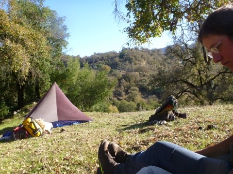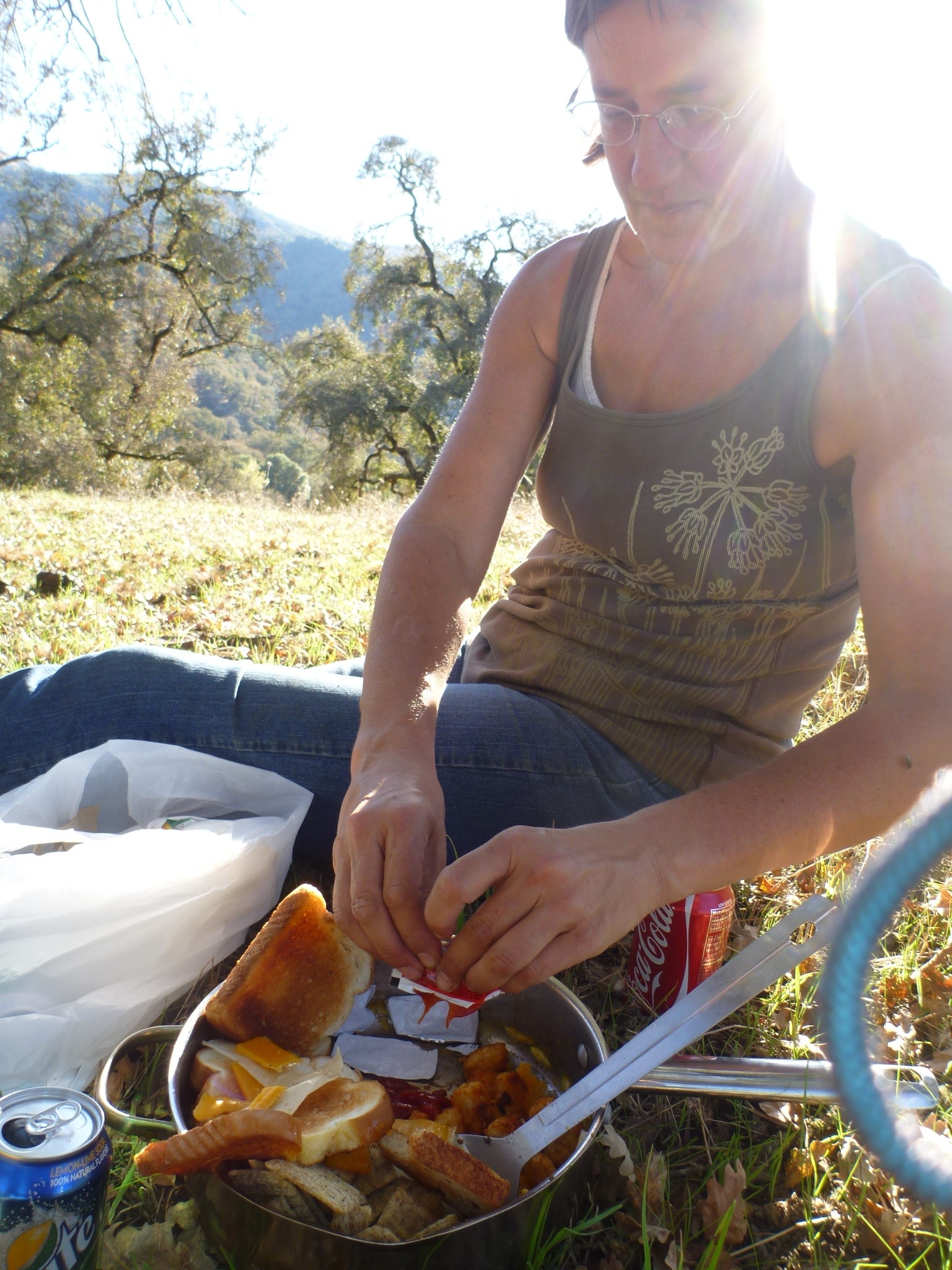 After we got the ponies untacked and tent set up, the first thing we did was sit down in the sun and rummage through the food bags to find something edible…not much there. D had gone off to find grub for the ponies, so we waited, tired and not knowing what step to take next. Suddenly, a figure appeared on the distant hills- we got up to meet this person, and found him to be a cute guy bringing us a skillet full of potatoes, scrambled eggs, toast and cheese! He also handed us chips and sodas- hill service. We thanked A for his graciousness and good timing, then he turned around and vanished as quickly as he’d appeared.