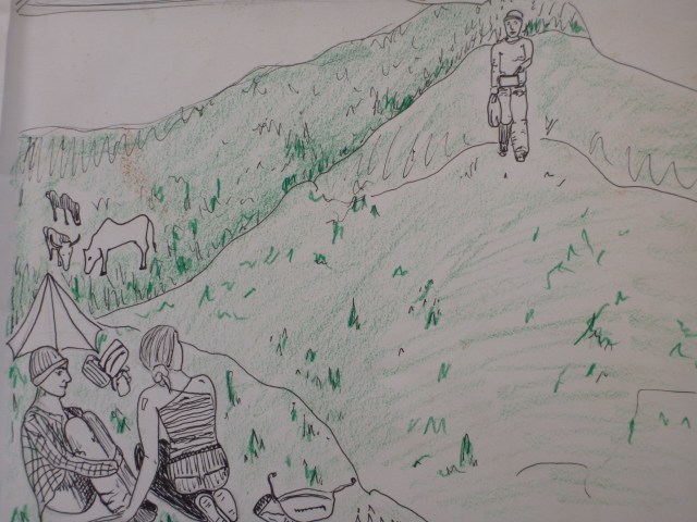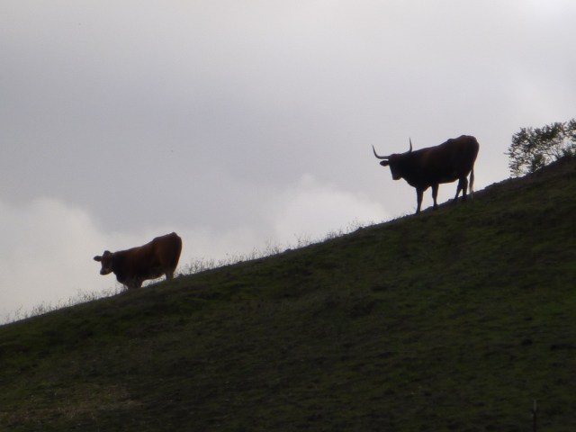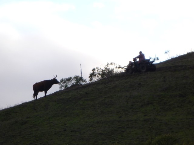 The tent is on the only flat spot amongst hills so steep that we find ourselves walking vertically, out of breath, to try and get anywhere. On a search to find the water trough, we found fenced in plots of very fragrant plants…Little did we know, this raggy shaggy little man bounces around like a pingpong ball between growing enclosures scattered all around his land. Also a strange pond covered with algae, 6 roaming cows and 1 black bull glaring with red eyes. A crescent moon cratered in the hills across the way, watching us all the while.