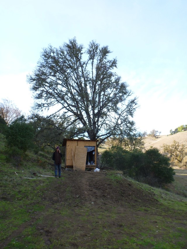 Thursday Nov 3rd Today I can feel winter here for the first real time. The rain this morning, cloudy silver skies, chilling wind, and the trees bursting into flames down State st. in Ukiah. So individually breathtaking, these flames licking out of deep mossy undergrowth. I went to Ukiah for a provision run with A this morning, feeling surreal in the bustle of the city world. Looks like we will be here throughout the weekend-another 3 days and hopefully no more- when will Bacca heal enough to press on-?-the question. The strangeness of the hillbilly haven, with a wandering herd of seven cows, and the bull i had to cross on the tiny ridge on the hill. He is gentle though. And, now moved into the tiny not-quite-plyboard drying shack on the hill, we wait. It doesn’t count as lingering as we have no choice.