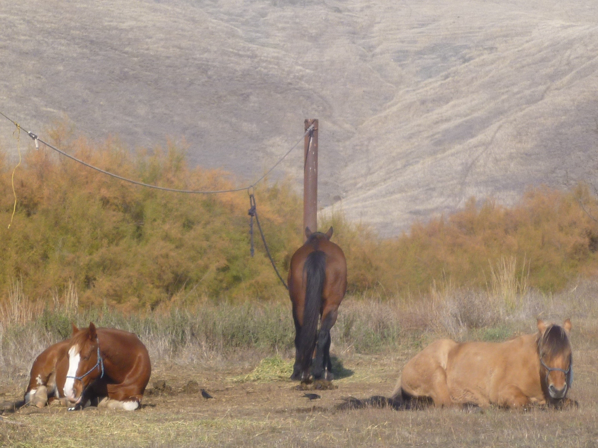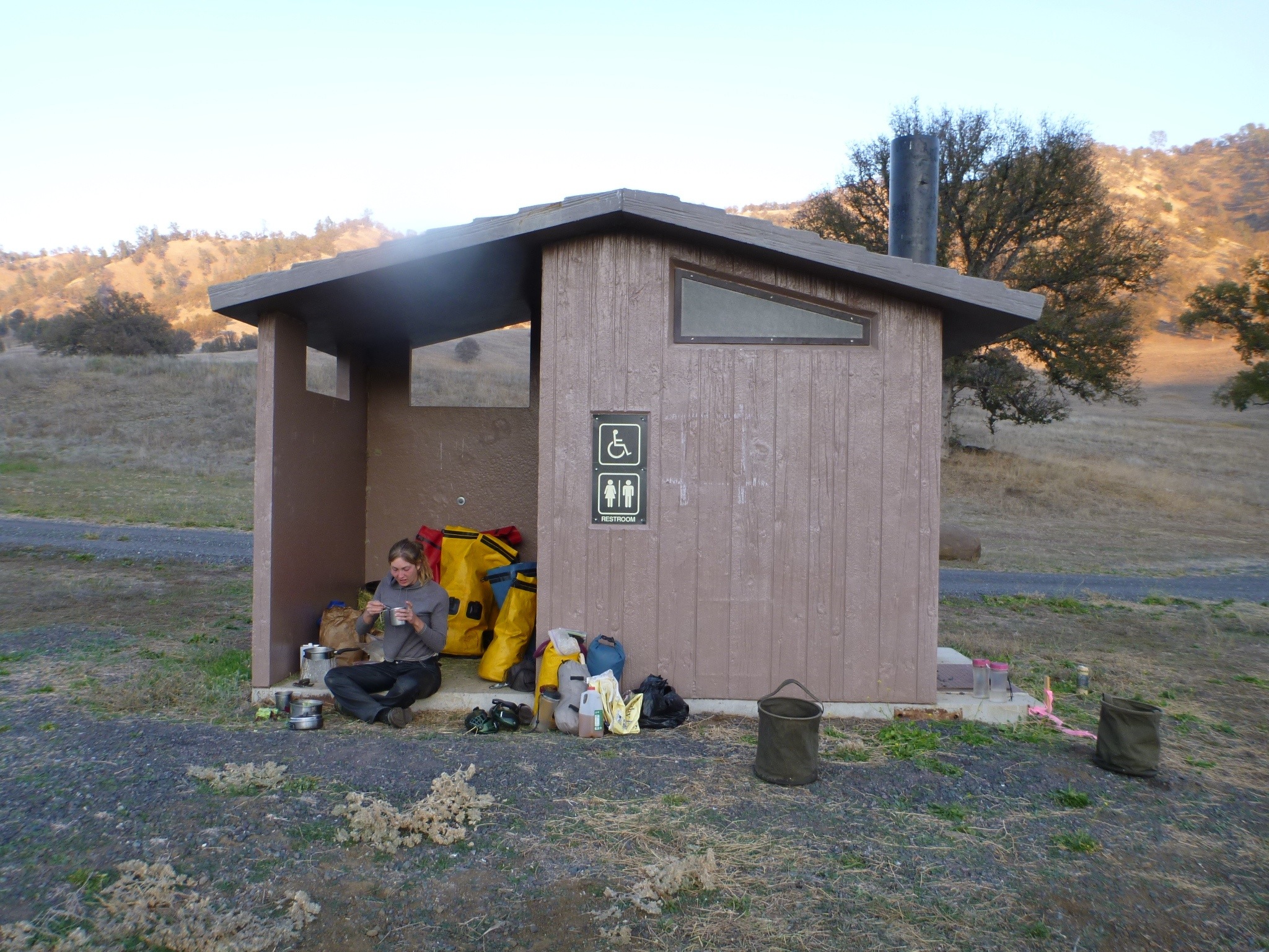 The nearest town is 15 miles away. The moutains are bare and dry. Tule elk are about the only thing living around here, and we haven’t seen one yet. There are several invasive species, including the golden star thistle that is poisonous to horses and gives them something called ‘chewing disease’. We came here hearing from several different people that there were corrals and running water, neither of which we found on arriving a half hour ’til sunset last night. So we hitched our ponies to metal posts, brought up water from the river, and camped in the cement box with pit toilet we call the loo. It does not smell in here, we made our bed on flakes of hay that we will need to feed to the ponies- yes, tomorrow the ponies eat our beds.
