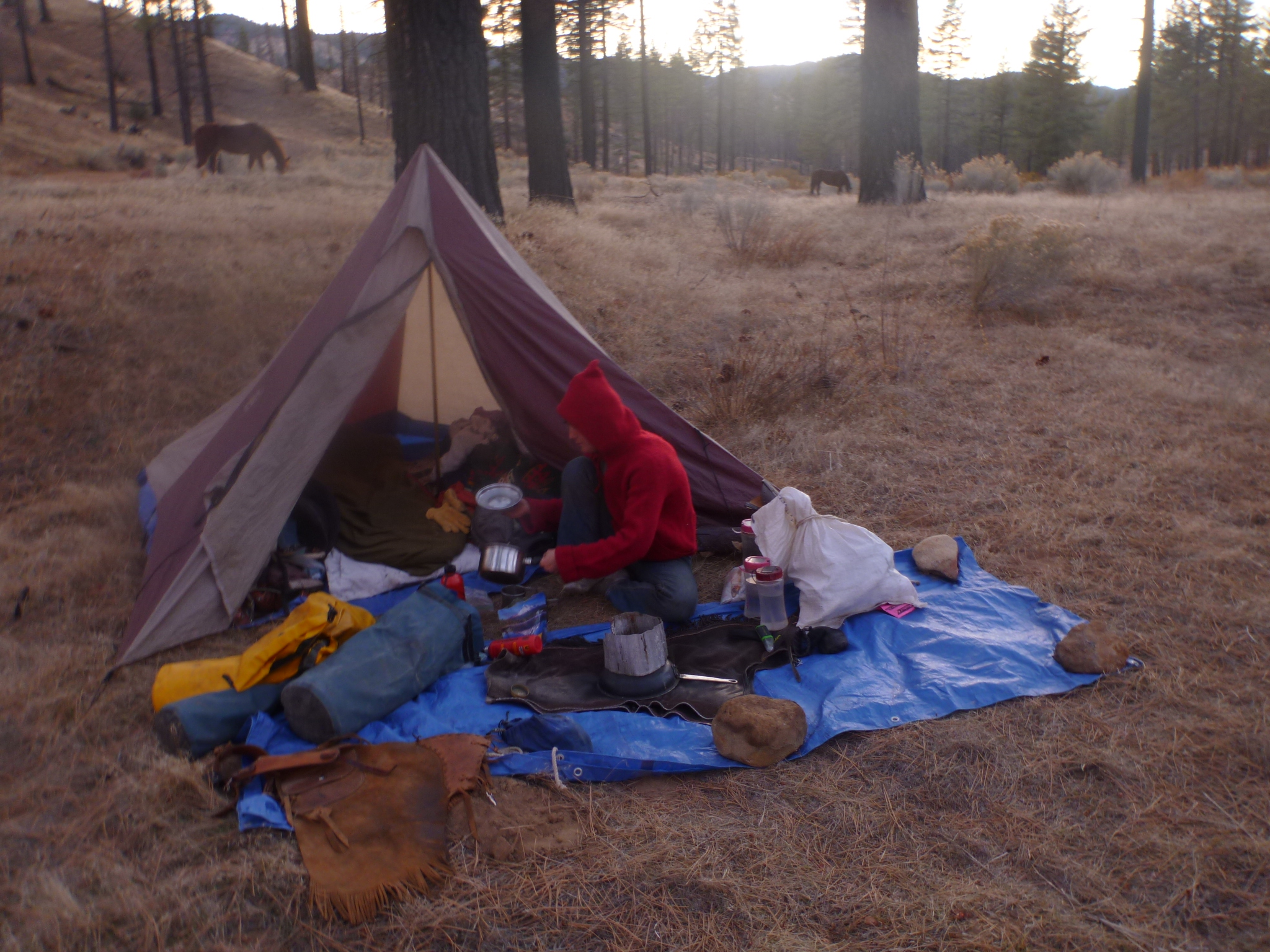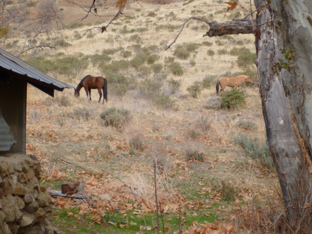 We’d been in at Willets Hot Springs for a week, supplementing the graze with a bag of alfalfa pellets we found, partially eaten by rodents, in the “bunker” (a cement room with a steel door which we were using for our food storage), when Finehorn colicked. Colic, aka tummy ache, is a serious situation in a horse. Horses lack the ability to vomit, so anything that goes in has to go through, and if they roll on the ground to try and ease the cramps they can twist a section of their intestine so that nothing can pass through. We hadn’t packed Banamine (a muscle relaxant) or a vet. We started walking with Finehorn, listening for gut sounds (a healthy horse Always has gut sounds) and offering her water. She was sweating and uncomfortable, obviously wishing we’d just leave her alone, but we kept walking her, not knowing what else to do. We’d found a 1/2 bottle of Wild Turkey in the cabin and had a 1/2 bottle of Olive Oil; we’d go old school if it came down to that, but after a few hours she passed some dark green stinky piles and rapidly returned to normal. Of course, we know Finehorn is sensitive to alfalfa – and here we’d been feeding her compressed alfalfa – no wonder she got sick! Lesson learned – and cheaply at that.