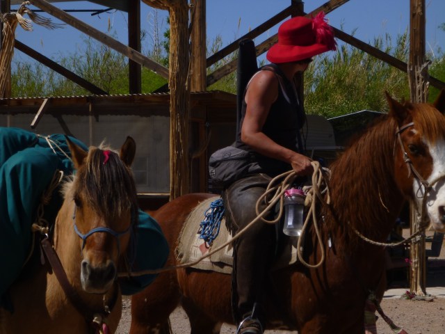 I must admit that I was feeling less than fully confident as I rode out of Tonopah with Jesse James and Finehorn – but without Gryph and Daisy and Cowgirl.  Even my spectacular new hat didn’t quite make up for feeling like we were moving on as half a herd.  How would people respond to me, traveling “solo”?  What had Gryph been saying to people when she knocked on their doors and secured us a place to stop for the night?  How was I going to get supplies without leaving the ponies alone?  So much of the trip has been based on teamwork – and we’d learned a lot about how to make things work for the 6 of us in terms of daily routines and protocols over the 5+ months on the trail.