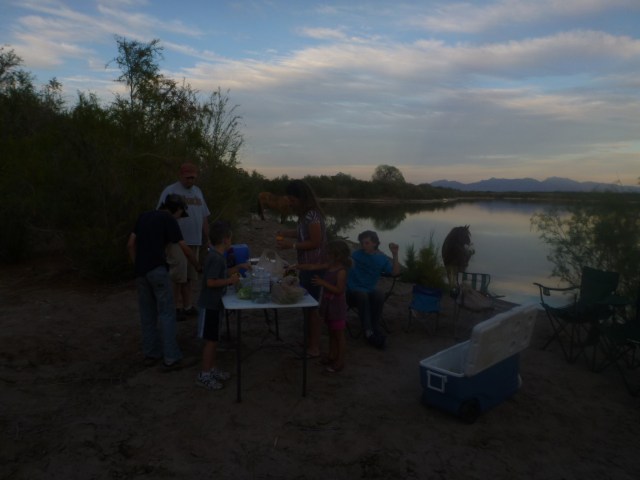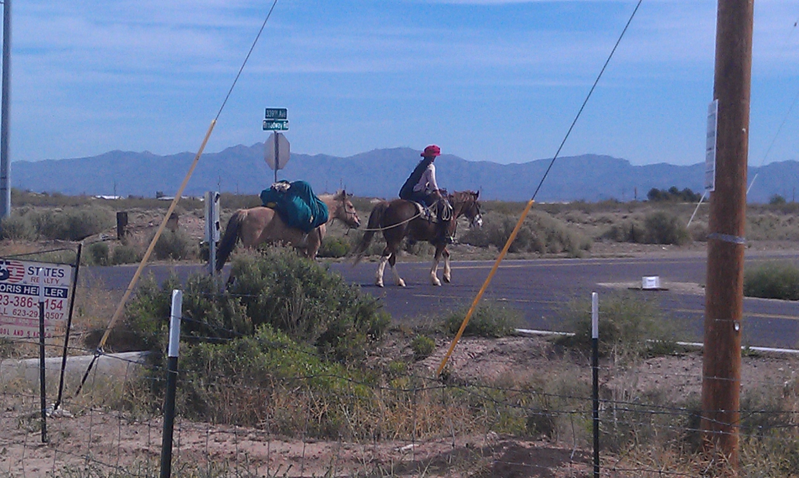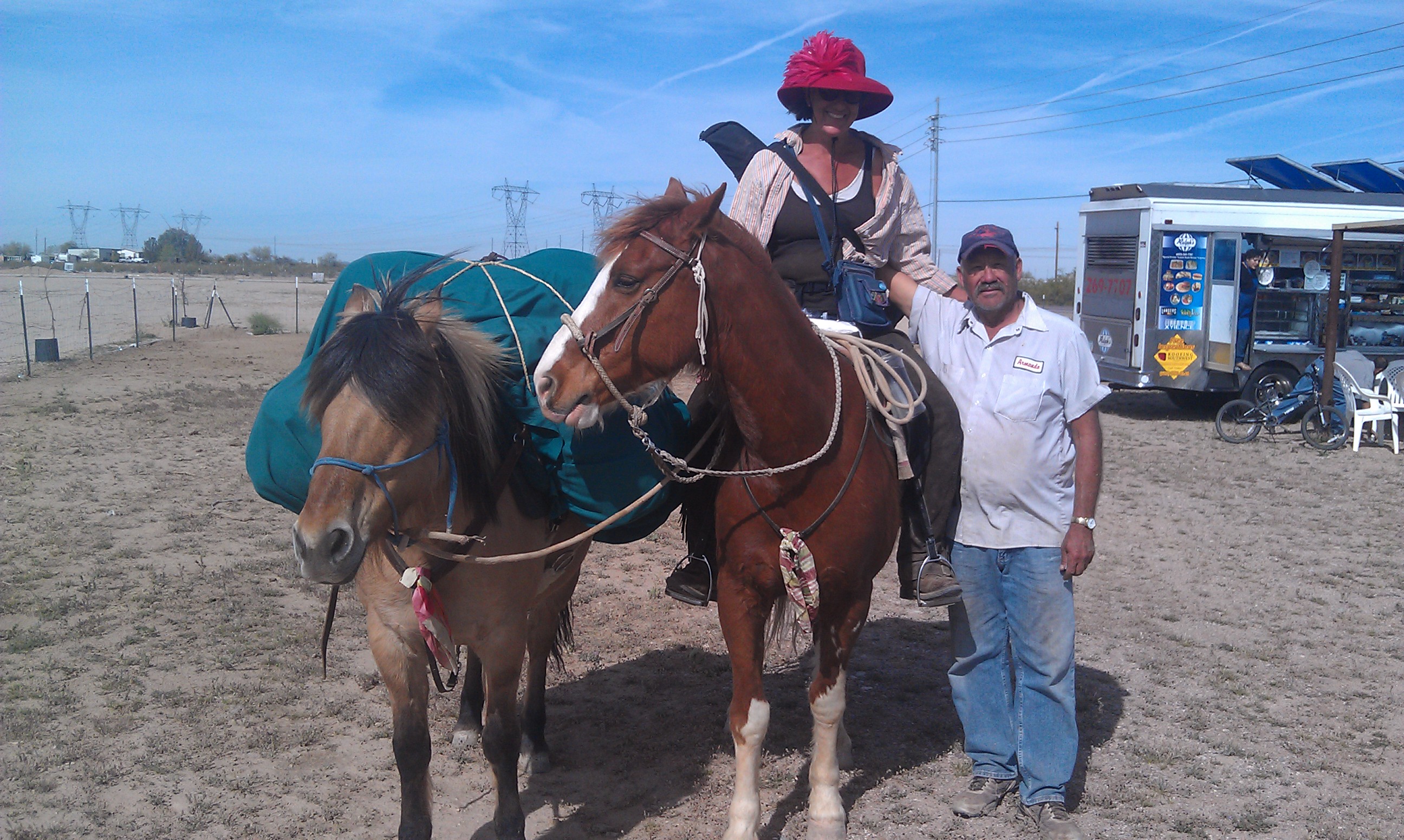 The next day I had reason to be grateful that my siblings are on Facebook!  I had gotten a pretty intense sunburn on my south arm and was in need of a light weight long sleeve shirt so I called my long-armed brother (who used to live in Phoenix) and a man that he knew from Food for the Hungry (in Bolivia) offered to drive down with his daughter and bring me a shirt and some sunscreen.  AND an unschooling family that my sister “knows” on-line were coming with a bale of hay and a picnic.  I rode past a very fancy equestrian center and rodeo grounds in search of the Gila River – which I could see on the map, and planned to follow through the next stage of my journey.  As I rode around some graffiti’d barricades a man in a white pick-up truck passed me.  I waved, trying to signal him to stop.  He half-waved back and kept driving.  I came around a bend in the road as he pulled up next to another big truck.  A large hispanic man emerged from the other truck.  The man who had passed me turned out to be a small asian man.  They were both wearing bullet-proof vests and had multiple guns and seemed to have plenty of ammo.  I tried to act normal and asked if they knew the area.  “No.”  “Do you know how far it is to the river from here?”  “It’s a long way – you should turn back.”  They didn’t have to tell me twice – this was obviously no place for a family picnic!  I rode back to the equestrian center and asked an equestrienne if she knew of a place I could camp with the ponies for the night.  She directed me to a near-by lake (which wasn’t on the map!) and I followed her directions – and then called my visitors to let them know where to find me.
