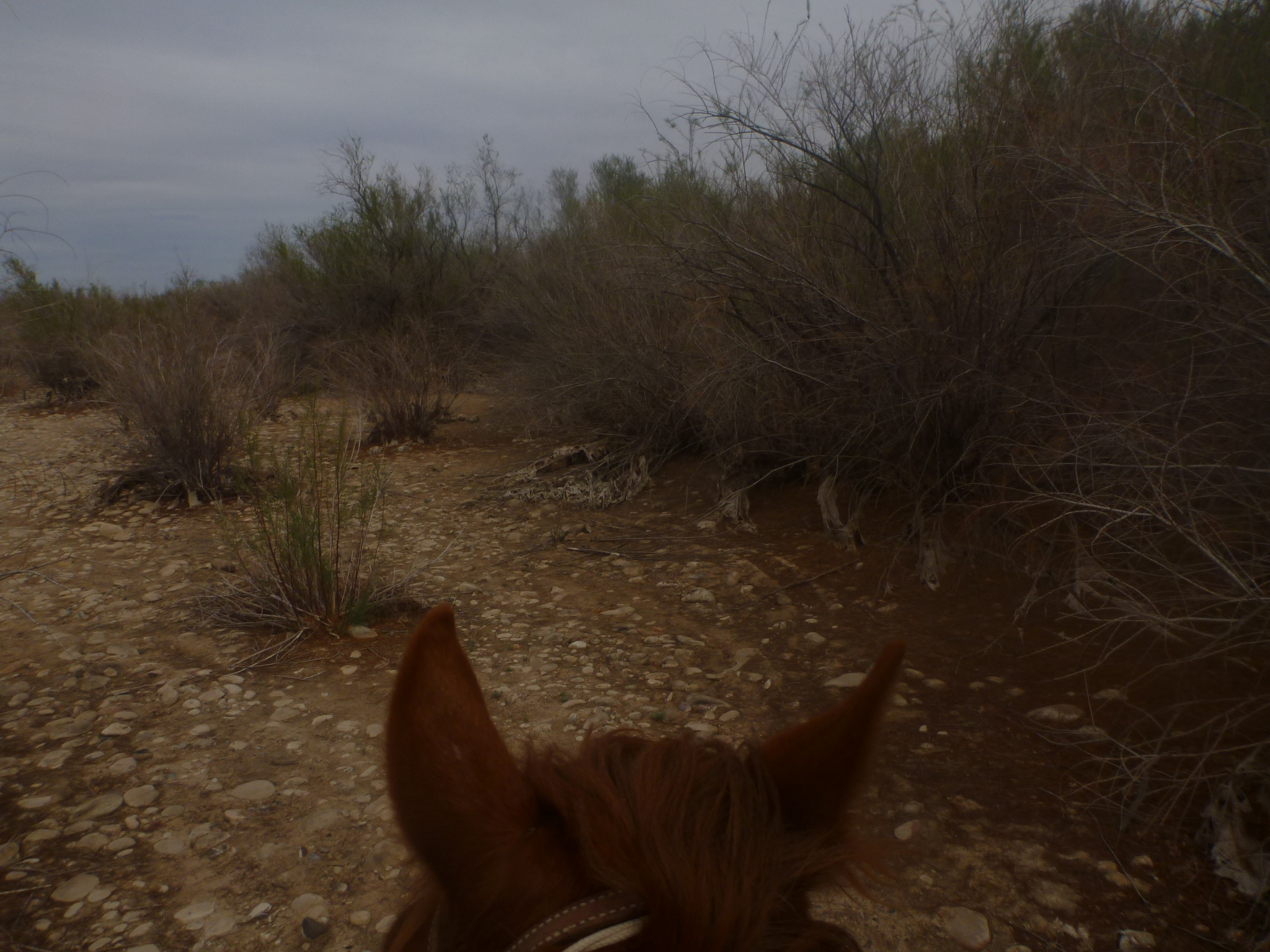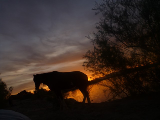 My first night out I got told “no” 3 times before I finally found a place to stay.  That had never happened before!  But the place that said “yes” was a really good stop – 3 generations of Mexican men at Silverado Ranch took me in and treated me like family – feeding me pork from a pig they’d raised themselves and sharing stories into the night.  The ponies shared a pen and alfalfa with some goats, I enjoyed a sheltered camp spot and coffee and breakfast in the morning.  There was joy in my heart as I rode down the lovely Hassayampa Wash.