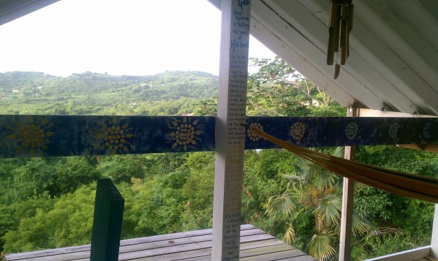 Interested? Read on. The casita isn’t everybody’s idea of a dream vacation – but if you’re comfortable camping it’s pretty sweet. The basic deal is simple -> a free place to stay in exchange for being a “security presence” and doing Something while you’re there to make things nicer for the next person. The casita is 16’x20′ – there’s a ladder leading upstairs to the bedroom – Q bed (with mosquito net) hangs from the ceiling. The casita is off-grid – no electricity. There’s a propane stove/oven – please make sure there’s propane for the next person when you leave. 1000 gallons of rain water are stored in cisterns – a hand pump brings it up to two 55 gallon drums (one outside painted black for warm water) – from there it’s gravity feed to the sink and shower. Grey water is caught in 5 gallon buckets to flush the toilet and water the plants. Living at the casita is Physical. The nearest store is 1/2 mile Down Hill. If you want to keep food cold you’ll need to bring ice for the ice chest back Up Hill 1/2 mile. The view is amazing – over rolling hills to the ocean – and the island of Culebra in the distance. Downstairs is an 8’x16′ deck – upstairs is a balcony that’s 8’x5′. The downstairs windows and doors can be locked – the upstairs is open to the view. When it rains and blows you’ll stay drier if you move the bed downstairs.