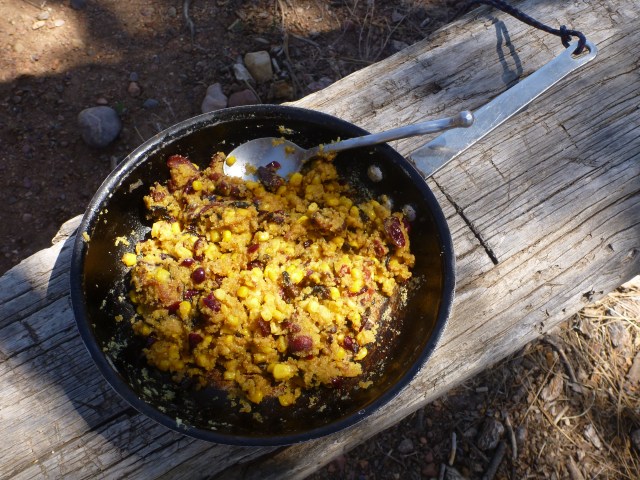 It’s done when it’s mostly “dry” – but you’ll be able to push it together and it’ll stick to itself. It’s a different sort of texture than most USA food – but I like it! This serves as a main meal for two cowgirls. I discovered today, making it for the first time solo, that the leftovers (saved in a ziplock bag) are quite tasty at room temperature later.
