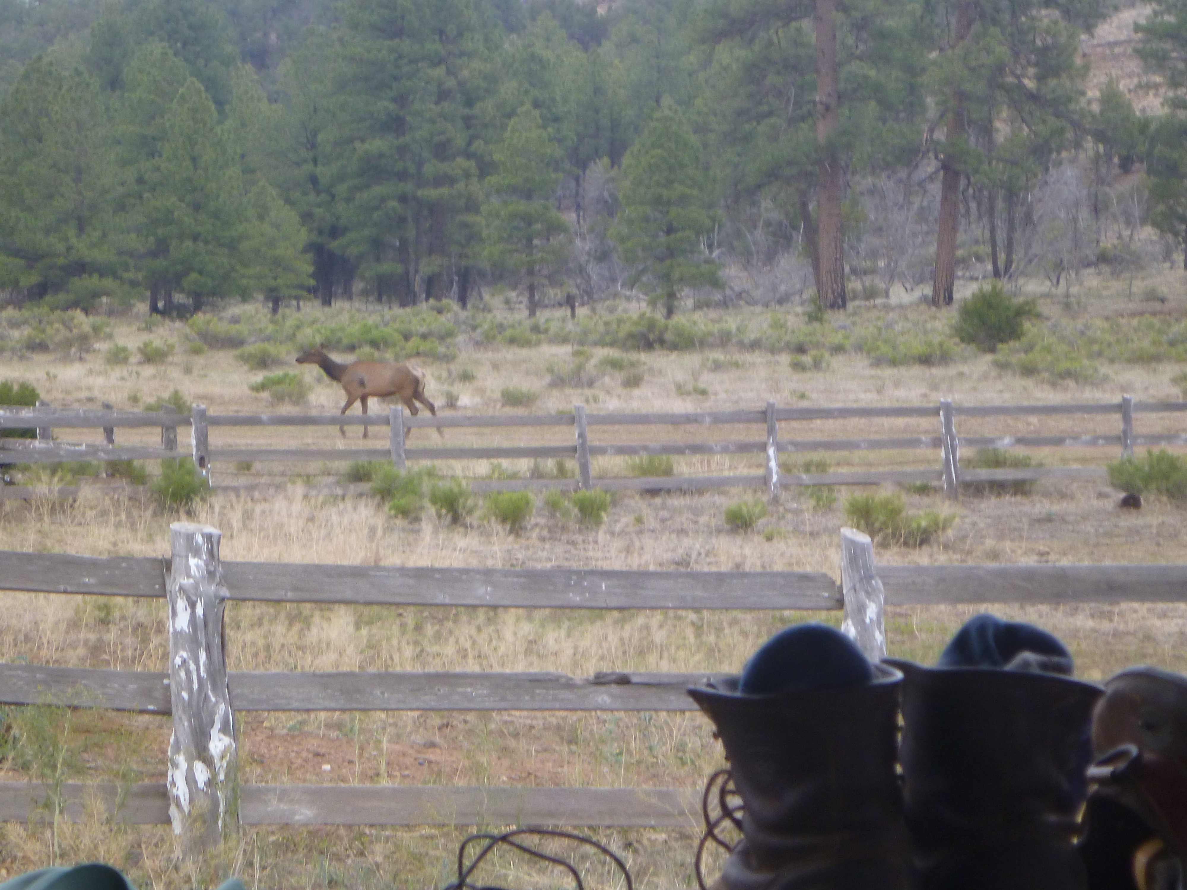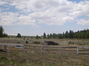 We were camped in a lovely spot.  The ponies and I had everything we needed and quite a few of our “wants” covered as well.  I had wonderful neighbors a few miles up the road who knew where I was camped and were keeping a friendly eye on me.  A young elk had come by the water trough the day before.  Hummingbirds hovered, checking out my bright yellow dry bags and colorful laundry.  I was catching up on my journal Tuesday afternoon, sitting in my tent under the shady pavillion, enjoying the peace and beauty of my surroundings, when a dust devil sprang up right behind me, twisted and whirled across the yard, picked up several Large barn sections that were neatly stacked not far from my camp and tossed them over the fence and across the field – then sudden stillness and silence – spooky!  (and it all happened so Fast – maybe a minute total!)