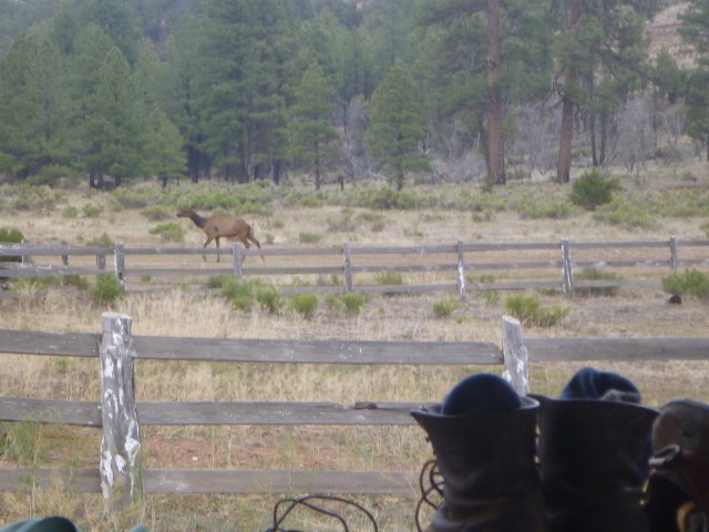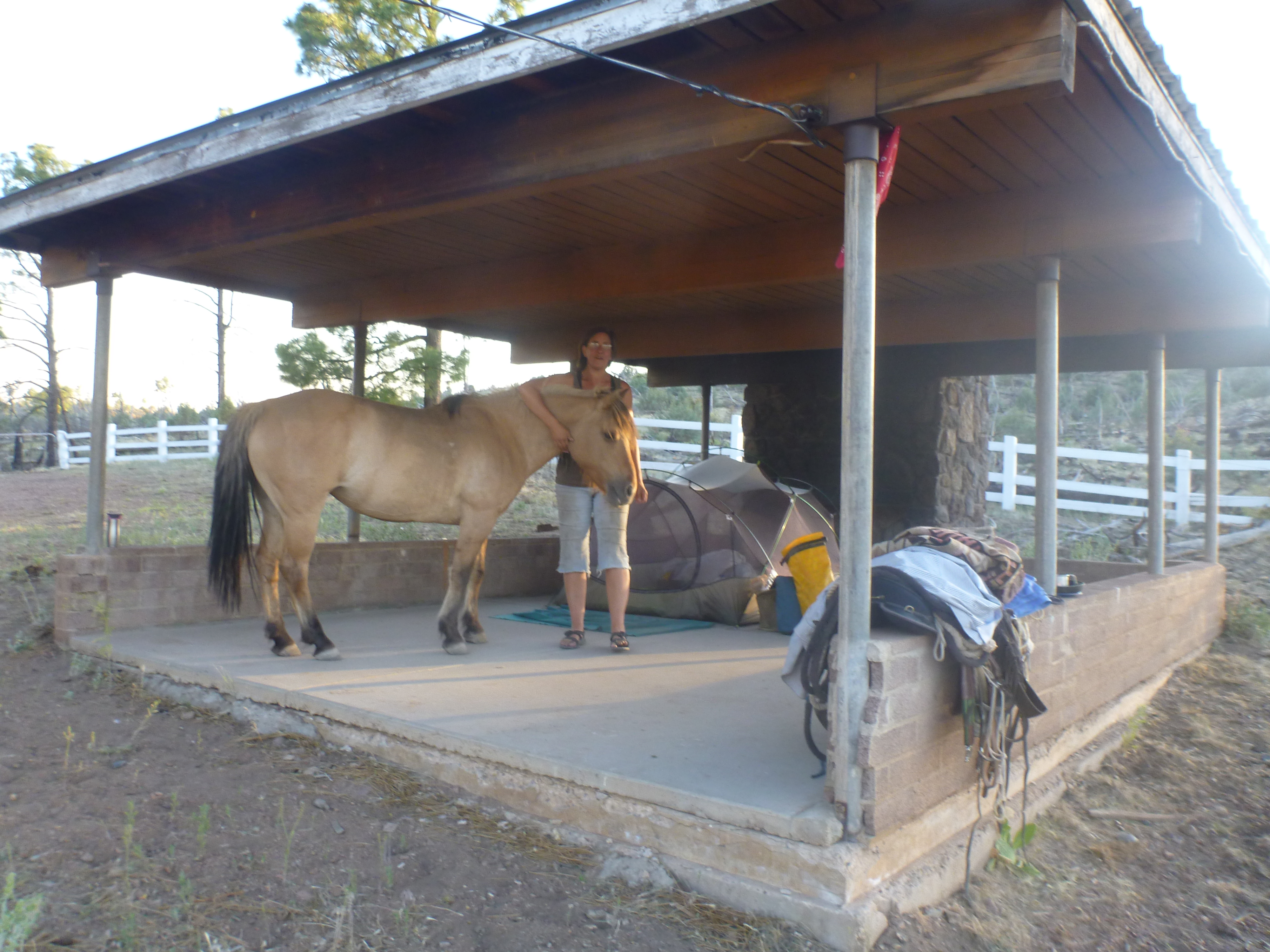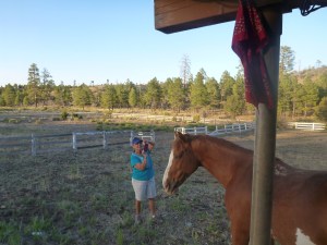 Last Tuesday in the very early morning I was woken from a peaceful sleep by the sound of galloping hooves.  I was out of my tent and into my shoes before I was conscious – Jesse was running up and down the fence and around the yard, all flags flying, snorting and blowing and intently focussed on Something down the wash to the south.  I went towards him and Finehorn came trotting over to me, wrapped her neck around me and pressed close.  The sun was not yet up (it was before 5am) and although there was enough light to see, I couldn’t determine what was upsetting the ponies.  After about 5 minutes of this Jesse came over and I put my hand on his neck to find his muscles tense and literally trembling.  We all looked together, seeing nothing out of the ordinary, until finally things calmed down and the ponies returned to their grazing.  The best guess is a bear or a mountain lion coming by to check out camp – and since whatever it was didn’t return, that morning or the next – Mr.James had been big and fierce enough to make his point – my Hero!