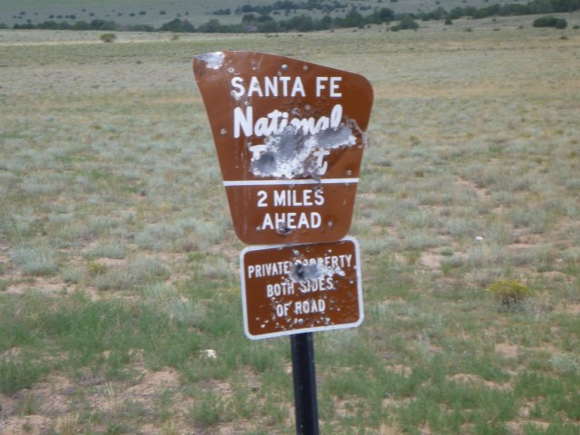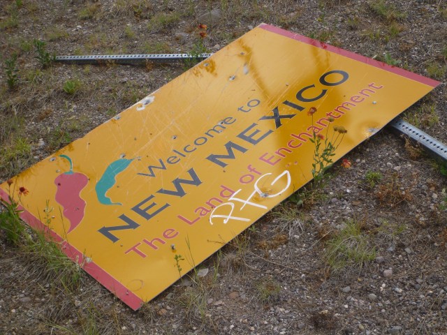I’m sitting in a lovely old (1800’s) Adobe house just outside of Abiquiu, NM trying to get caught up on “office chores” after a lovely week in the Santa Fe National Forest. (Although it certainly didn’t start out as a lovely week!) I’m learning that first impressions aren’t necessarily accurate in New Mexico. As I crossed the border from Arizona, this is the first thing I saw: