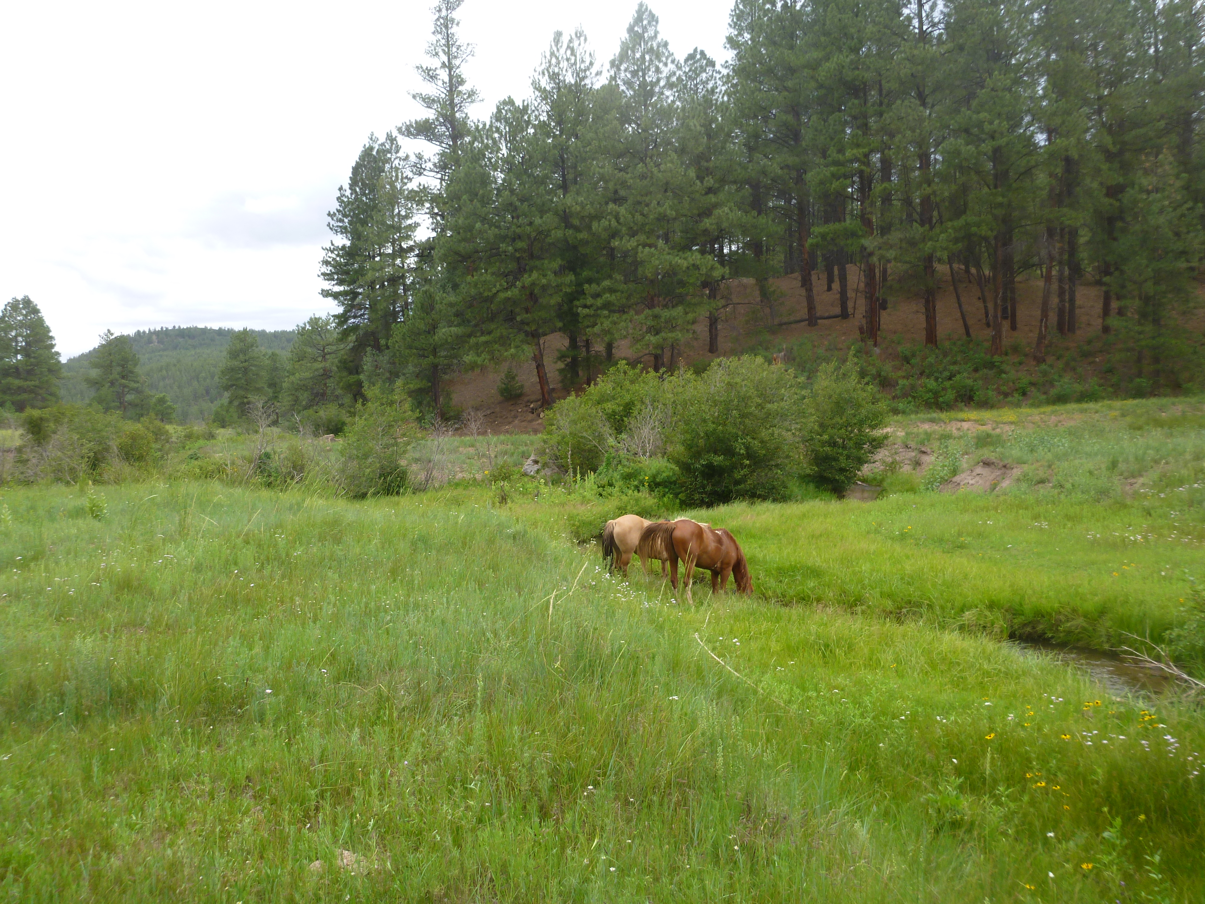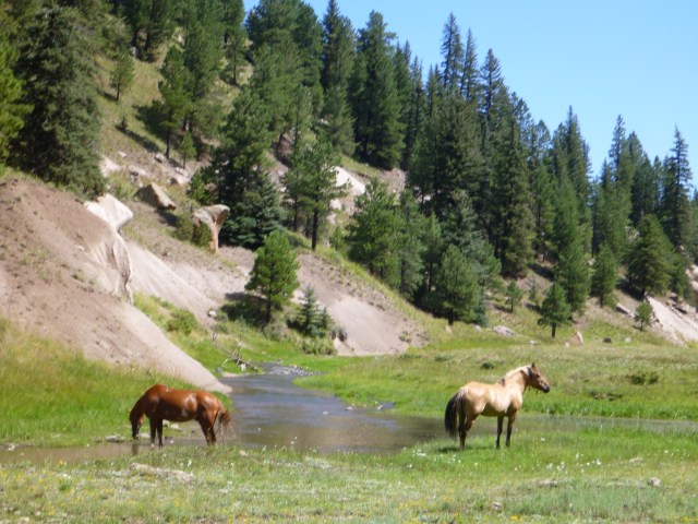 We’d only made 7 miles of progress when I found a wide grassy meadow and chose the most secluded spot I could find to pitch camp. The ponies were hungry and I had no idea what lay ahead. This would work. Better to err on the side of caution. It wasn’t a quiet night, and the next morning we set out to see what else the forest had to offer. I had it in mind to find the San Antonio hot springs, even though they were in a “day use only” area. I wanted to find a water source that wasn’t contaminated by human feces. I really wanted to get away from the ATVs and hoards of people. The ranger from the day before came by and was more encouraging, filling up my water bottles and saying that she’d checked out the blog. She asked about my intended route. I lied.