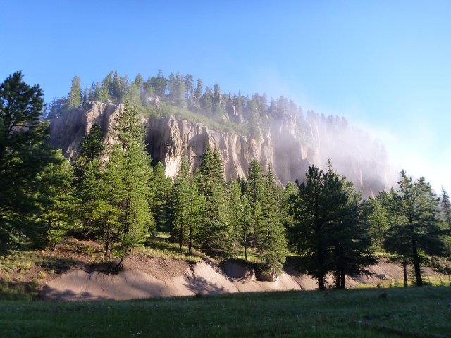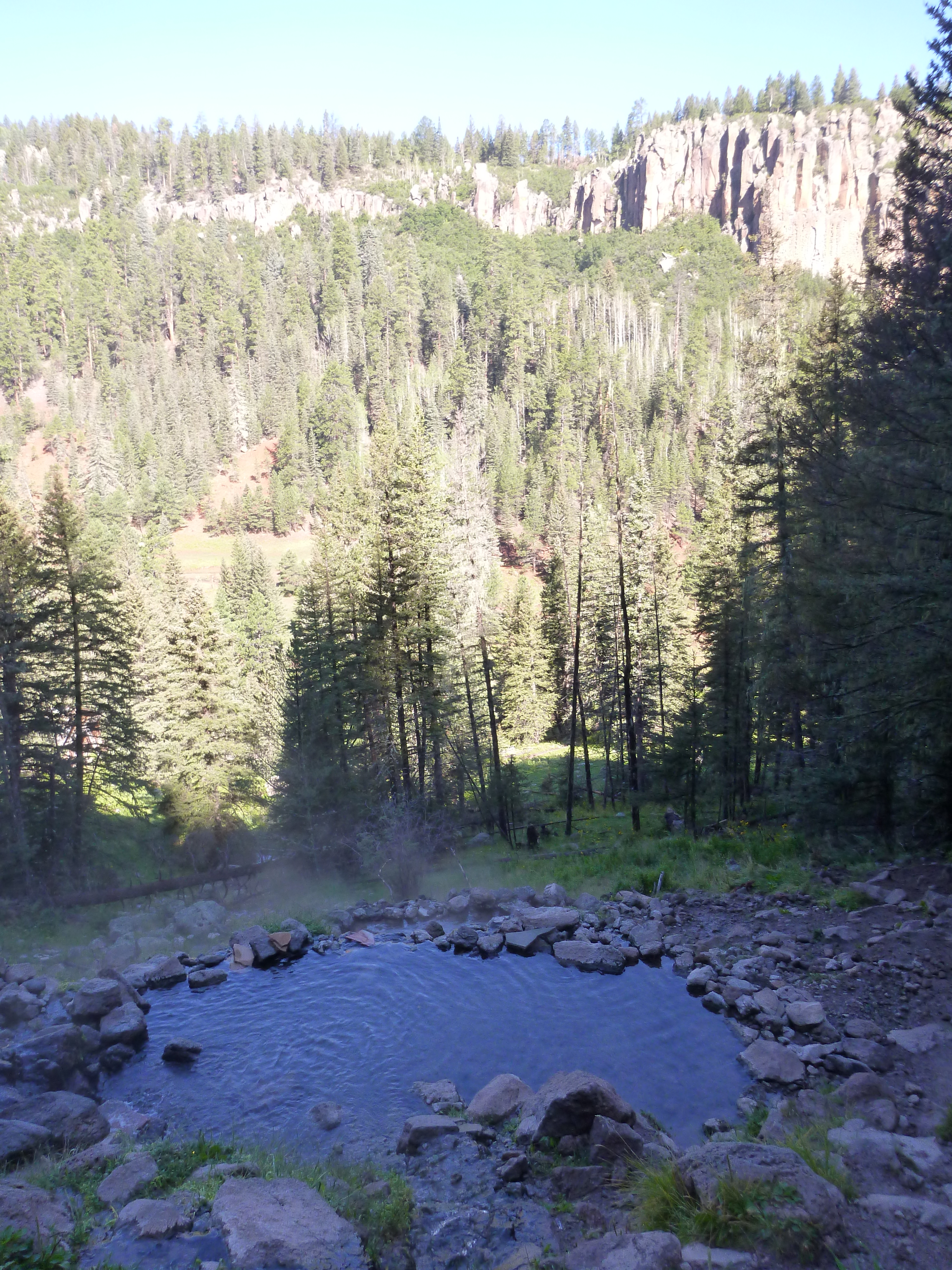 In the morning I was awakened by a strange noise. I peeked out of my tent to see a very large bull slowly grazing his way down to the creek, followed by a second, then a third. They passed within 5′ of my tent and ignored me completely. Once they’d gone by I got up and let Jesse off of the tether rope – Finehorn’s turn. The cows came by with their calves after breakfast and then I headed up to the San Antonio hot springs. Ahhhhhhh! Blessings on the Commons. Sunday it poured rain all day and I finished the book I was reading (Housekeeping by Marilynne Robinson – highly recommended) while the ponies rested and ate their fill. Monday morning we were ready to ride on in search of new adventures…