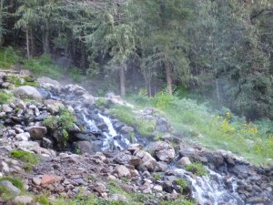 The ride was worth it! I untacked the ponies and they immediately started grazing. Jesse stood with all four feet in the cold water of the creek and ate the clover that grew on the banks. I pitched camp next to a fire ring at the edge of the forest and got myself organized just before dark. I heard a whistle and a couple I’d met earlier were hiking up the canyon on their way back from the Hot Springs. They stopped to chat and wound up camping nearby. One was an organic farmer and the other worked on wetlands restoration – it was lovely sharing the commons and a campfire with like-minded companions under the stars, listening to the sounds of the night.