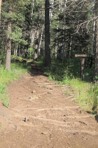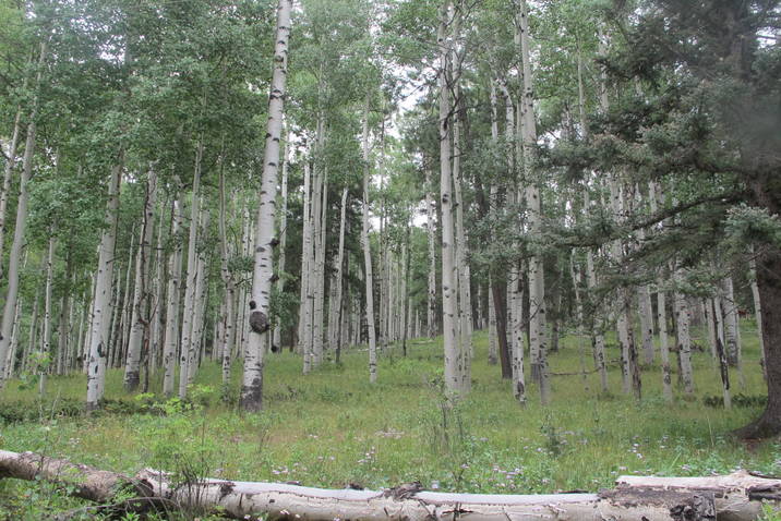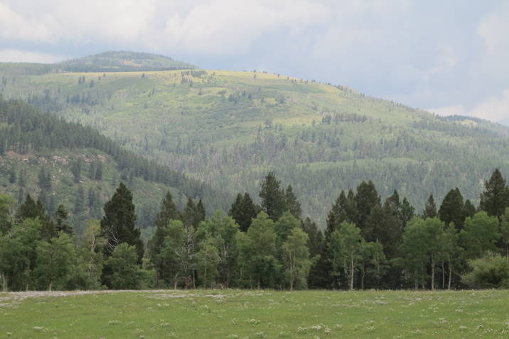 In order to reach the Iron Gate Campground, after leaving a narrow paved road, driving a four wheel drive pick-up, loaded with a bale of hay, bottles of drinking H20, fuel, and a picnic, we headed up through gorgeous quaking aspens, tall ponderosa pines, grassy meadows, wild flowers, with views of vast green mountains, and a log cabin tucked here and there.  Only hitch was that it took an hour to go 4 1/2 miles ….dodging holes, rocks, and gullies formed from rushing rain water! Great fun!