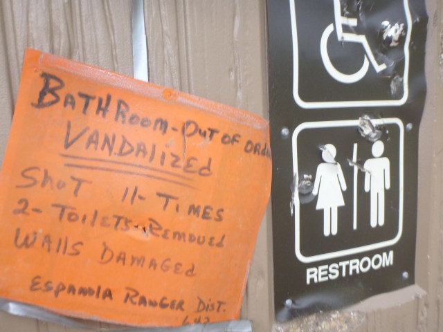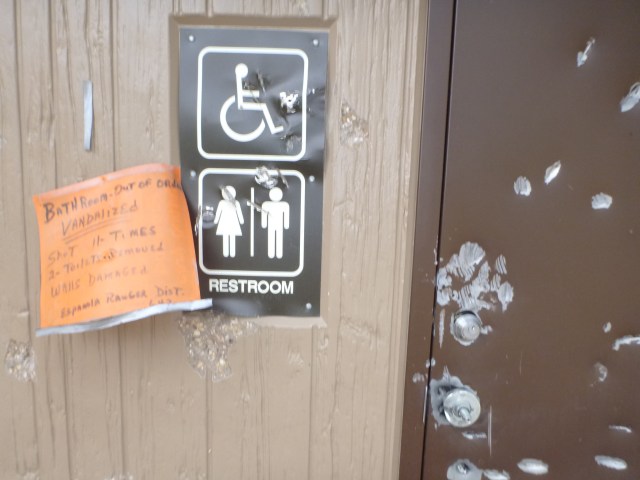 We used to have an outhouse. It was riddled with bullet holes that actually were made by bullets. So were all the neighbors’ outhouses bullet filled. People could see out through some of the holes during their visits to the little room and imagine how they got there. Made you think all right. Then the big bad government made a rule that no one could bring guns into a National Park. Things got real quiet after that. The people who like to spend their weekends drinking and 4-wheeling around shooting up the out buildings went somewhere else. Nice. They weren’t criminals after all. Just roudy, armed and drunk.