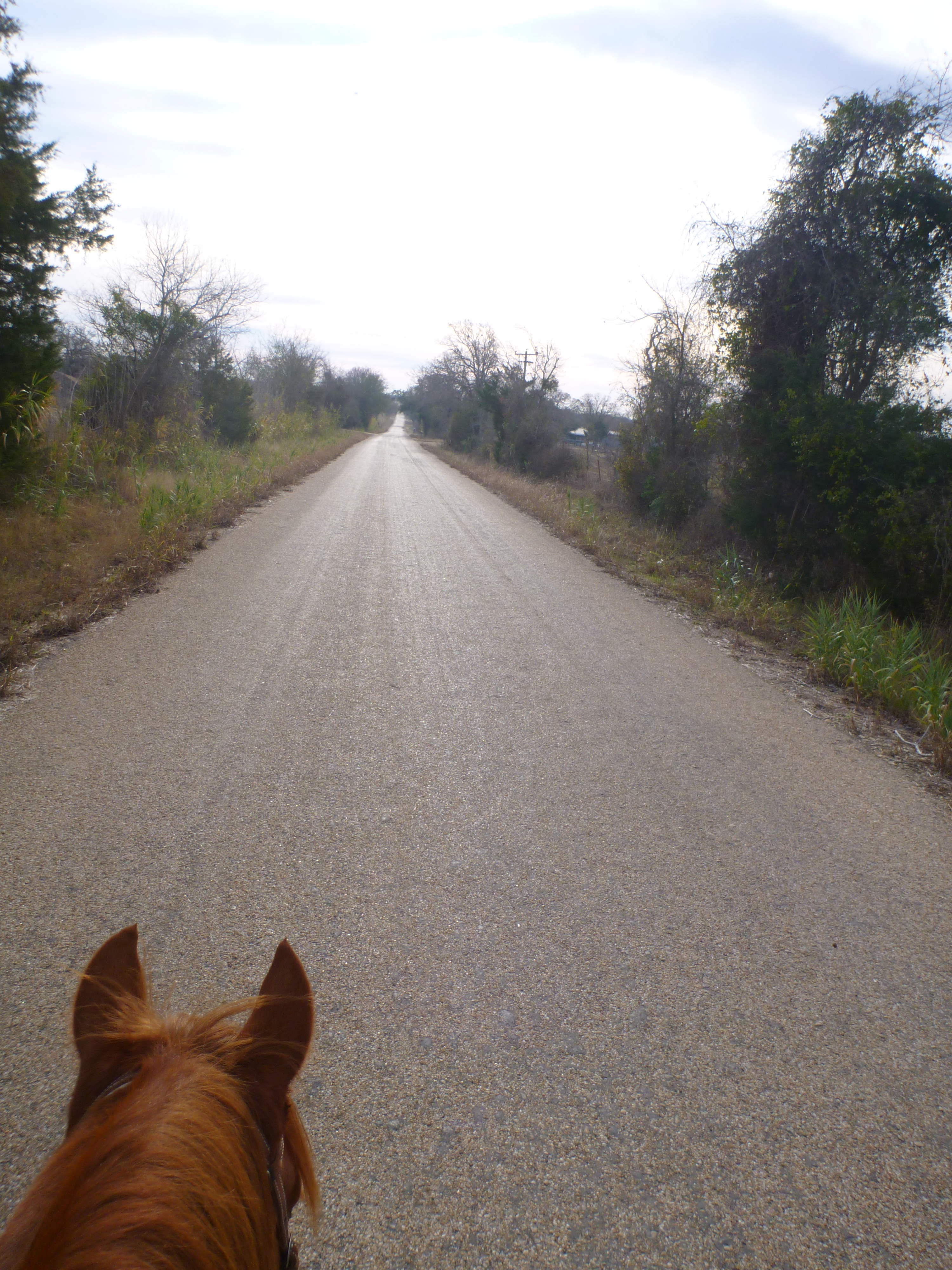 By Sunday I was feeling fairly confident leading two pack ponies, the weather was glorious, we found perfect back roads and I wasn’t particularly concerned that I had no plan for a place to stop for the night.  We were riding beside pastures and post oaks and the graze in the bar ditches had plenty of green patches which delighted the ponies.  It was day 5 in a row for the ponies and somewhere in here we’d need to take a rest day but they still felt fresh from our 2 1/2 week break over the holidays and since heavy rains and flooding were predicted for Tuesday I wanted to make as much progress as possible before that broke.  In the afternoon a car passed me, then a few minutes later came back by – a woman leaned out “Are you lost?”  This was S, who invited me back to her place, warning me that she smoked cigarettes and drank beer and that her place didn’t smell very good since she’d had a fire on Christmas day when she’d poured gasoline in the fireplace thinking it was Diesel.  When she warned me that all her linens had been picked up to be dry-cleaned to get the fire smell out I assured her that I had my own bedroll.  It was a good night (and a great stew) except for her chihuahua, named Medicare, who took an instant dislike to me and didn’t stop barking at me the whole time – even the next morning when coffee was ready before 6am.