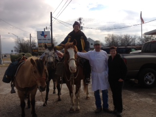 The next day the ponies behaved admirably considering that we were riding through alternating rain and sleet.  brrrrrrr!  We were heading towards Lexington where we’d been offered accommodations by a couple who trains polo ponies and recently bought Herk’s Store.  Only a 10 mile day – but once again by the time I arrived at my destination I’d lost feeling in a few of my extremities, even though we’d made excellent time!  I’m starting to really appreciate how spoiled I’ve been with the lovely weather on most of the Journey thus far.  I was up late that night, enjoying getting to know my hosts, listening to new music, gorging myself on broccoli and waterproofing my new Duster.  (If Gryph was still along we’d match! ;-))  Breakfast at Herk’s at The Table of Information and then back to tack up the ponies for another short day’s ride to a pre-arranged destination.  En route I stopped at Herk’s again, for a truly transcendent cheeseburger on a fresh jalapeno bun – and learned that what I’d been told about Lexington, TX was true – EVERYBODY I passed on the road waved.  Every Single Person – amazing!