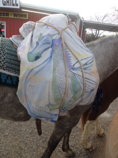 At first I didn’t even realize I was hurt.  I grabbed my cell ‘phone out of the pocket of my new (to me) duster and called T, telling him what had just happened and asking him to try and intercept from that end and then started after them, gathering gear off the road as I went.  A man stopped and asked if he could help.  He’d seen the ponies head down a dead end dirt road so at least they were off the highway.  We’d put a few bags into his vehicle when T arrived in his truck.  Transfer of gear and thank you and good-bye to the man who’d stopped to help.  We found Jesse and Finehorn together up the side road and caught them, unsaddling Finehorn since the saddle was more under her than on top of her by that point.  Luna Jack emerged from the woods behind us looking more than a little freaked out, the new Wizard’s cloak a bit the worse for wear but both of the main pack bags still aboard and intact.  I led Jesse and Finehorn up the road as she tentatively approached us and got the rest of the gear off of the ponies and into the truck with T’s help.  They were all a little wide-eyed and I was starting to realize that I was pretty banged up.