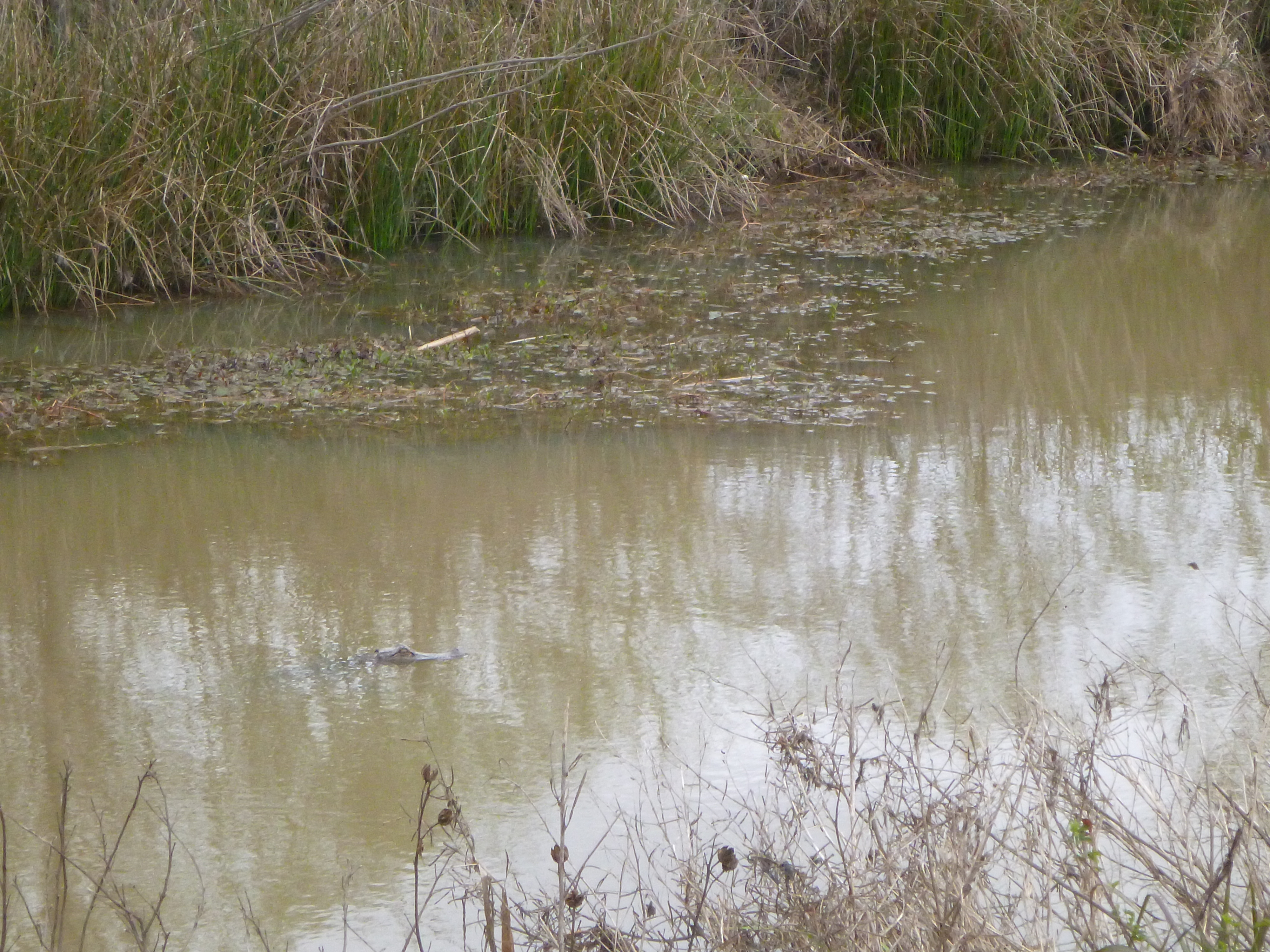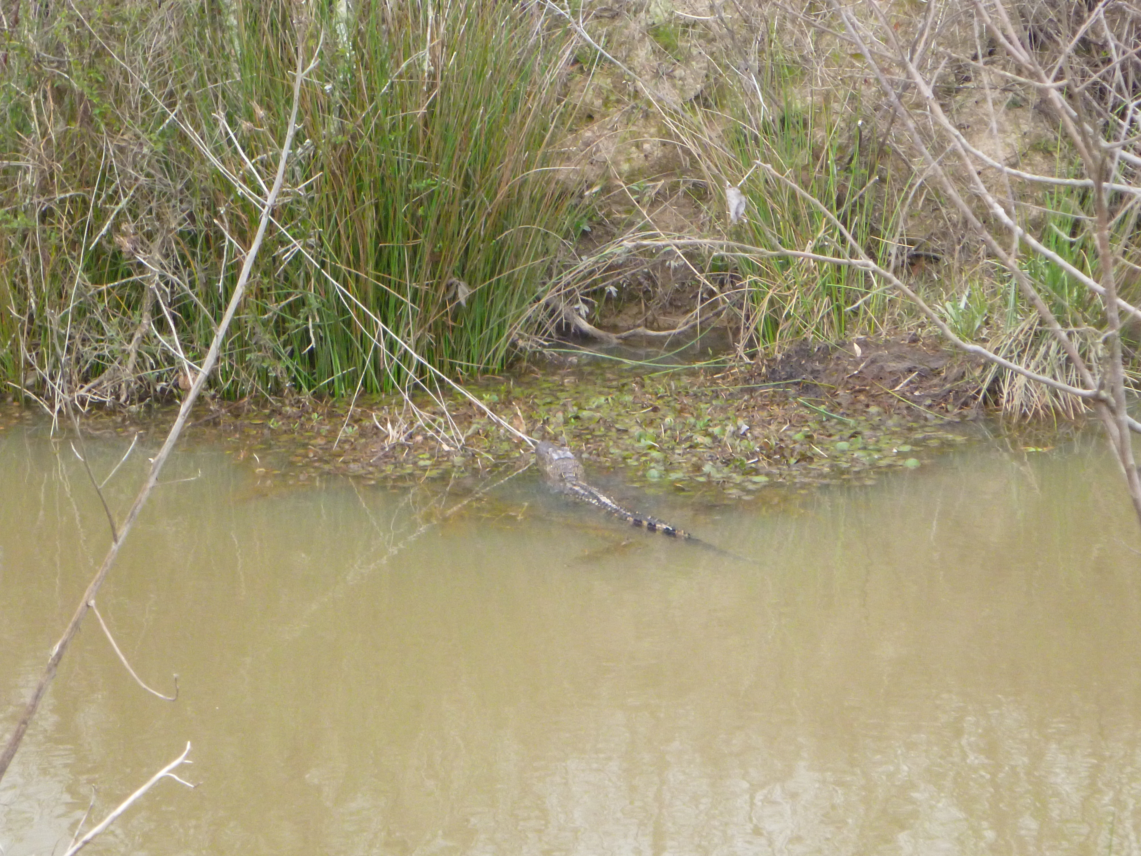 Monday Katie returned the car she’d arrived in, got a Coggins test pulled at the vet so we’d be legal to cross the Mississippi, we packed up and rode out. The new mule did well and it was fun having somebody to ride with again. Tuesday I got to see an alligator at the Catahoula Wildlife Reserve (from the safety of a car) and my fears are much relieved by the reminder that, like most wild creatures, it wasn’t all that keen on human contact and didn’t hang around very long once I got out of the car and tried to take a photo.