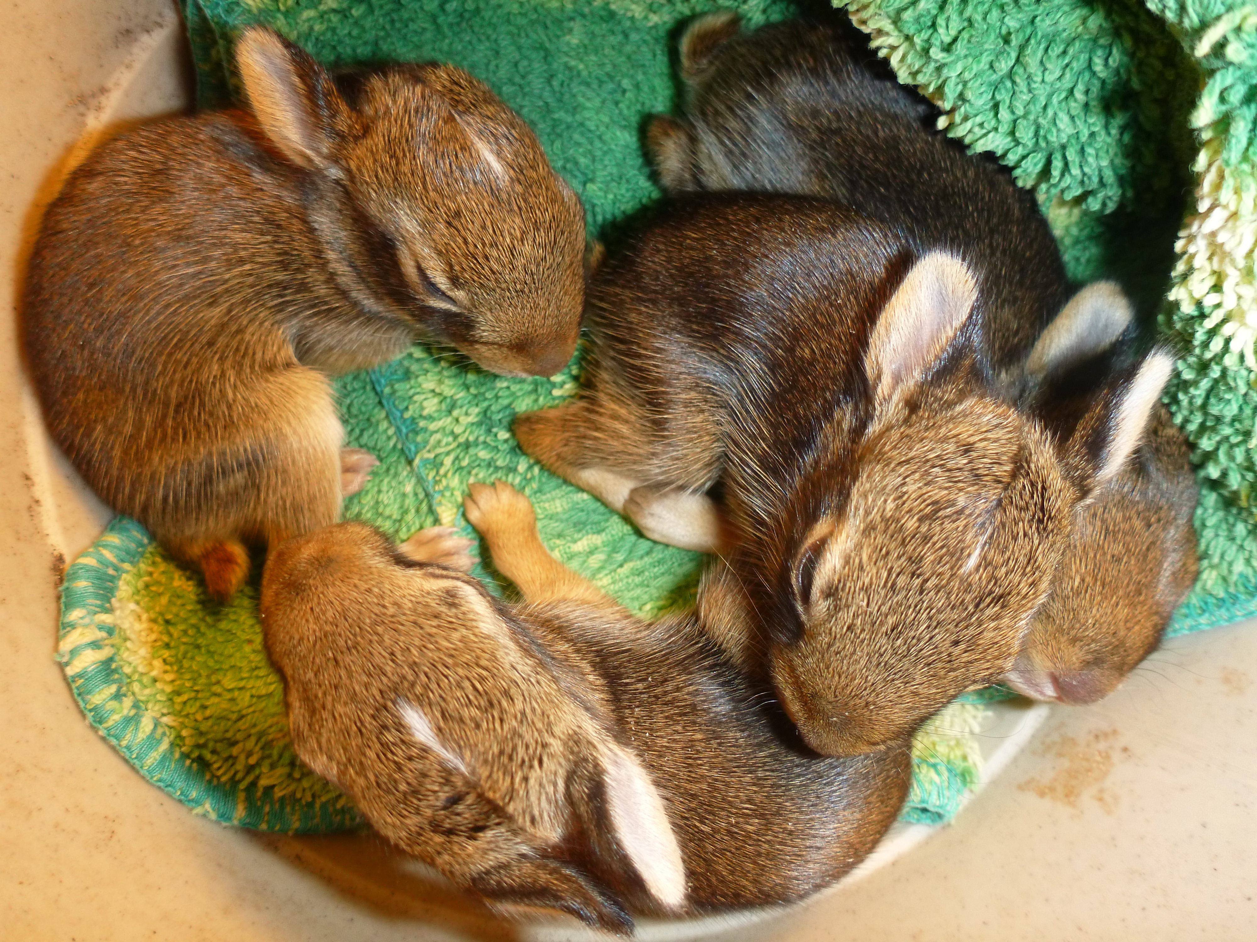 Other highlights of the past two weeks have been 4 baby bunnies who were rescued when the lawnmower took the top off their nest and the big brindle (American Staffordshire Terrier) dog brought them to Lucy.  They’re doing well and have graduated from formula in an eye dropper to eating cheerios and apples and alfalfa and will be ready for rehoming in a week or so.