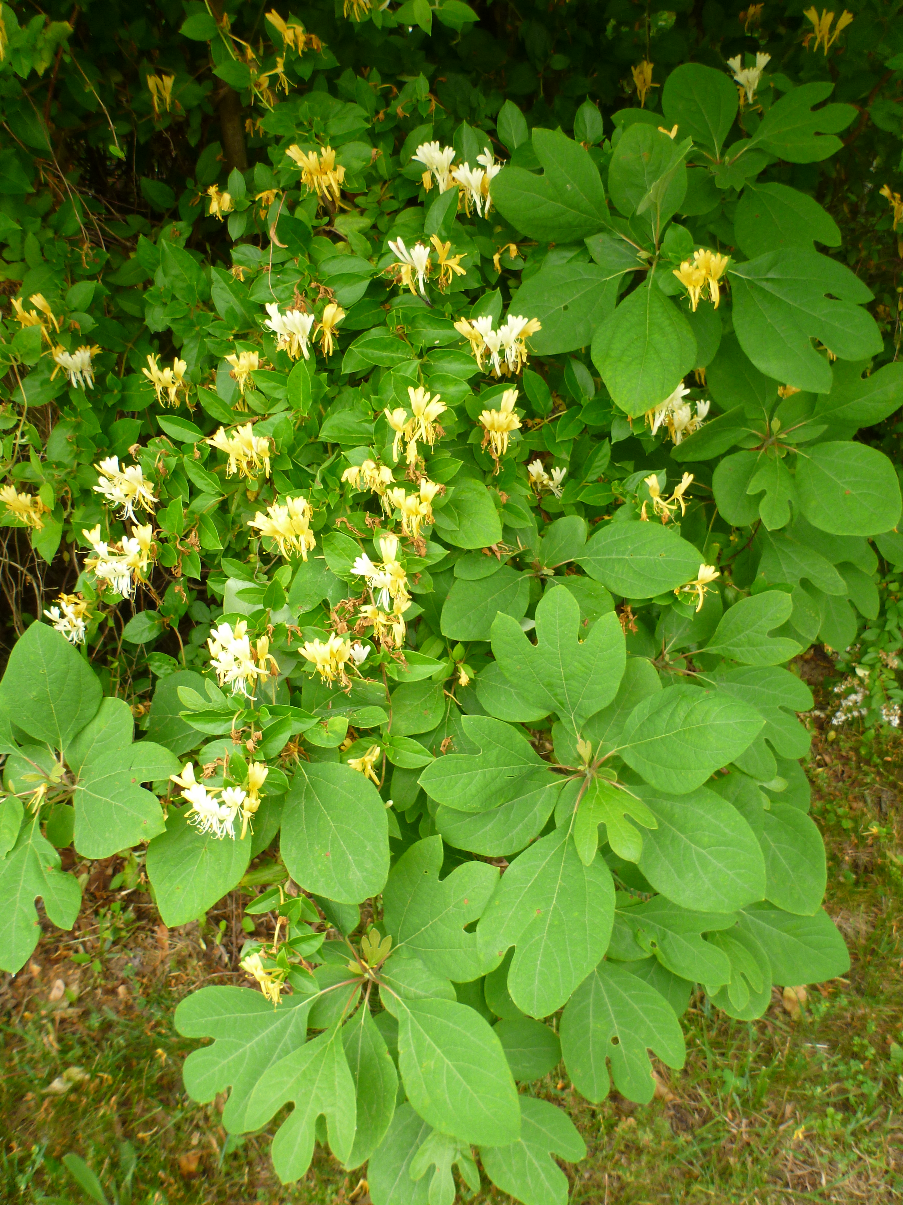 One other random note – Sassafrass – I grew up with this tree back in East Texas – the root makes a grand tea in Springtime – (and sarsasparilla – aka root beer ;-)) – I’ve been asked a few times lately how to ID it and here it is, growing beside the driveway.  The flowers are honeysuckle, a vine and not part of the tree – they’re invasive and smell divine.  If you look at the leaves of the Sassafrass tree they come in three different shapes – all on the same branch!  The smell of the root is very distinctive as well – but harder to transmay on line.