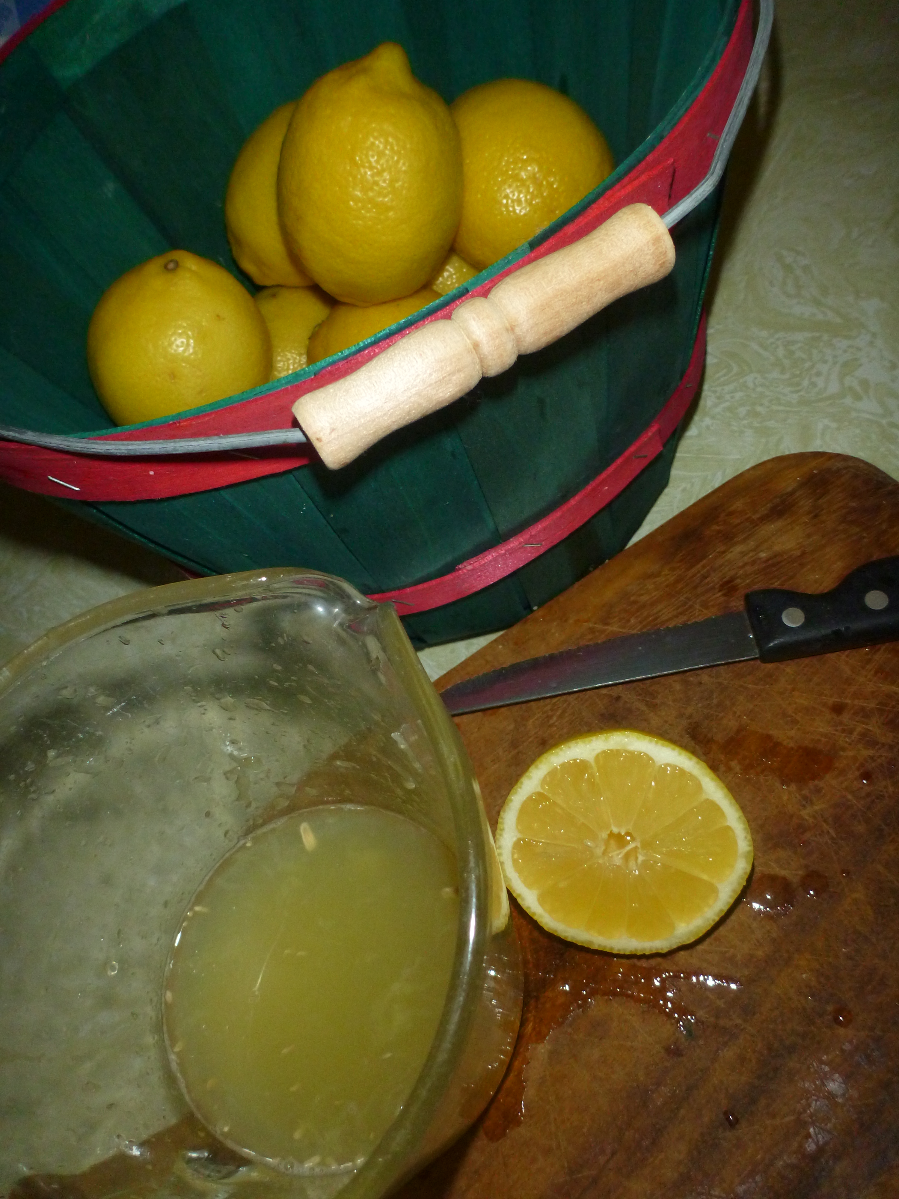 I decided that there was enough fresh goat’s milk in the fridge that I could experiment with making cheese, something I’ve wanted to learn for many years.  I went on line and found a very simple style of recipe requiring only milk, lemons, cheese cloth and a thermometer (and a stainless steel pot and a wooden spoon).  I squeezed a cup of fresh lemon juice, brought the milk up to 180*F, stirred them together and waited for the promised curdling.  Ummm – yeah – two more lemons – oh dear – have I wasted a whole gallon of milk?  and 7 lemons?  I poured it into the cheesecloth waiting in the colander, thinking all was lost, and lo and behold – there were solids accumulating!