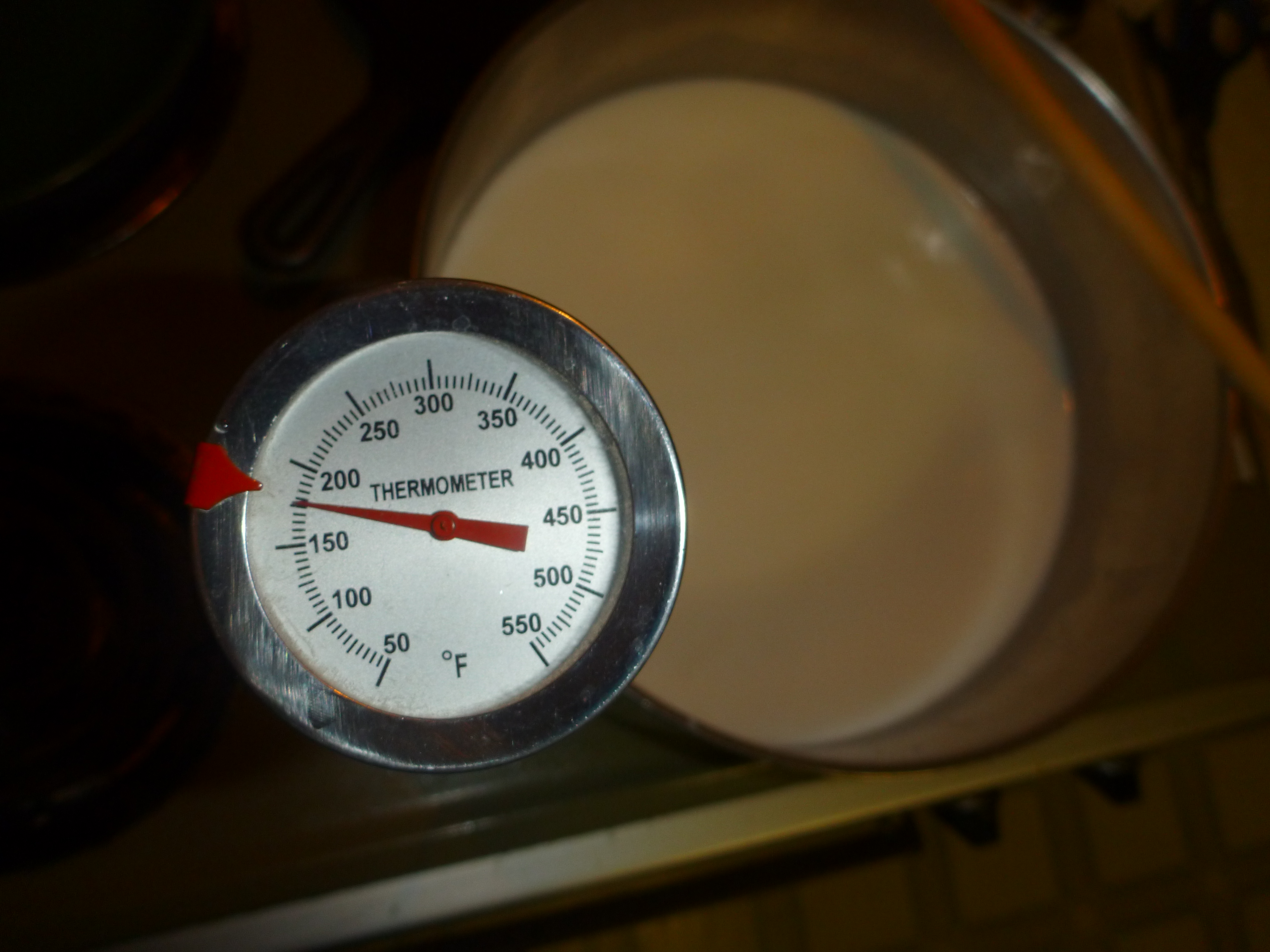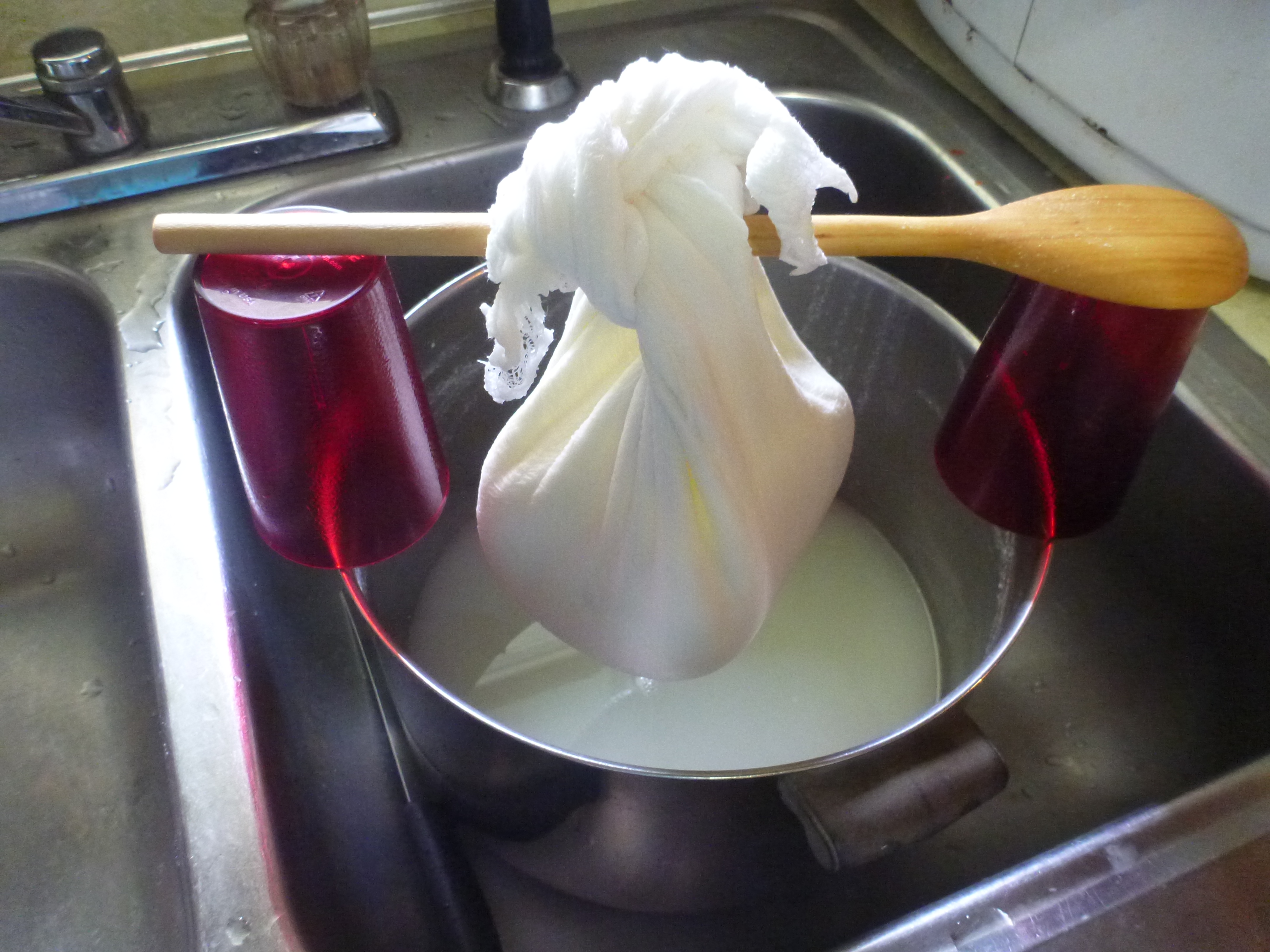 I rigged the cheesecloth wrapped lump so that it could drain, washed the dishes, went off to read for awhile – and returned to find that my precarious rigging had toppled.  I set it all up again, not sure whether to restart the drip dry time – wishing I had an experienced cheese maker to call – deciding to split the difference.  The resulting cheese had very good flavor, but was Not creamy – the adjective that came to mind was “dusty” – ok – not as bad as all that – but not something to spread on a cracker.