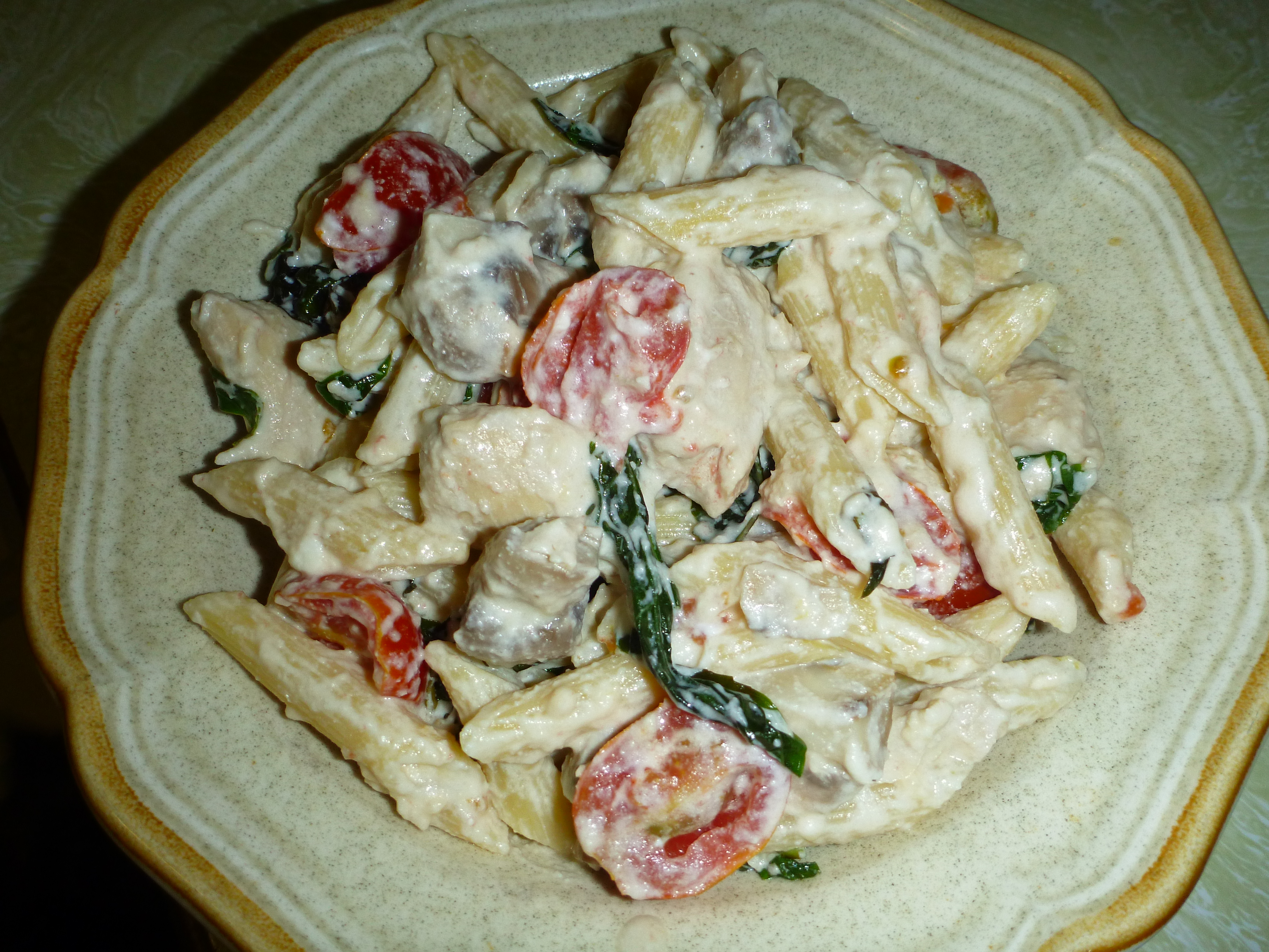 Today I cooked up some pasta and saute’d chicken, mushrooms, garlic, grape tomatos and basil in butter, mixed it all up with the goat cheese and a bit of parm – et voila – dinner!