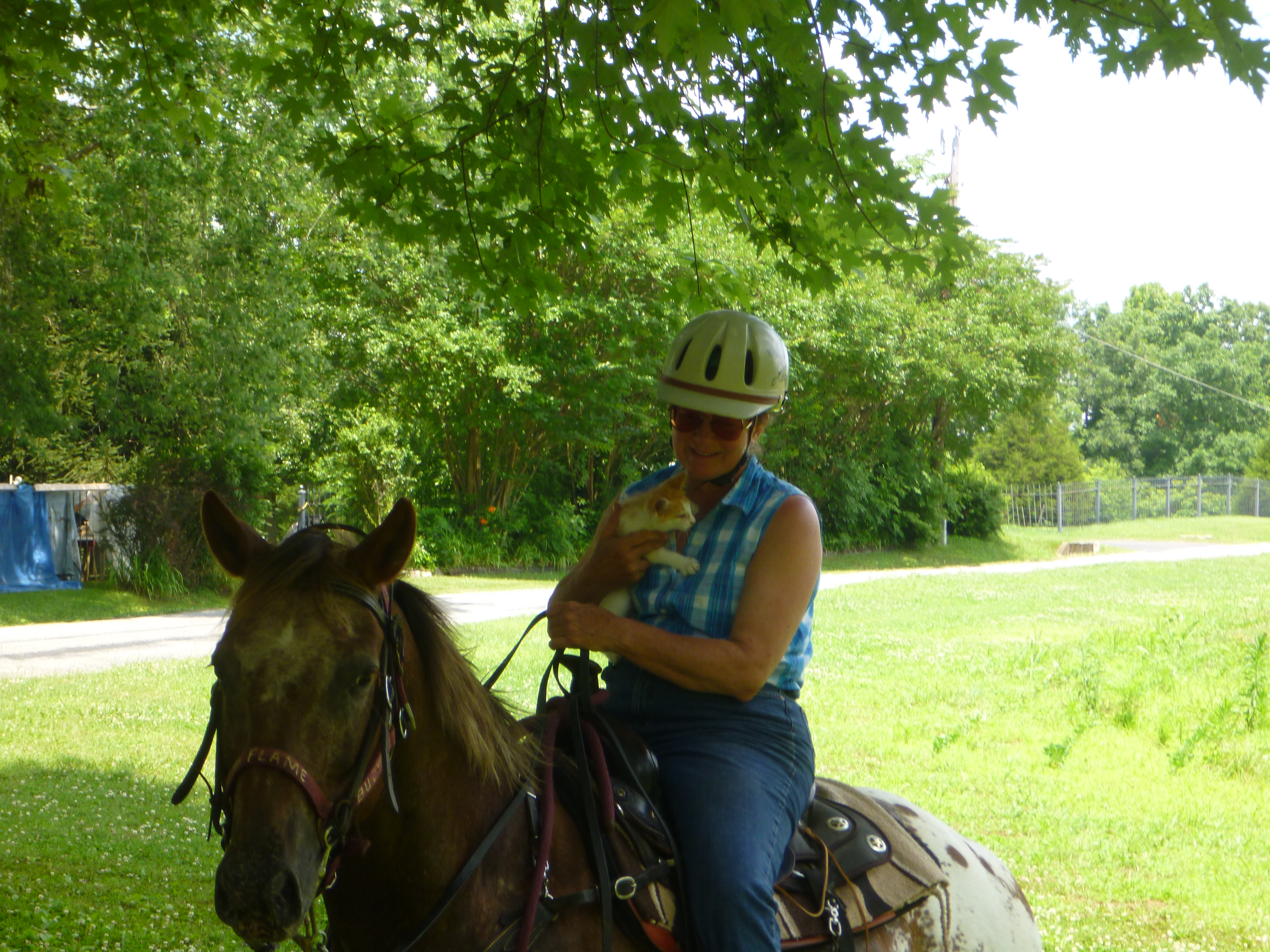 Today I saddled up and rode for an hour and a half, ponying Saint Finehorn who was NOT going to be left out of even a minor adventure.  I followed Lucy and Amber on a long loop that led over the creek and almost all the way to Walmart.  Lucy heard a kittten crying along the creek and stopped to rescue it.  Finehorn’s lead rope was used more to restrain her forward motion that to encourage it and Jesse didn’t complain once.  We got home and, with no little trepidation, I removed the saddle and pad from Jesse’s back.  The one remaining pink spot (which I’d smeared medicine on before we left) was beautifully untouched but there were two raised areas, one on each side, exactly the same size and shape as the holes I’d cut.  Within half an hour these were back to normal and Jesse and Finehorn both enjoyed being hosed down before going out to graze.  I think that the raised areas are like the temporary marks from a bra strap or tight jeans, just horse sized.  I have no real clue if this is likely to cause problems up the road.