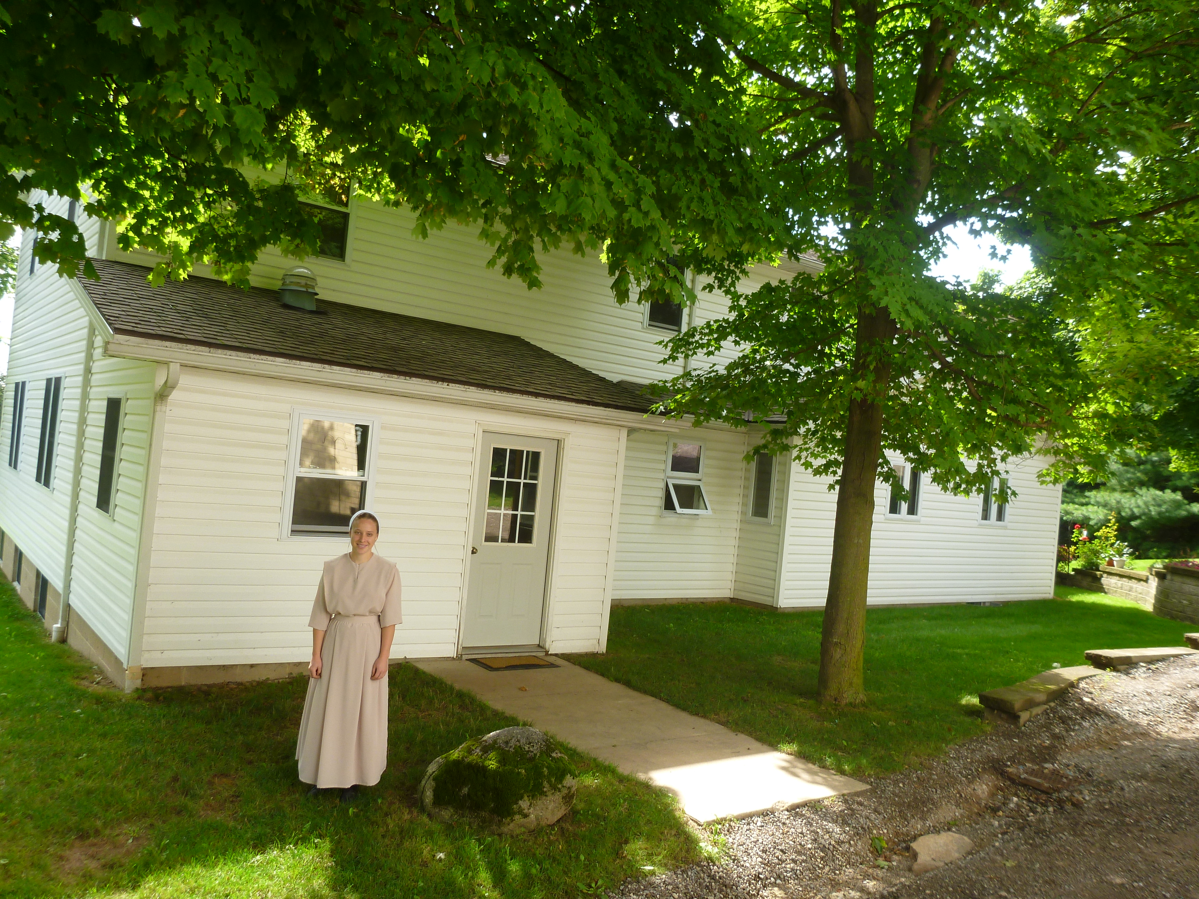 I untacked the ponies and put a nervous Finehorn into a big box stall.  She wanted OUT!  I put mr.James in with her which helped a little bit, tho he would obviously have preferred a room to himself.  I was invited into the house and with incredibly gracious hospitality offered a hot shower!  There is a saying, “when in Rome, do as the Romans do” but of course one must first determine what it is that the Romans are doing!  I think this had been a lot of my fear – not knowing how to behave and committing some awful and embarrassing social blunder.  I face this quagmire most nights that I’m invited in, and have realized that it’s always easier to stay in my comfort zone and try to pick houses where I think I already have a clue as to the “culture” and what’s expected of me.  In California it was always scarier riding up to a Mexican house: what if they didn’t speak English!?  In this case, I needn’t have worried.  I helped peel peaches for dessert while home made pizza baked in the oven.  My brother’s family has a “Friday night – Pizza night” and this family had that same tradition on Saturday night.  7 layer salad, ice cream to go with the peaches, interesting conversation and I felt very much at home.  After dinner the family gathered in the living room and sang in 4 part harmony and  my upstairs bedroom was beautiful and comfortable.  After breakfast the devotional focused on Matthew 25: 31-46.  I was invited to Sunday School, but elected to ride on, feeling very grateful for the night’s rest, the company, and the names of relatives I could stay with further on my way.