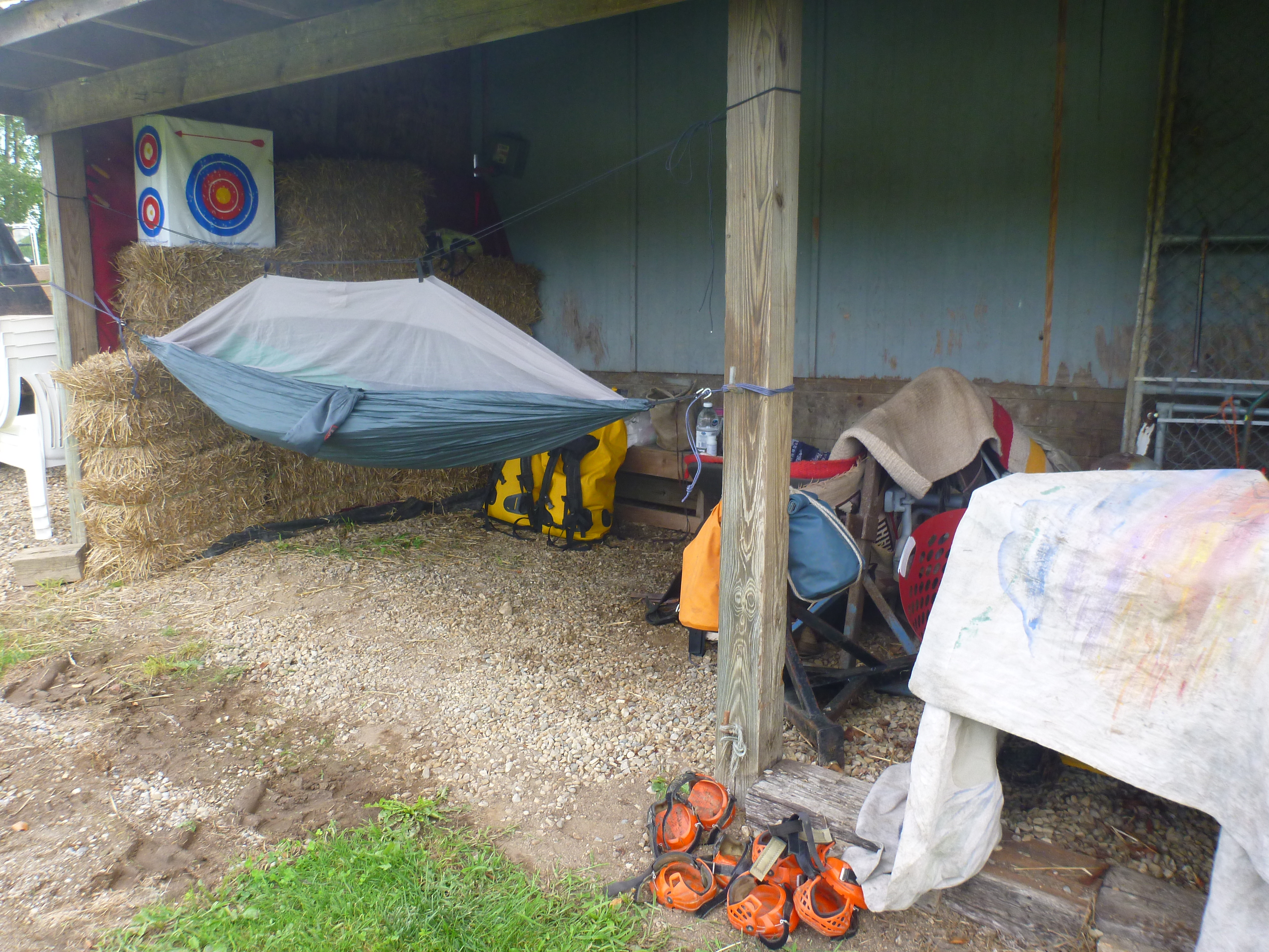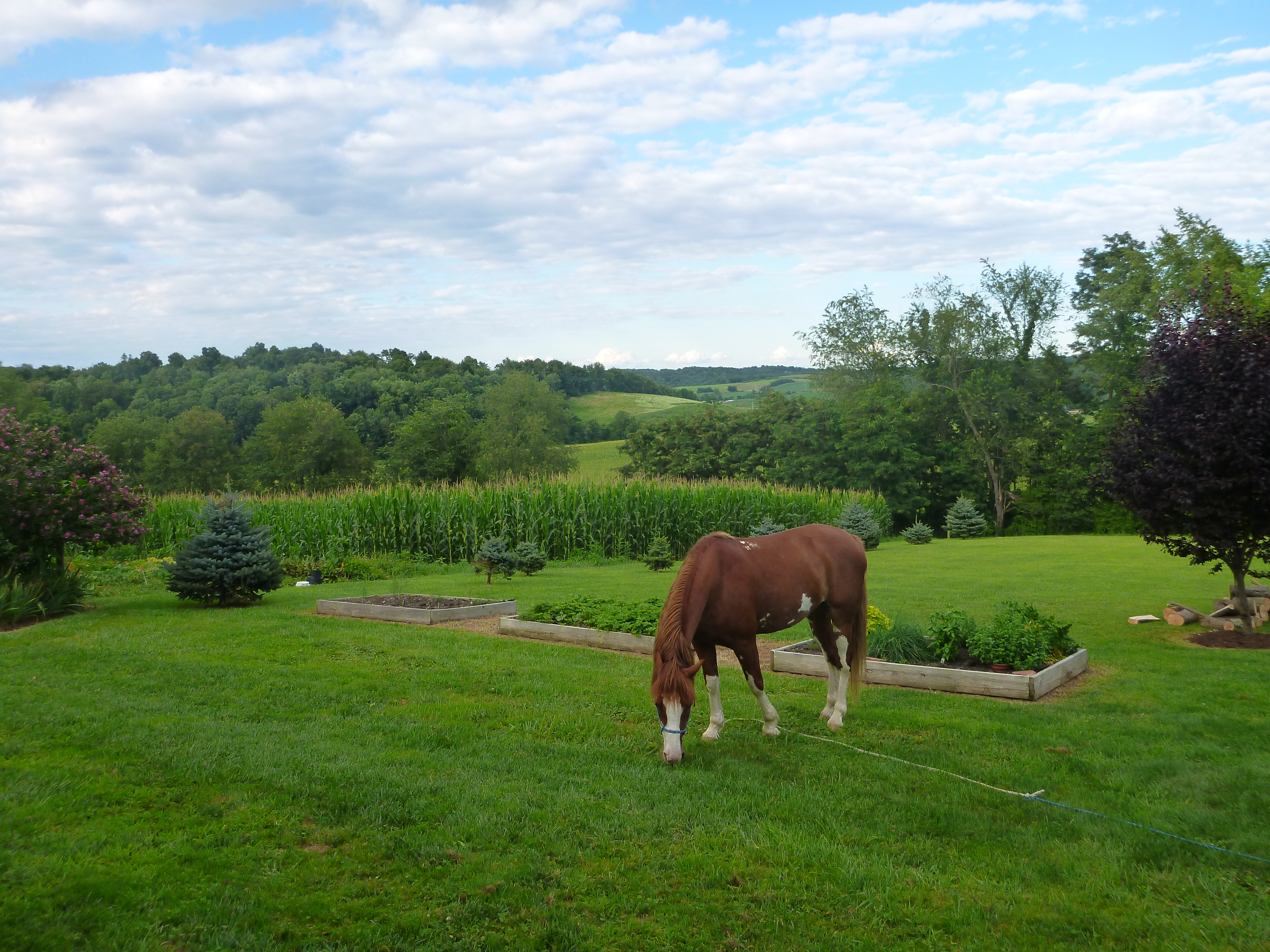 It was a beautiful day’s ride, cool and breezy on back roads with very little traffic.  I passed a campground full of RVs and screaming kids and I cringed and didn’t even slow down.  As the ponies started to flag I started looking for a place to stop.  Lots of “no trespassing” signs – and a red truck that came up slowly behind me 3 times, full of 20-somethings who all waved and smiled, waiting to pass on the narrow roads until I found a place to get the ponies off to the side.  The third time I asked them if they were lost and they laughted and said that they were just driving around.  I asked if they knew of a place I could stop for the night with my herd.  They told me about a church camp up the road a bit with a creek and I was riding in that direction when a woman in a red car drove up behind me.  Her kids had told her I was looking for a place to stop and she invited me to come back to the house I’d just passed.  It was a beautiful spot and I tethered the ponies on the lawn, just out of reach of the corn and tucked my gear in the lean-to.  I was invited in for a dinner of fresh veggies and grilled wurst and then went out to check e-mail and set up my hammock.