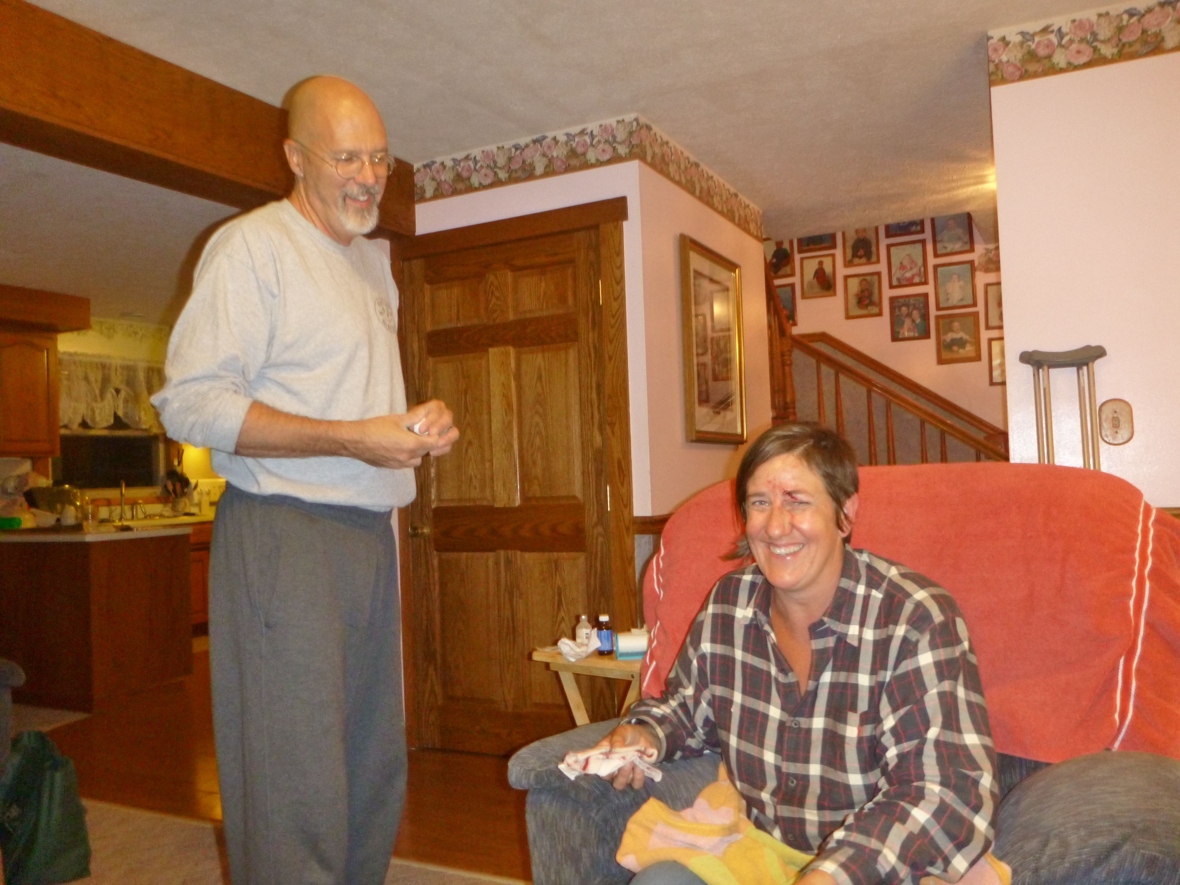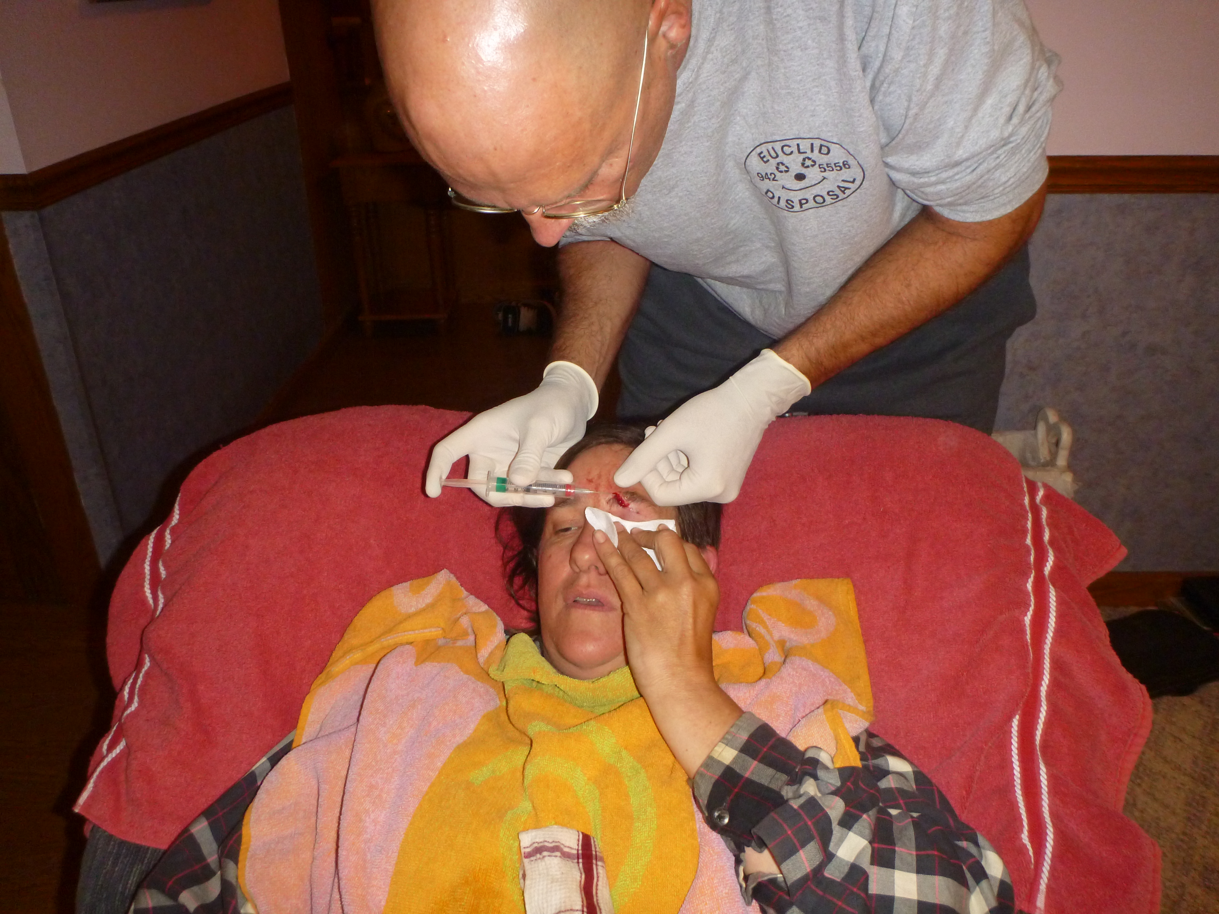 As it was getting dark I went to move the ponies, wound up speaking with the neighbors over the hedge for awhile and was walking back towards my hammock.  By this time it was dark and I was walking towards a bright street light and my vision hadn’t adjusted yet.  I tripped on a piece of farm equipment and hit my forehead.  It didn’t hurt too much and I picked myself up and continued walking across the yard when I realized that there was blood running down my face.  I went to the house in search of ice, worried about bleeding on the floor.  My wonderful hostess stayed very calm, brought me to the sink, took a look at the gash and called a doctor who goes to their church.  He suggested that she bring me over so he could take a look and off we went, driving into the darkness at 10pm.  My hostess was thoughtful enough to tell me where we were going “so I didn’t think she was kidnapping me and driving me out into the middle of nowhere in the dark”.  Dr. Scott Brown invited me into his house, laid me back in a recliner and said I needed stitches.  He just happened to have everything he needed in the truck because he’d thought he needed to stitch up one of his sons two days before.  He was on crutches due to a hip replacement a month prior, had on a shirt that read “got garbage” (he used to work as a garbage man)  and the whole scene was a bit hilarious, my hostess taking photos (per my request) and yours truly being very brave (and grateful for the local anesthetic!)