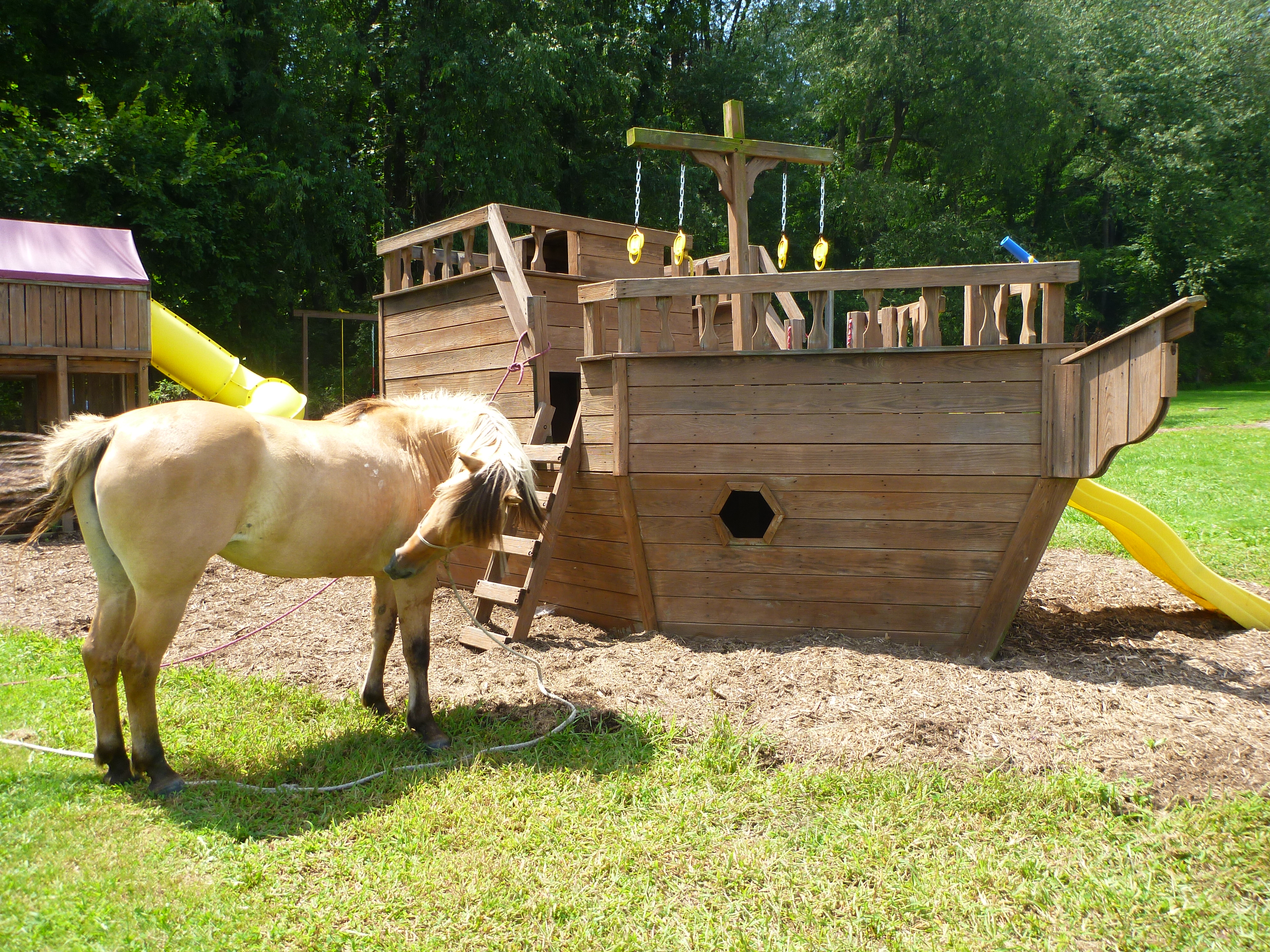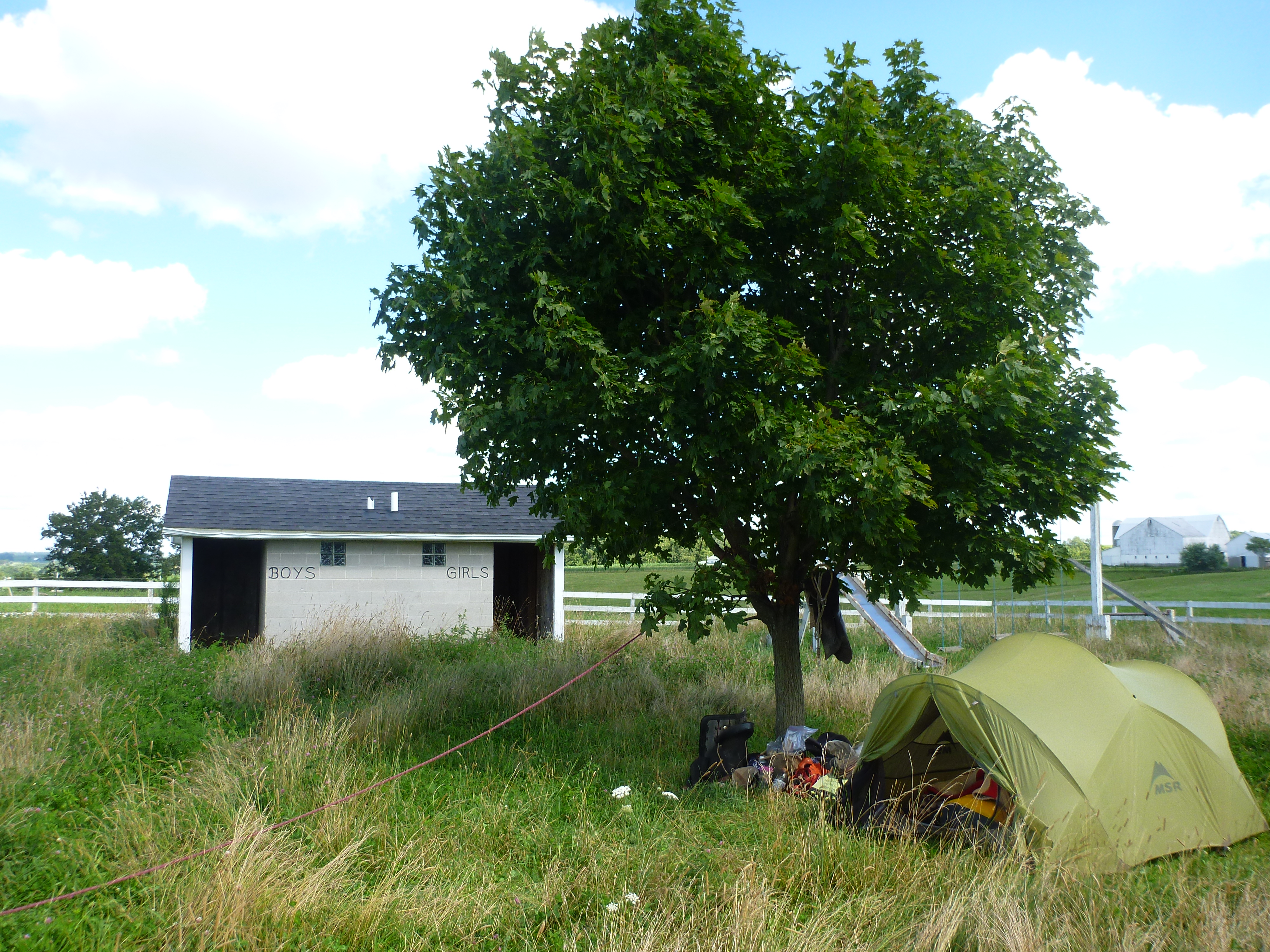 As I rode along I passed a large Amish house with a bunch of kids playing outside. As I rode up the driveway the kids giggled, squealed and scattered. Eventually a few women came out and I learned that I was heading in the wrong direction from town to find the Amish farrier I’d been told about as a possible place to stay. At the next house some boys said that I was welcome to stay in the school yard across the street. School was out for summer, there was plenty of good graze for the ponies plus a pump for water and an outhouse – perfect! They loaned me a water pail for the herd, I rode up next to the school and untacked the ponies under a tree. Soon I had an audience – about a dozen kids – who sat in the shade of the school and watched in silence as I set up camp. Finally everything was done and the ponies were grazing so I sat down in the grass and I watched them back. Eventually questions started flowing both directions and we had a good visit. Adults started showing up as well with more questions and answers – lovely peaceful evening in a really beautiful spot. I was given a piece of yummy fruit pizza as well as fresh eggs and sweet rolls for breakfast – and a list of names and addresses to send postcards to when I arrive in Maine. 😉