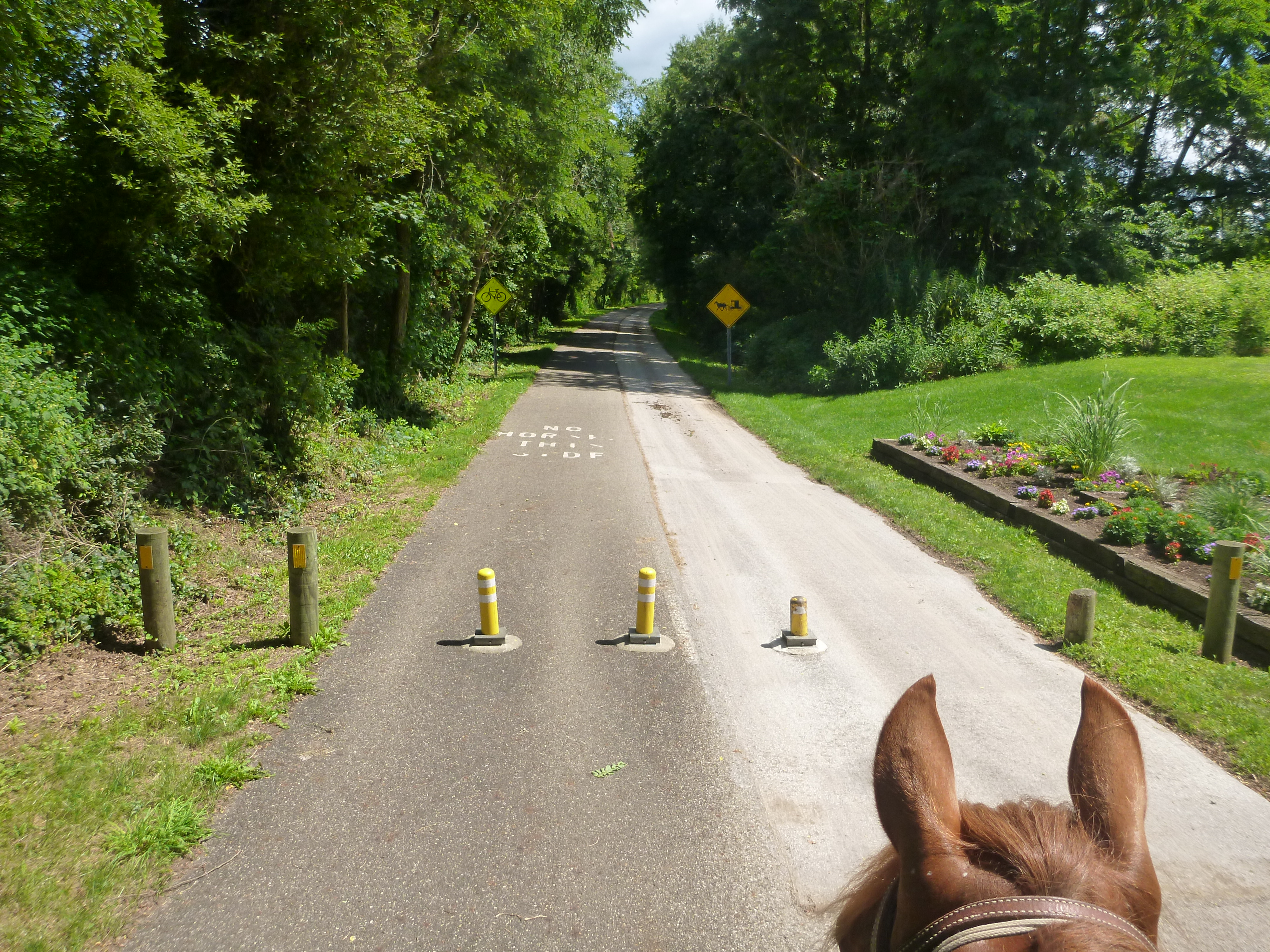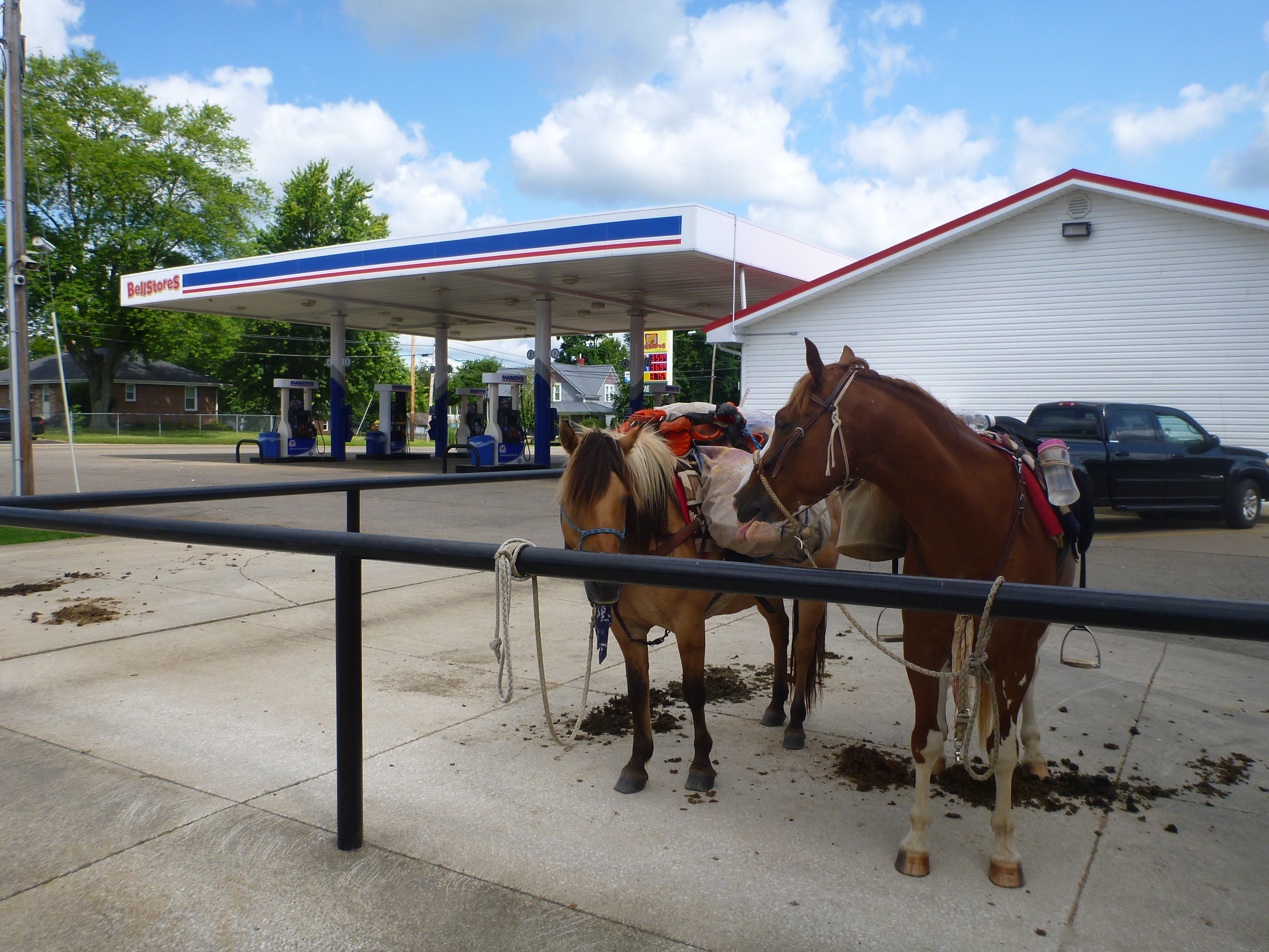 Coming into Holmesville I discovered a hitching rail outside of the gas station and ran in to grab a coffee and an egg sandwich. The ponies were not amused, pointing out that there was perfectly good grass in the park next door. I took the hint and we went over there for breakfast. As we were heading in the direction of the “bike and buggy” trail I’d heard about a truck pulled up and a couple got out and asked the usual questions. Turns out they knew a woman named Pam Kline who lives not far away and had done a similar Journey 20 years ago. They invited me back to their place, Windy Hill Farm, where they train and sell horses (they’ve got about 90!) but since I’d only come 4 miles and they were behind me I decided to press on. They were super encouraging and still wanted to help so they posted about my Journey to their 5000 facebook friends asking if anybody along my route could help with lodging and/or route finding as I came through their area. I’ve since been contacted by quite a few lovely, friendly people and have several new stops planned along the route And it’s looking like a group of 4H kids who work with rescue horses up in Maine will be coming to Minot to ride in the parade! Social networking in action – wow! And it speaks volumes about the reputation of Windy Hill Farm that they have a community like that. I guess it goes to show you never know who you’ll meet by the side of the road. 😉