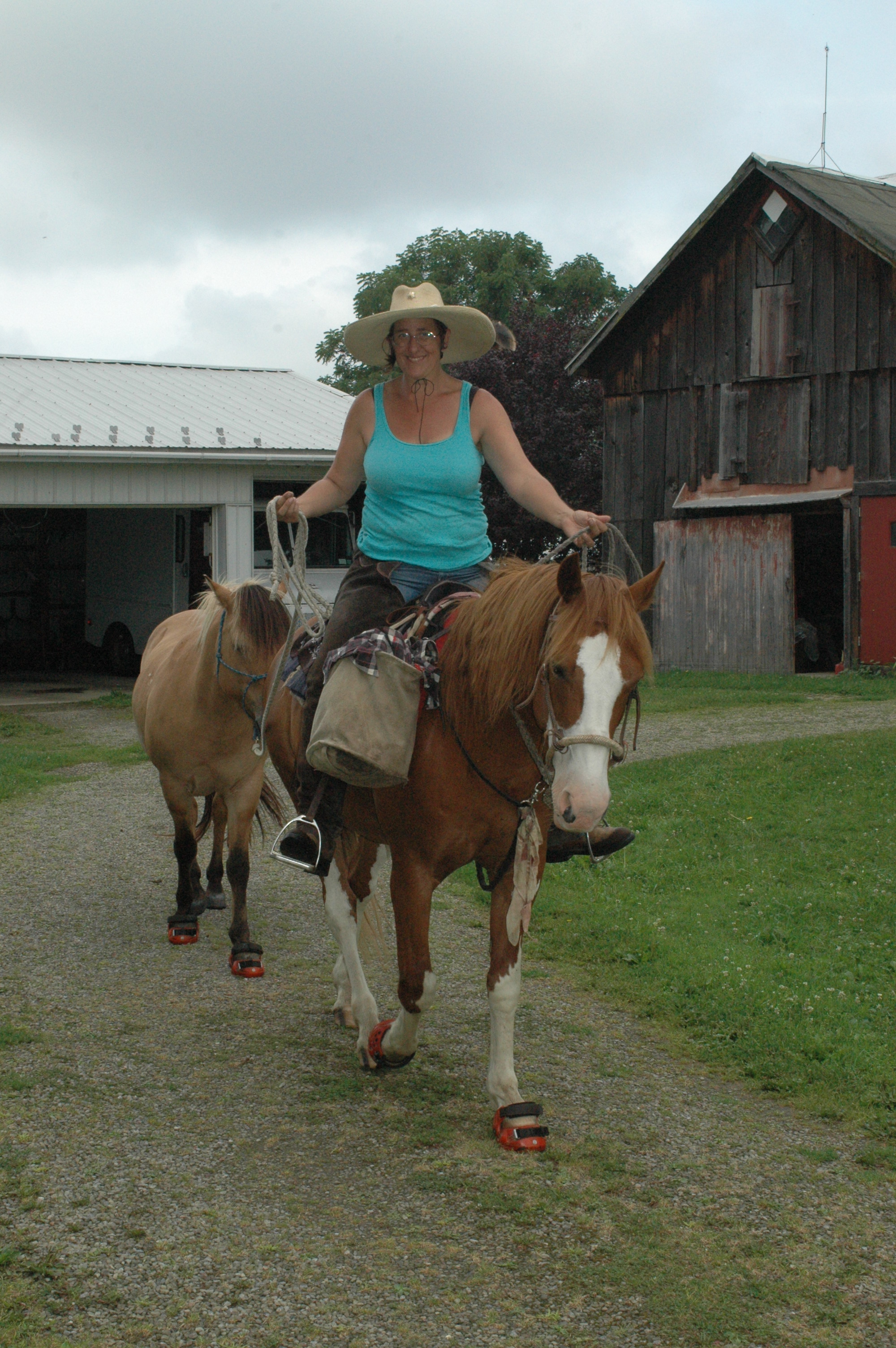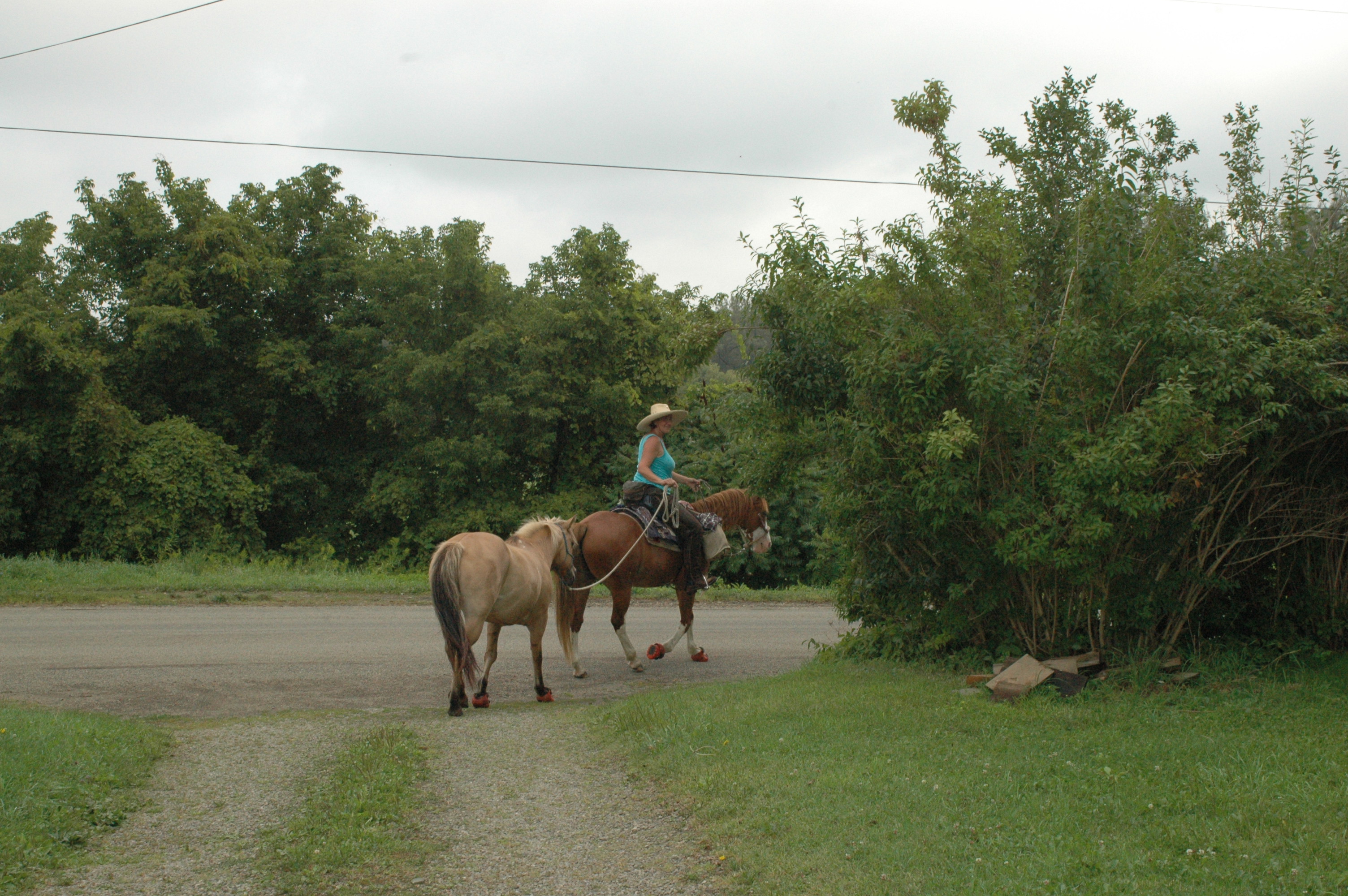 Mike took these as I was riding away from Hog Shed Pottery Studio where we enjoyed a day of comfortable accommodations and delicious, nutritious food.  Finehorn was delighted  to realize that the packs would be following via vehicle.  The recent rest days have had a positive effect on the herd and the Rhydr – increased enthusiasm and decreased grumpiness!  The apples growing on trees along the road with great frequency are helping as well – tho the Maple leaves are already starting to turn… DSC_8332 DSC_8333 DSC_8334 DSC_8335