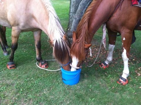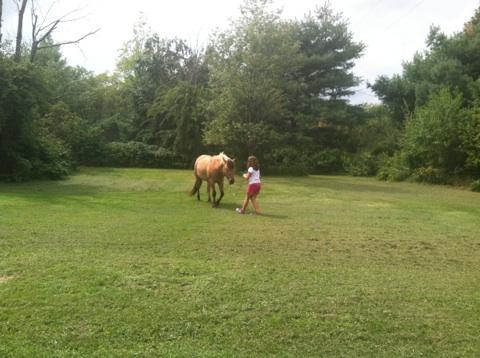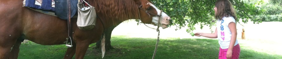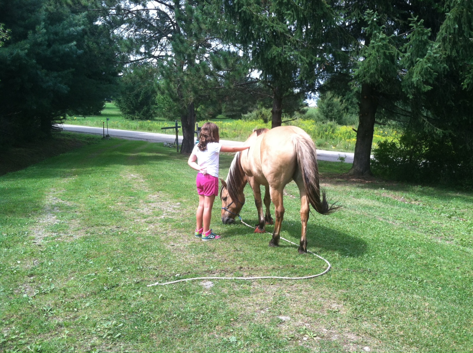 I was happily on my way to Houghton yesterday when I realized that I wasn’t where I thought I was! Hot and humid and an ambitious amount of miles to cover even without getting lost – I absolutely should have had my compass around my neck (and didn’t). I was passing a driveway when I heard a woman on a lawnmower calling into the house – “come out and look – horses!” I pulled into the driveway so the ponies could say hello – good call! Water and apples and graze and adoration for the ponies, lunch and a sorting of the maps for me. A&MJ, with whom I’d stayed the night before, had offered to bring some of their lovely hay (and the packs) to Houghton College for the ponies (we’re here for a long weekend and I’ll be talking to the “Adventure Trails” class on Tuesday afternoon) so I called them and let them know that I’d gotten lost, that we were 15 miles from Houghton at 2pm and the ponies were dragging. They hooked up their trailer and came to the rescue. Meanwhile Brandie was busy with her camera…