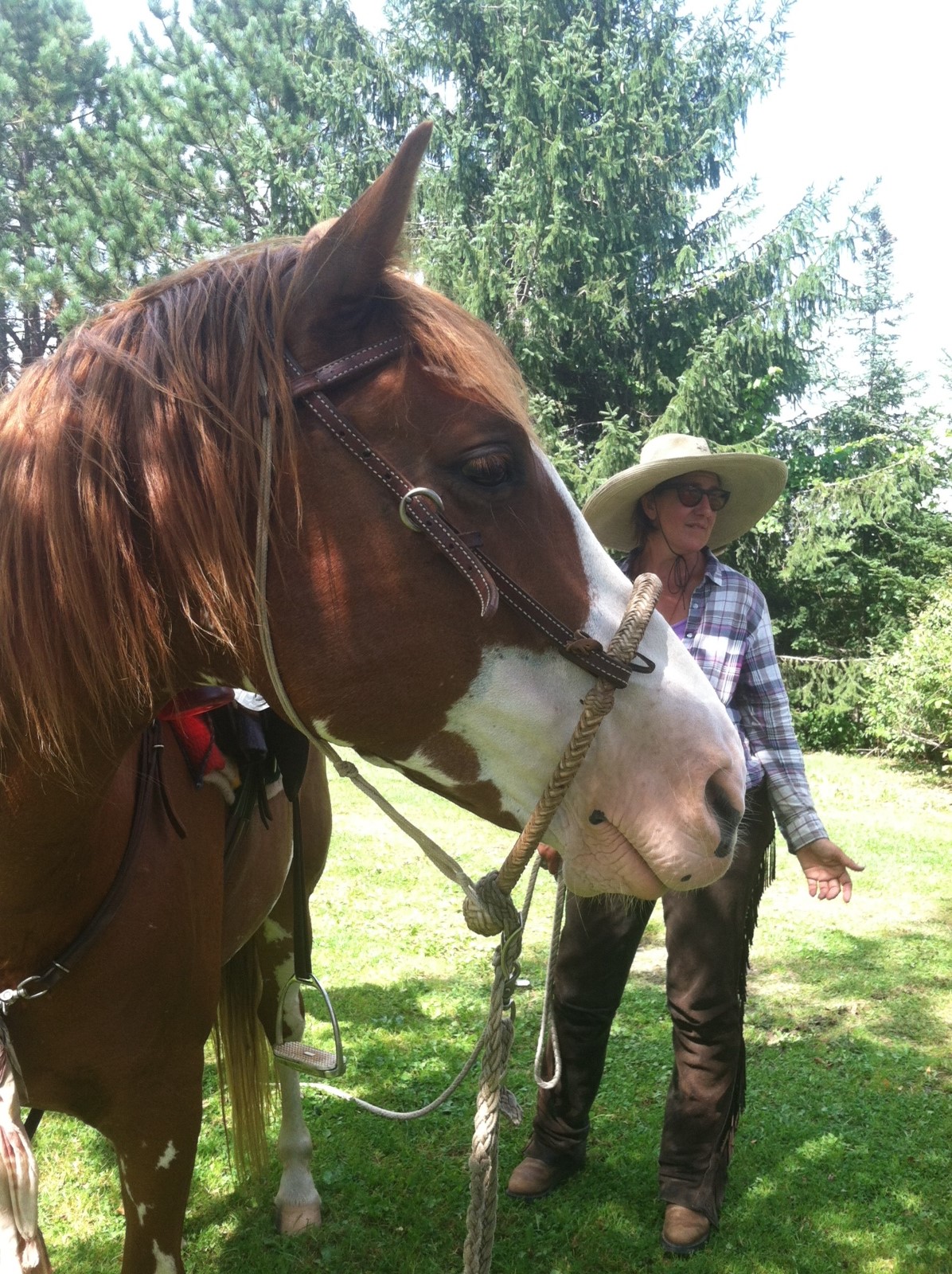 hi Sandra – that’s the same saddle Jesse and I have been using the whole ride – it’s the best fit I found for him and it’s super comfy for me too – narrow through the twist and not restrictive. The only down side is the lack of a saddle horn in terms of ponying Finehorn, but lately she’s been pretty good about just following along (except for when the horseflies are getting her – can’t blame her for that, but it does a number on my right shoulder!)