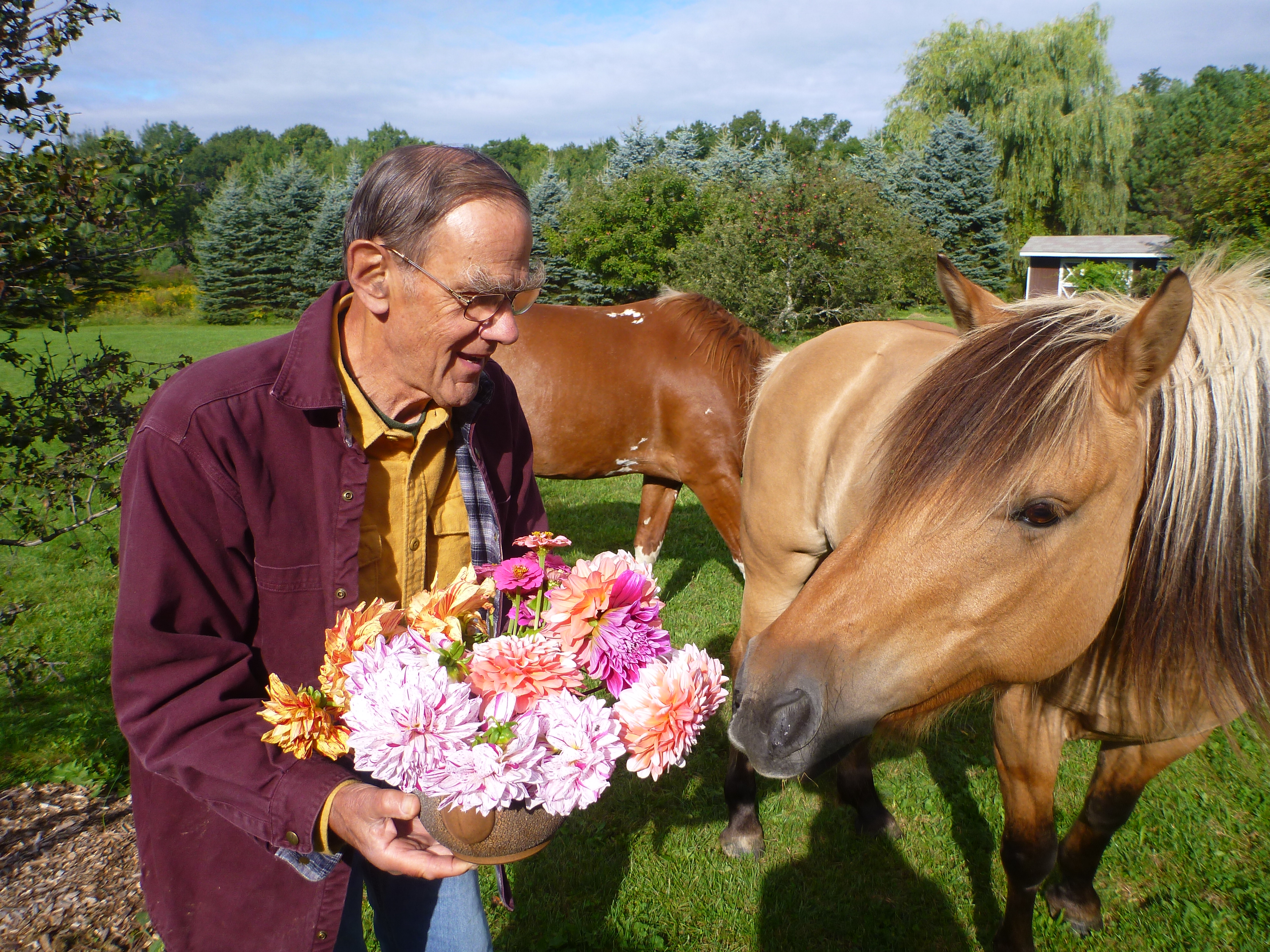 New York is having a bumper crop of apples this year!  When the ponies first discovered the apple trees along the trail they’d stop for a snack and not want to leave the tree.  They soon discovered that there was a seemingly endless supply of such trees strung along our route and were soon quite content to grab and go.  The first night we were in a situation where there was to way to let them graze without access to unlimited amounts of apples I was quite concerned and kept a close eye on them.  Clever ponies, they ate a reasonable amount of apples, then proceeded to graze on the grass and clover, occasionally returning to grab a few apples, then back to the grass.  They were fine in the morning and I stopped worrying about them quite so much.  At my parents’ house there are three apple trees, many flowers, grass and hay – and there were sunflowers.  The ponies started eating the apples from the ground up and by Wednesday afternoon my nephews went up the trees to throw a bunch of unreachable apples down since the ponies had eaten as high as they could.  They’re ignoring the hay for the most part and only get into the flower beds when they’re bored and wanting attention.  The sunflowers didn’t stand a chance.