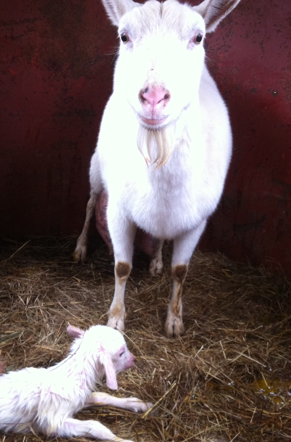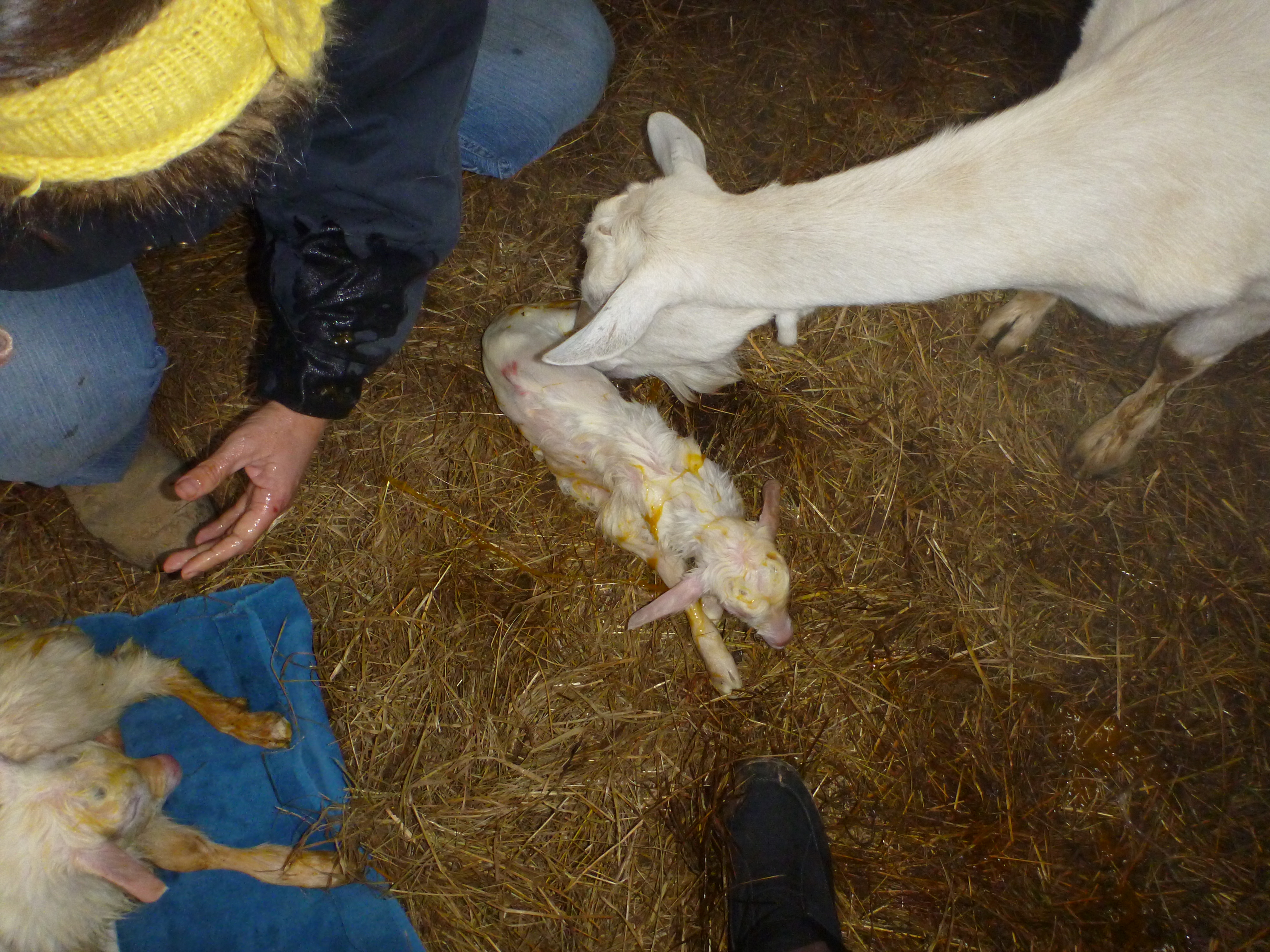 Yesterday the big news was snow in Big Creek and the arrival of Angi from Ontario. This morning I went out to feed and there was another arrival, this one a week earlier than anticipated – Mama Pearl was standing in the trailer looking down at her brand new kid. I was So grateful for Angi’s presence in that moment, not that she’d ever midwifed a baby goat before, but she stayed very calm and we got the baby cleaned up just in time to realize that Pearl was trying to have kid #2 through the trailer wall. That obviously wasn’t happening so she stood up and without so much as a chance to wash my hands I was catching a baby goat, who lingered half-in and half-out for what seemed like the longest, slippery time before Pearl got around to finishing the job. All of this in below-freezing dampness and caught unprepared!
