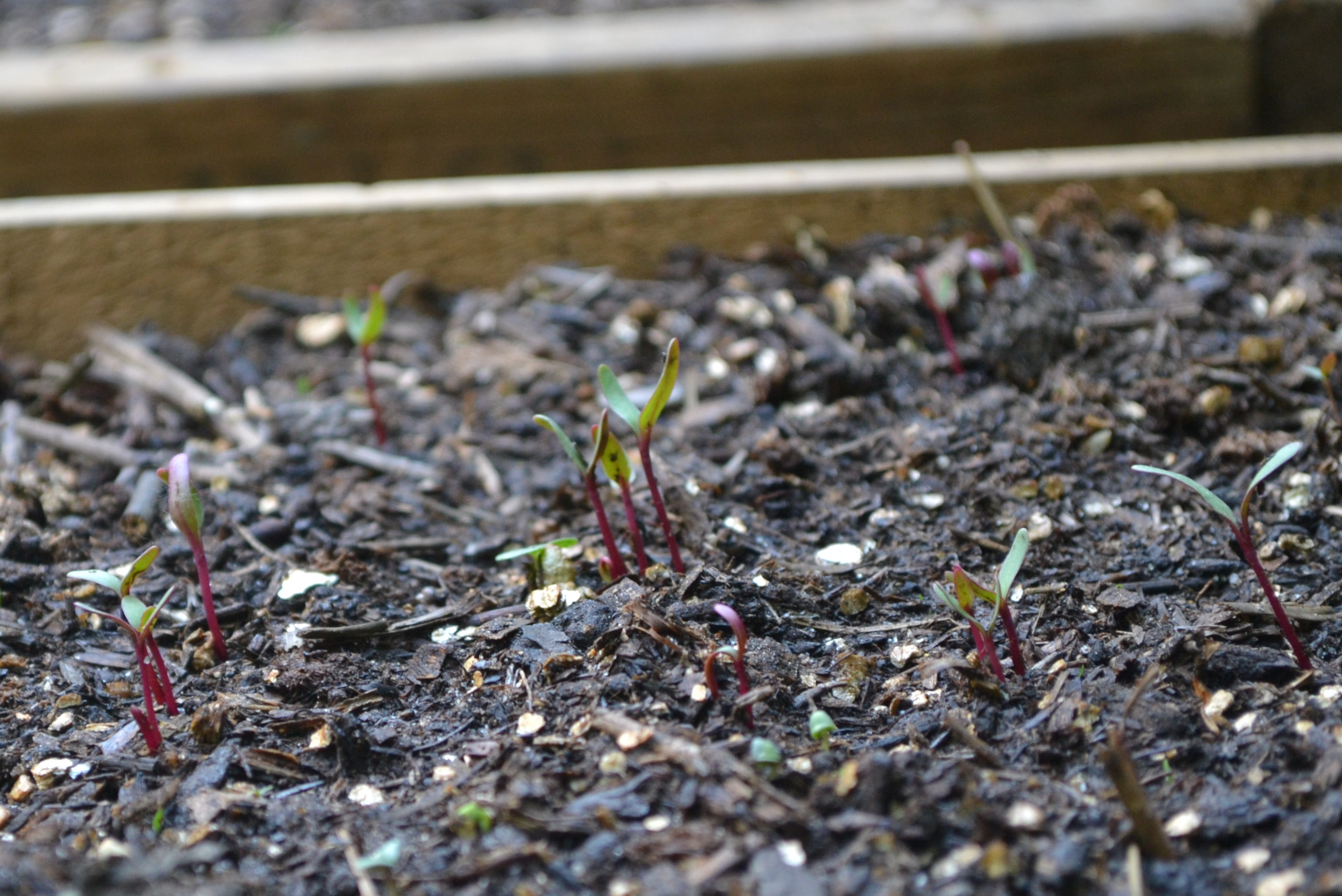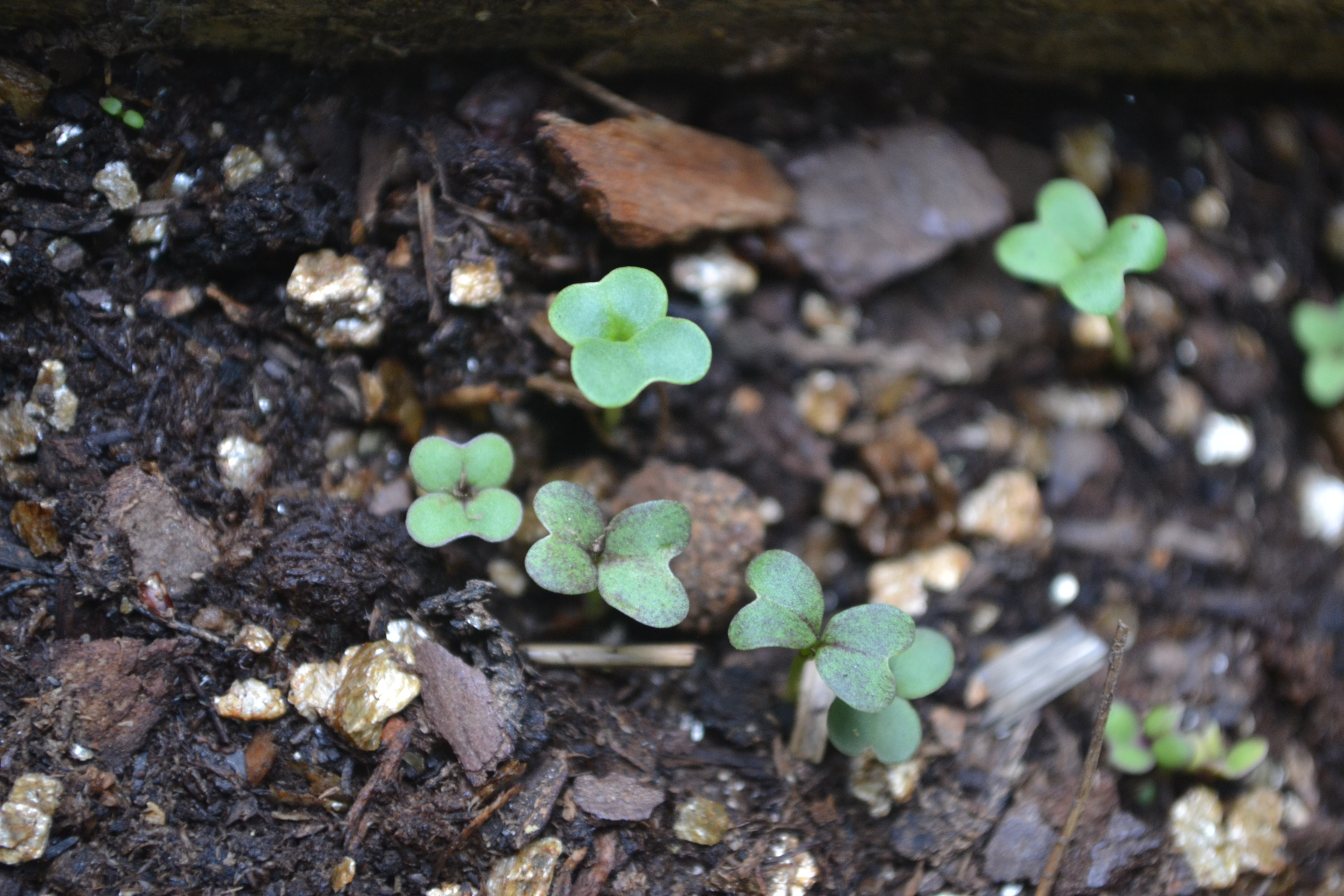 A week ago Wednesday I collected all sorts of random wooden boxes and metal tubs that I found in the house.  Saint George drilled holes in the bottoms as necessary and I filled them with the stuff plants love to grow in.  I planted parsnips and turnips and carrots and radishes, oregano and thyme and lemon balm, seven different kinds of basil, more greens.  I prayed.  I watered.  I hovered.  I waited.  I didn’t wait long, actually – since by that Friday morning I started seeing sprouts!  I have yet to see evidence of carrots or cilantro, but most everything else has at least one representative poking above the soil.  Excitement!!!