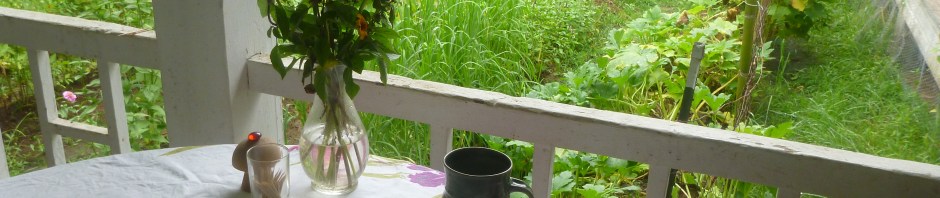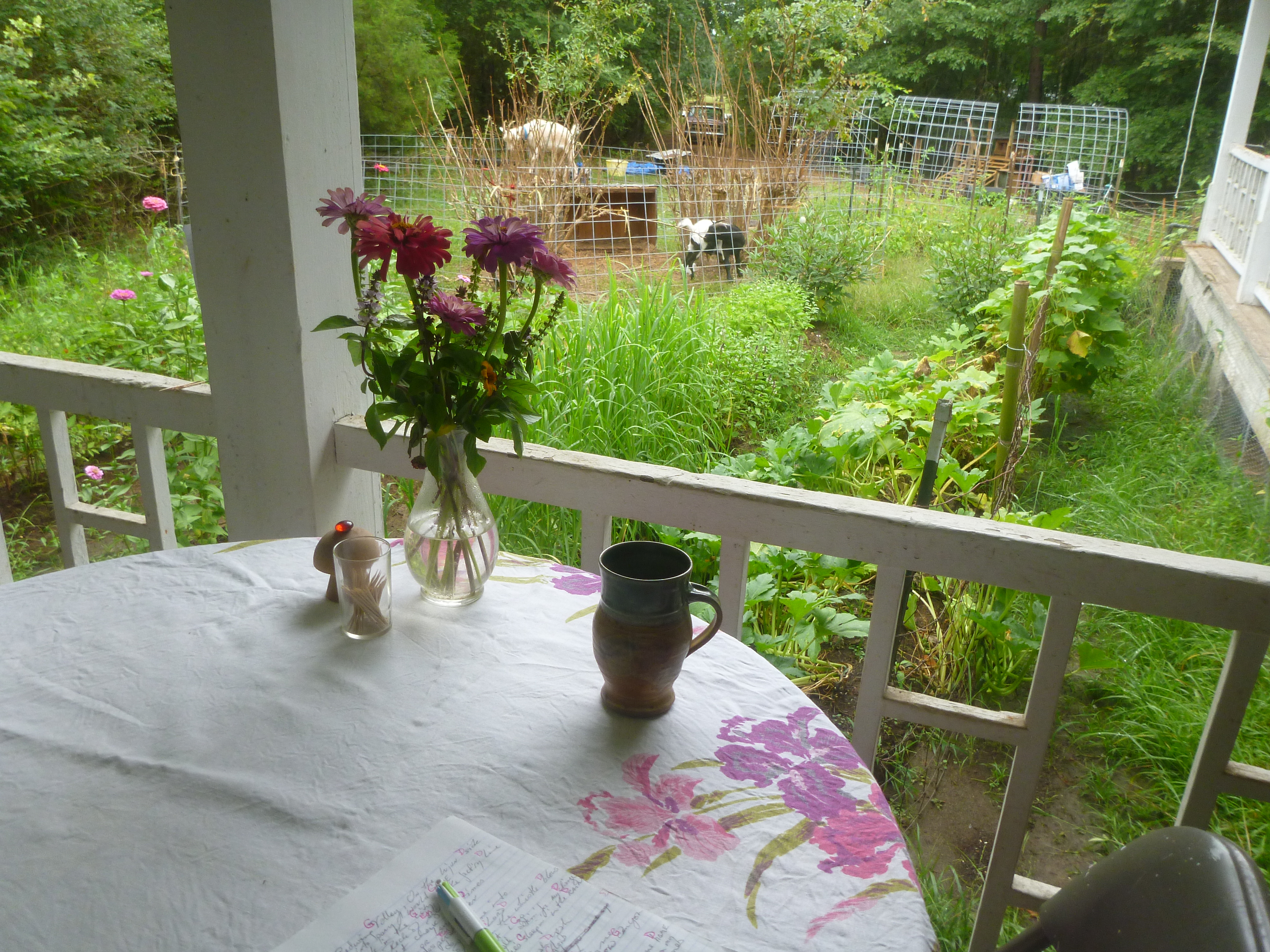 So then it was Sunday and I was out of excuses. I wrote the dream on an index card and pinned it to the porch railing. With the encouragement of my cohorts I set up a wee cafe’ on the front porch and I’ve been going there every day since. As small as it sounds I’m aiming for “at least” 500 words a day and I’ve been doing it. Not every day’s writing is brilliant, not every day’s writing is aimed at “the book” because that’s not the point. The point, as far as I can suss it out from here, is that the only way to get better at writing is to write and keep writing, because that’s what writers do. And they do it even when there are other things to be done. They do it even when they’re not in the mood. And e-mails don’t count, although today’s blog post does – because I spent the morning on editing and re-writes (after working with Gryph to restore and reseed some of the lettuce pallets.)
