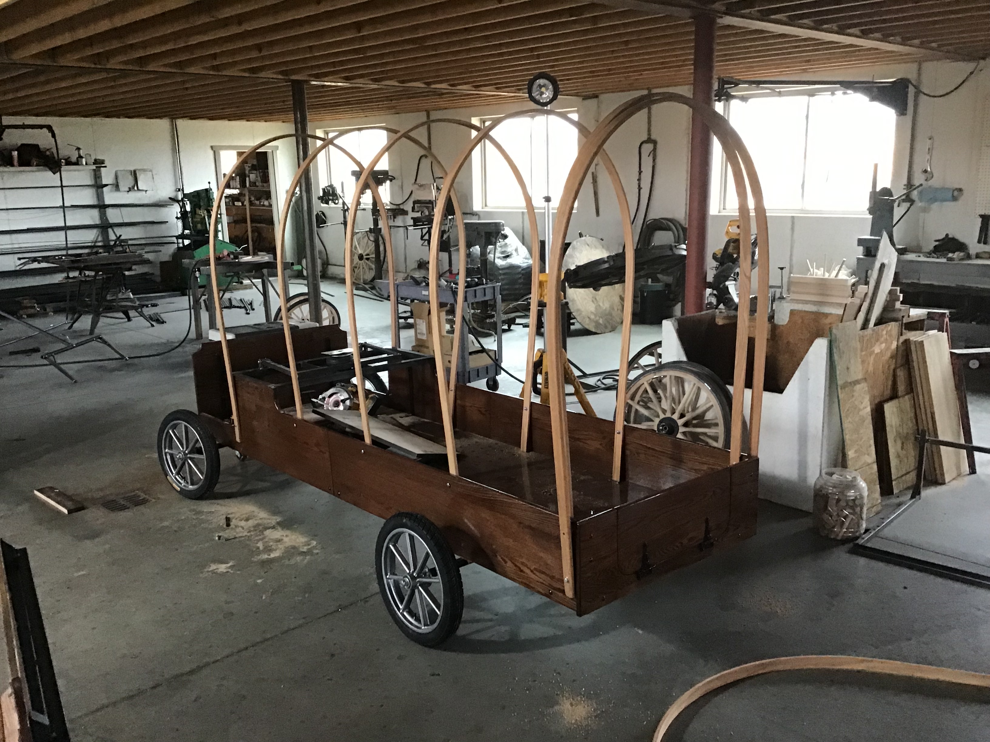 If you look at the picture, you can see that the front and back bows are double – this is so that the canvas top can be extended at night to surround the entire front of the wagon and provide a small “alcove” in the back behind the bed of the wagon (dressing room, bad weather cooking area, space for my chamber pot at night.) The circle in the middle of the seat is an air bag suspension system – and the seat lifts up to reveal a storage area.