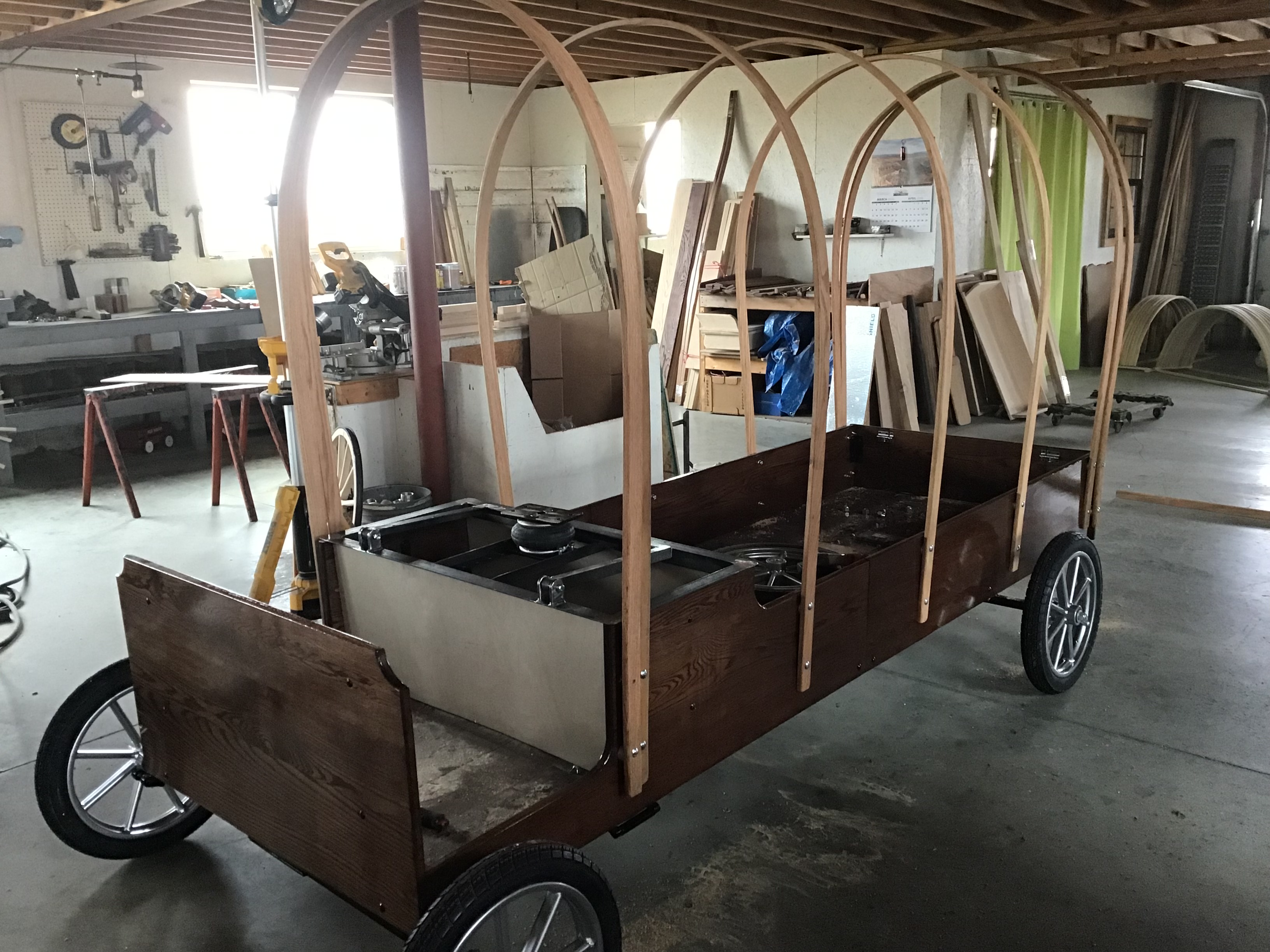 Designing the wagon with Mel of Pequea Carriage is seriously the most fun I’ve had in a long time. Starting with a dream and some basic parameters, function and aesthetics have guided each detail of the form and Mel has connected me with other craftsmen as needed to bring this project to fruition. We’ve been figuring out how to build in storage and work spaces and day/night versatility, while keeping the whole thing within the weight limit of what the ponies can handle, all while keeping an eye on balance and safety going down the road. While not every one of my ideas has been practical or possible, we’ve usually been able to figure out a work-around to accomplish the same goal.
