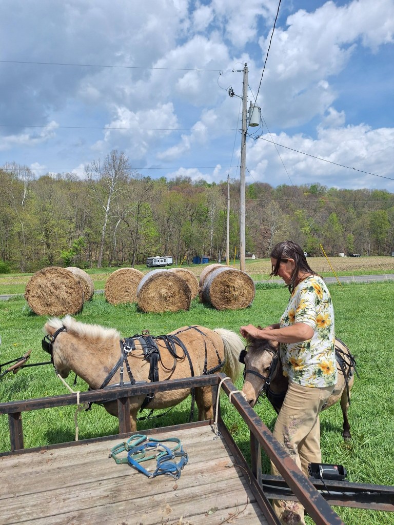 Michelle stuck with us as this time the ponies went up the drive and around the lot and as we were getting ready to follow her home she noticed that the connector at the front of the team pole was broken. I took it super easy the last mile to her place, got the ponies into her front field with a huge sign of relief and gave myself a moment to feel the adrenaline rushing out of my body, leaving me limp. The plan had been another mile to a camp down by a river, but considering that the single pole now needed and appointment with a welder (Michelle’s uncle turns out to be a welder!) I unharnessed the ponies, tucked them into a pasture, Michelle’s dad unbolted the pole from the wagon and put it in the back of his truck. I was seriously rattled, but Michelle and her family were welcoming, friendly, helpful, curious – and soon enough we had the wagon tucked in behind a line of round bales, pointed in the correct direction for morning, and I had 3 “Who Is My Neighbor?” interviews scheduled for the morning.