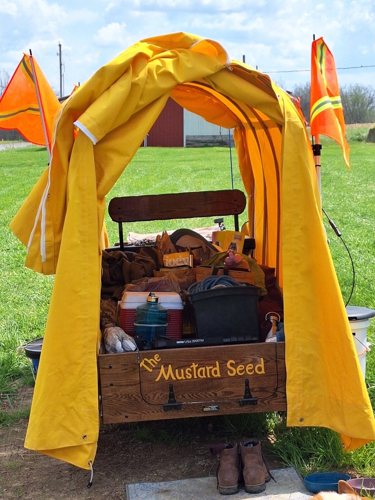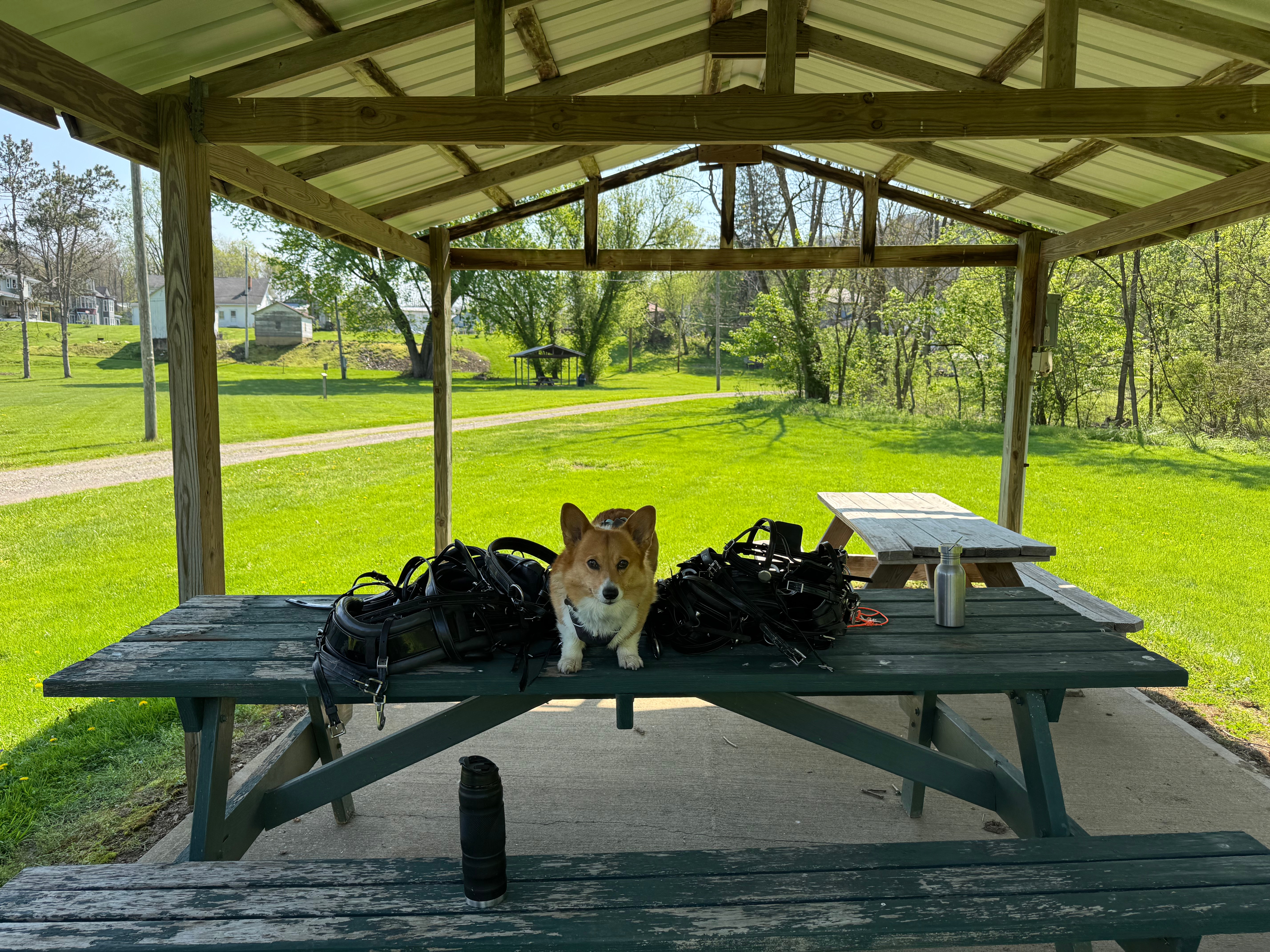 Nobody at the park to hold the ponies while I unhitched (something we still need a bit of help with) and so I pulled up to the pavillion, tied the ponies to a post, a little drama but within 15 minutes they were happily grazing on their tethers and I was able to roll the wagon back to a flat area near the road and get things set up for evening. Rain was forecast so I stashed the harnesses and the boot box under shelter and tucked in for the night. At 10:30 I woke to headlights, a car, male voices (perhaps a little intoxicated?) and people crossing the lawn towards the ponies. I stuck my head out of the canvas and said “Hello.” “Are those horses!?” “They’re ponies, they pull my wagon.” And somehow this was enough and they apologized, got back in their car and left.